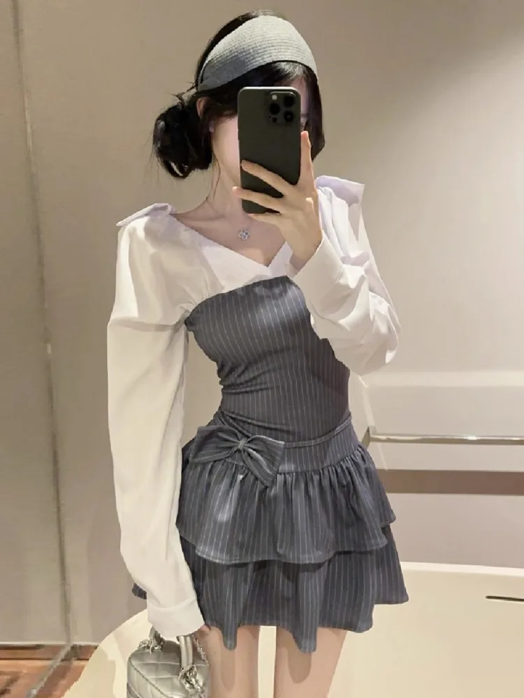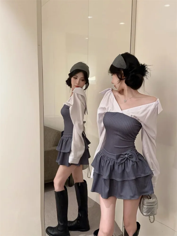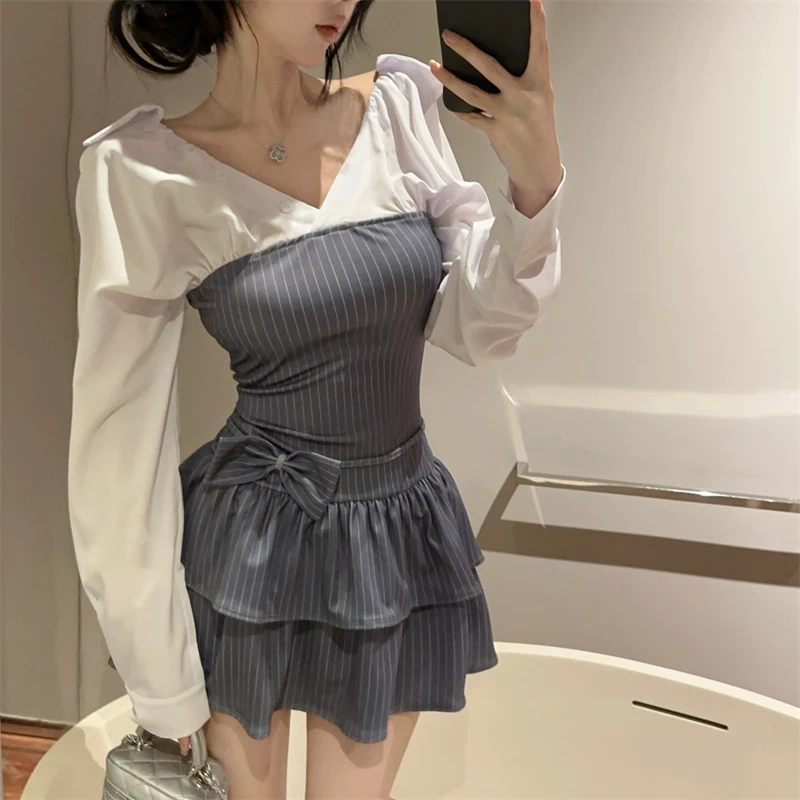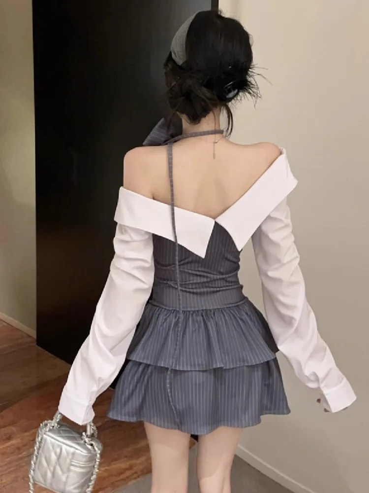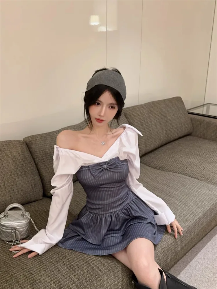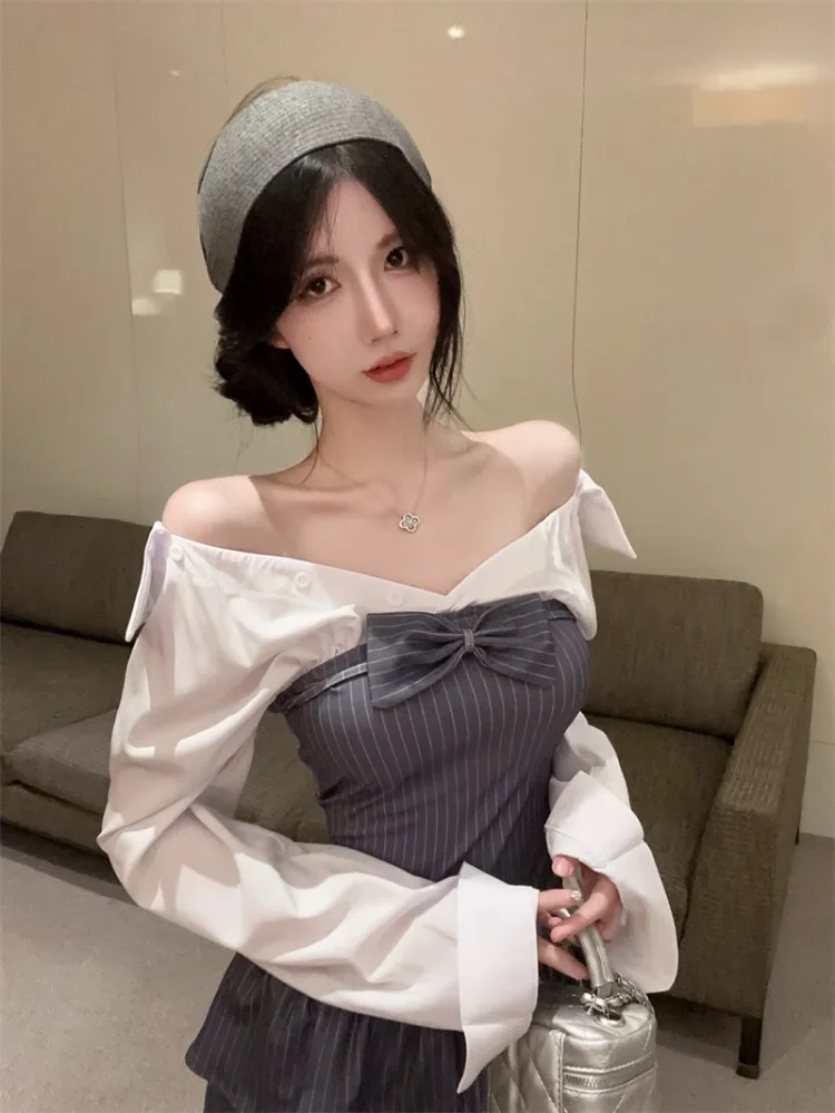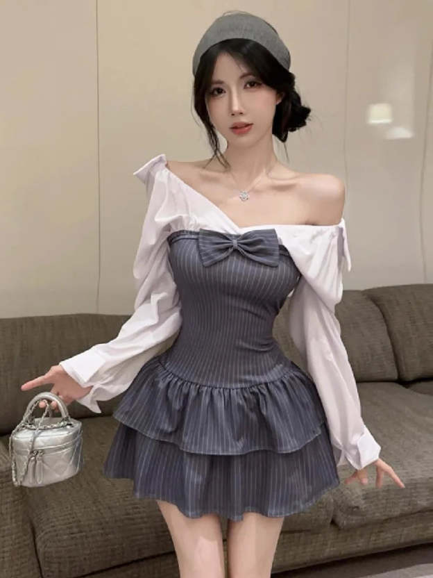 Mini Dresses Women Patchwork Bow Slim Slash Neck Long Sleeve Patchwork Fashion Sexy Elegant Party Dress Ladies Elegant