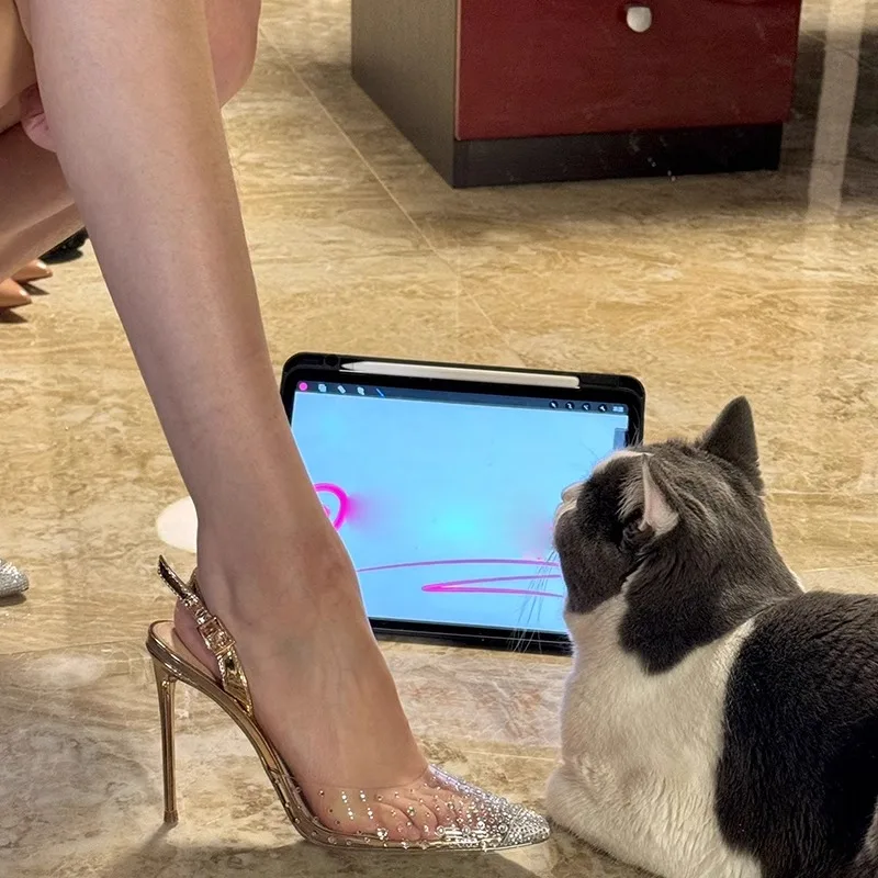 Rhinestone Transparent Pvc High Heels Sexy Gold Pointed Toe Shallow Buckle Strap Stiletto Sandals Women Back Strap Shoes