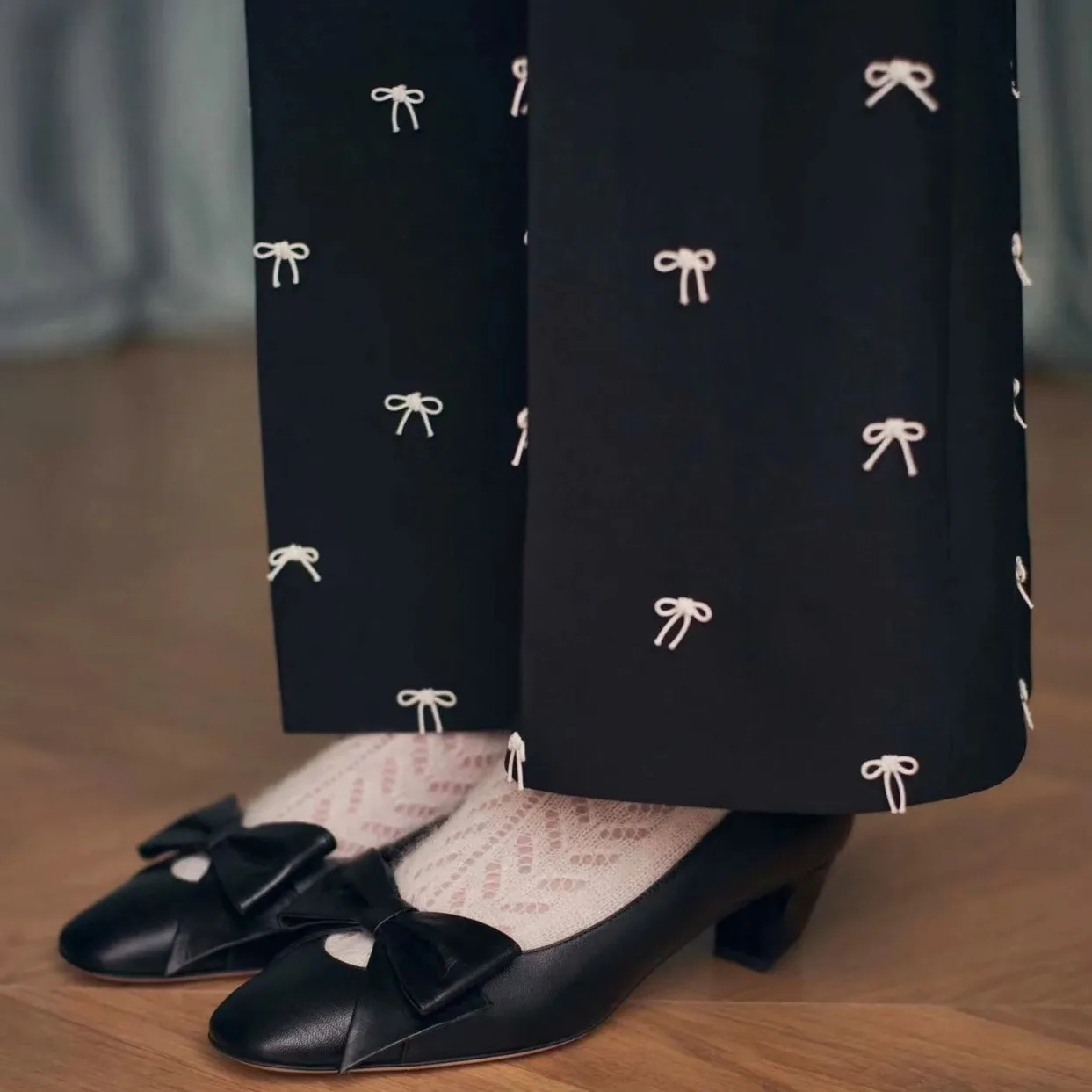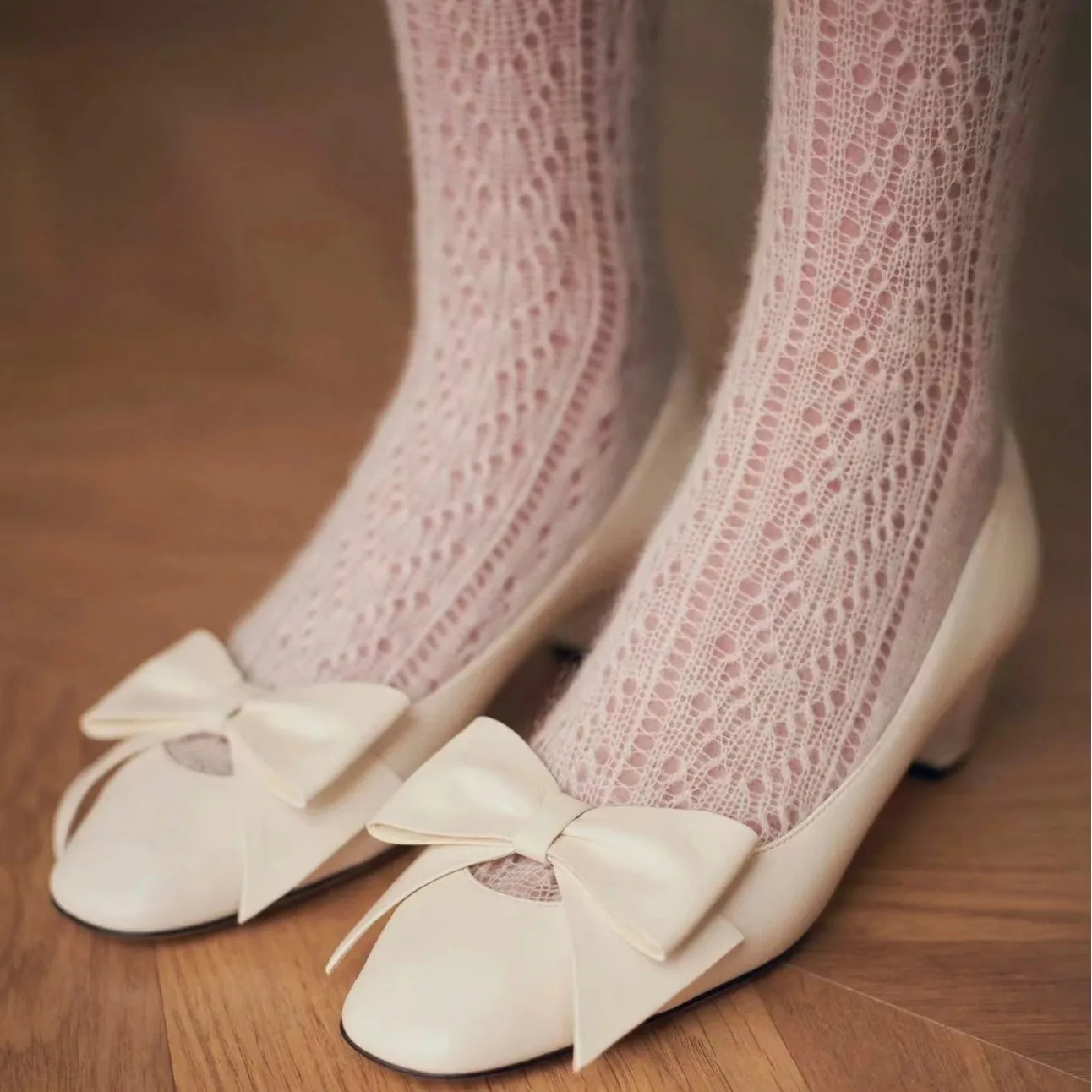 KYLETHOMASW - Round Toe Bow Decor Pumps Block Low Heels Slip On Hollow Sweet Ladies Dress Daily Casual Shoes Party Elegant Design Sandals