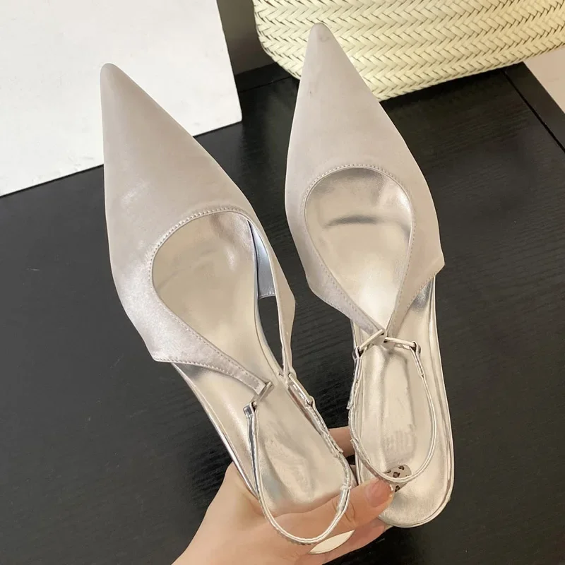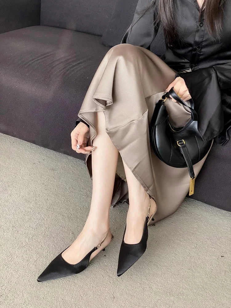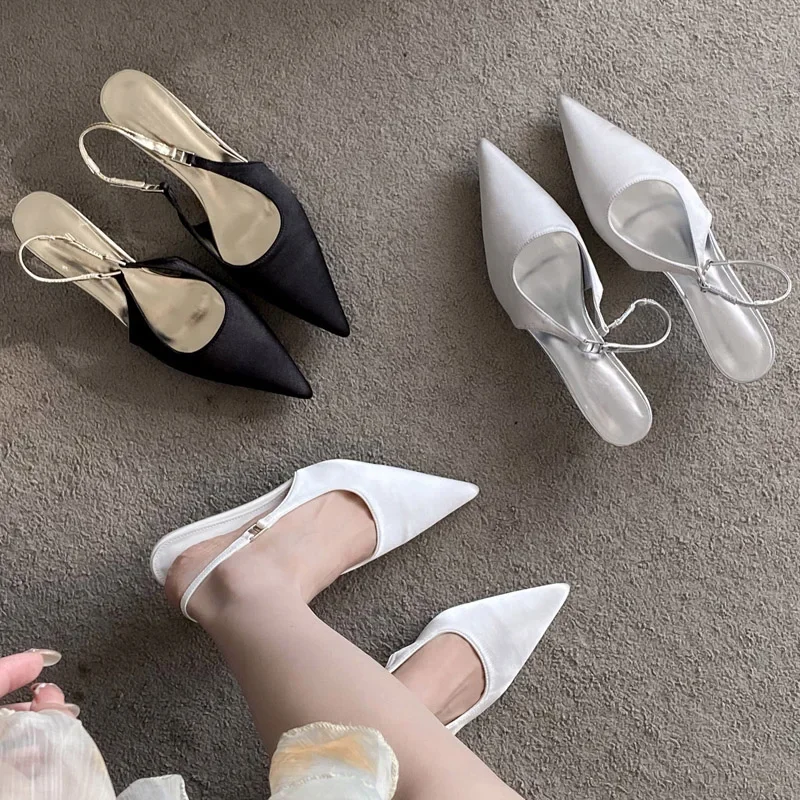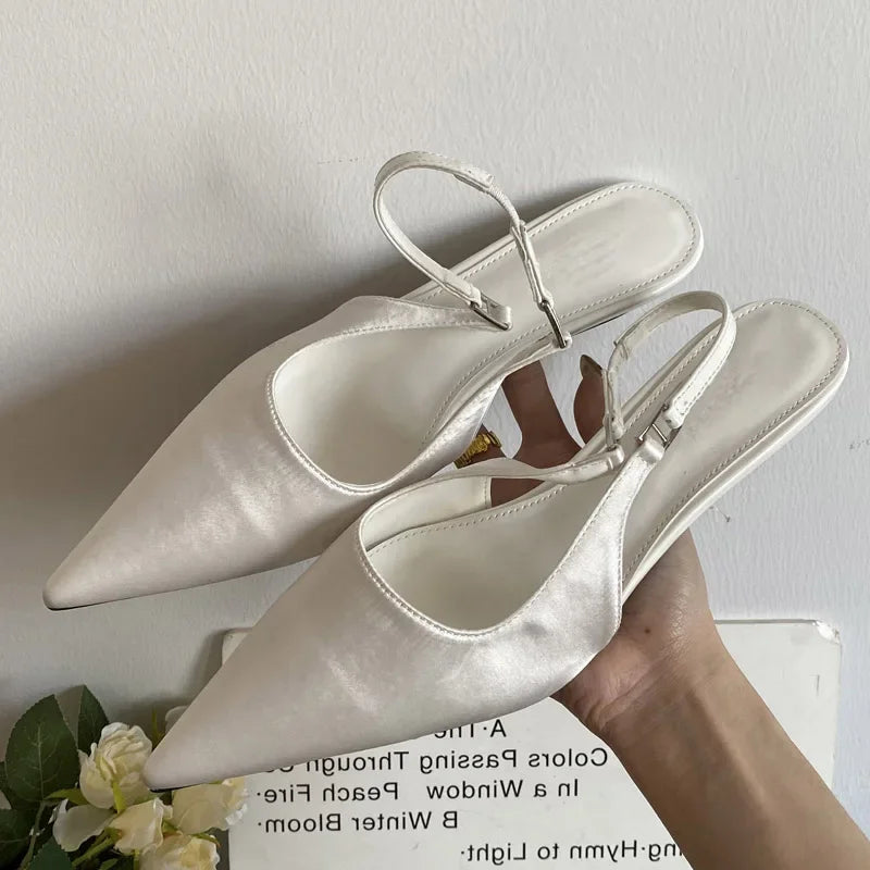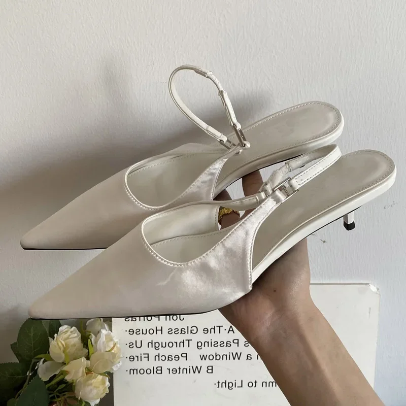 KYLETHOMASW - Satin Pointed Toe Mules Women Pumps Sandals 2025 Spring High Quality Shallow Thin Low Heels Female Shoes