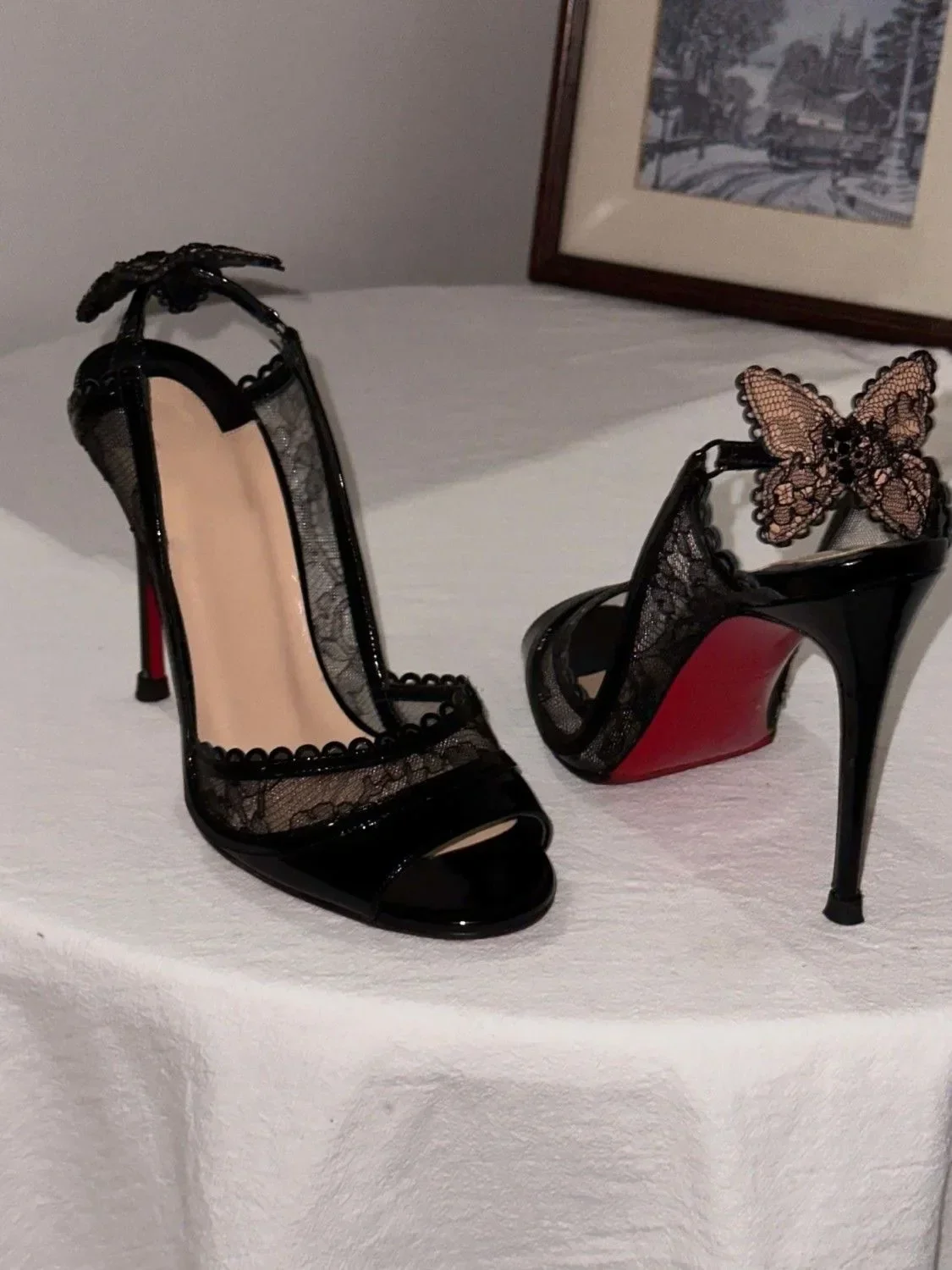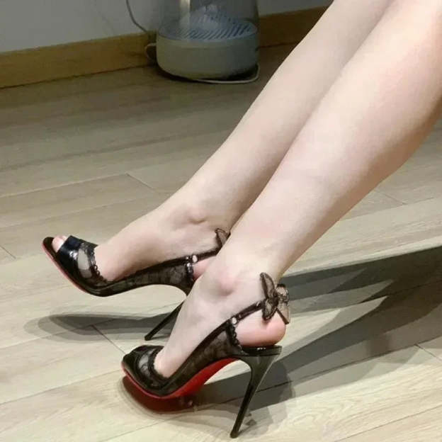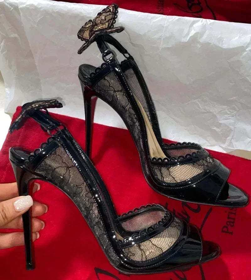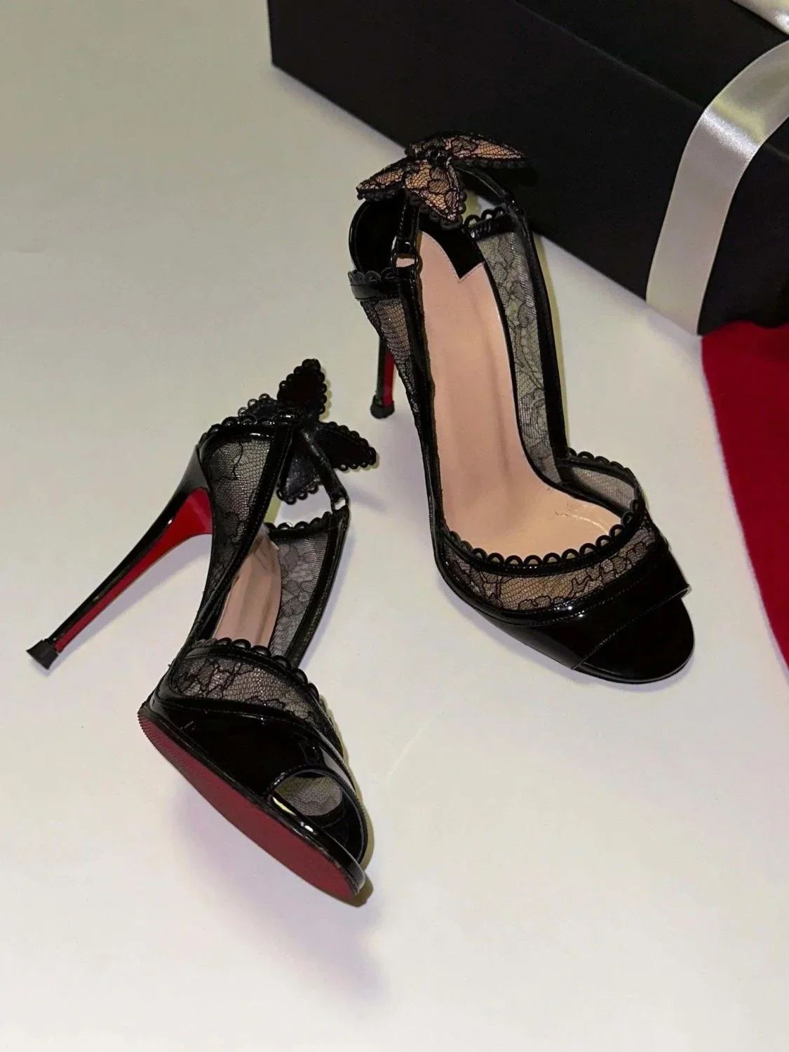 KYLETHOMASW - Sexy Cutout Lace Bowknot Women Pumps Summer Peep Toe Slingback Sandals Thin High Heels Black Patent Leather Party Wedding Shoes