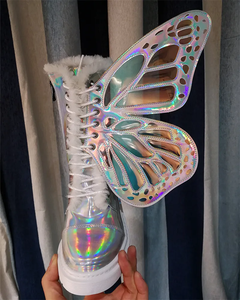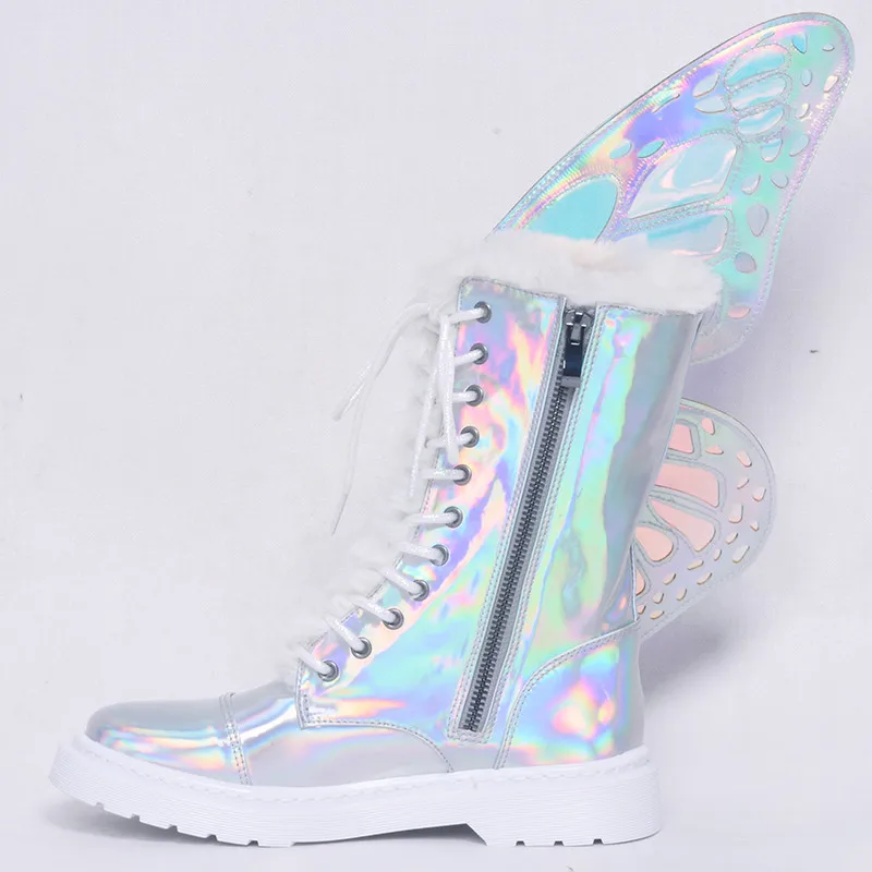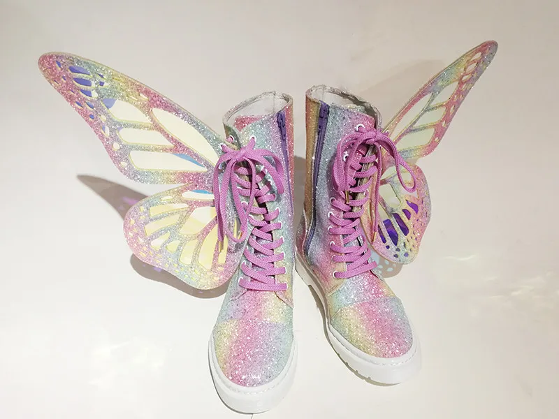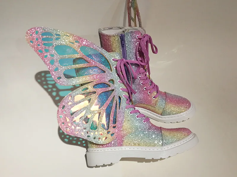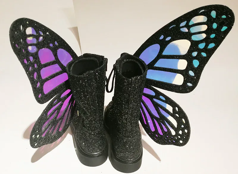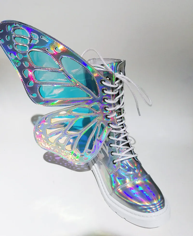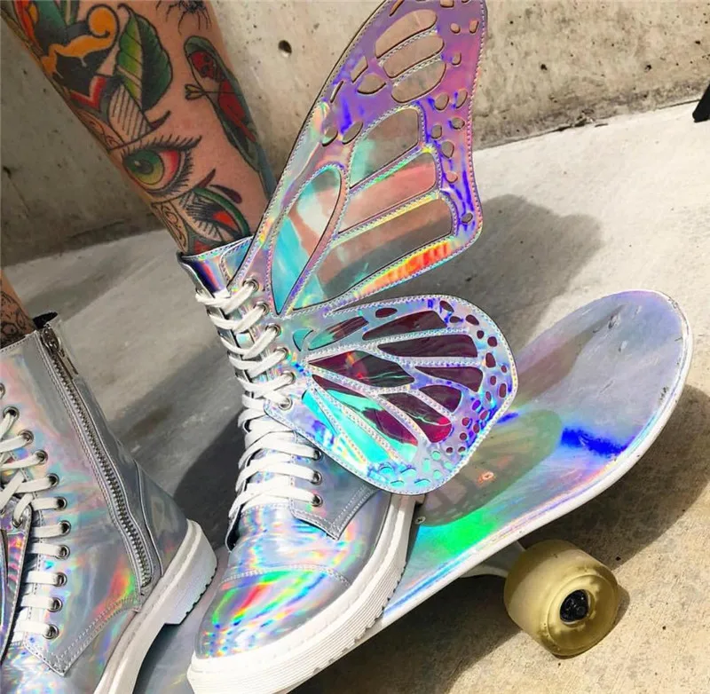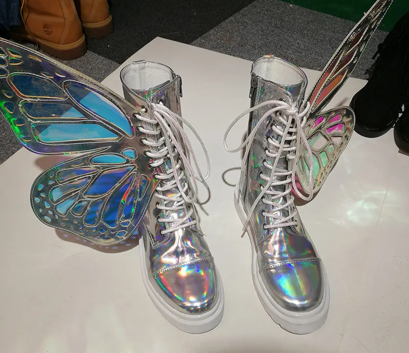 Kylethomasw Shine Silver Real Leather Flat Sneakers Butterfly Wings Women Shoes Lace Up Women's Ankle Boots High-top Leisure Platform Shoes