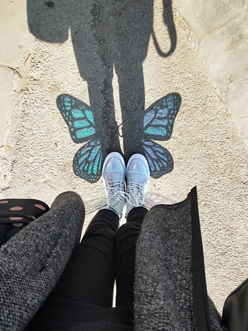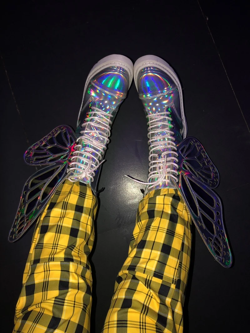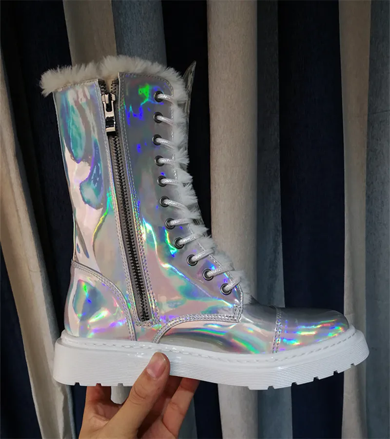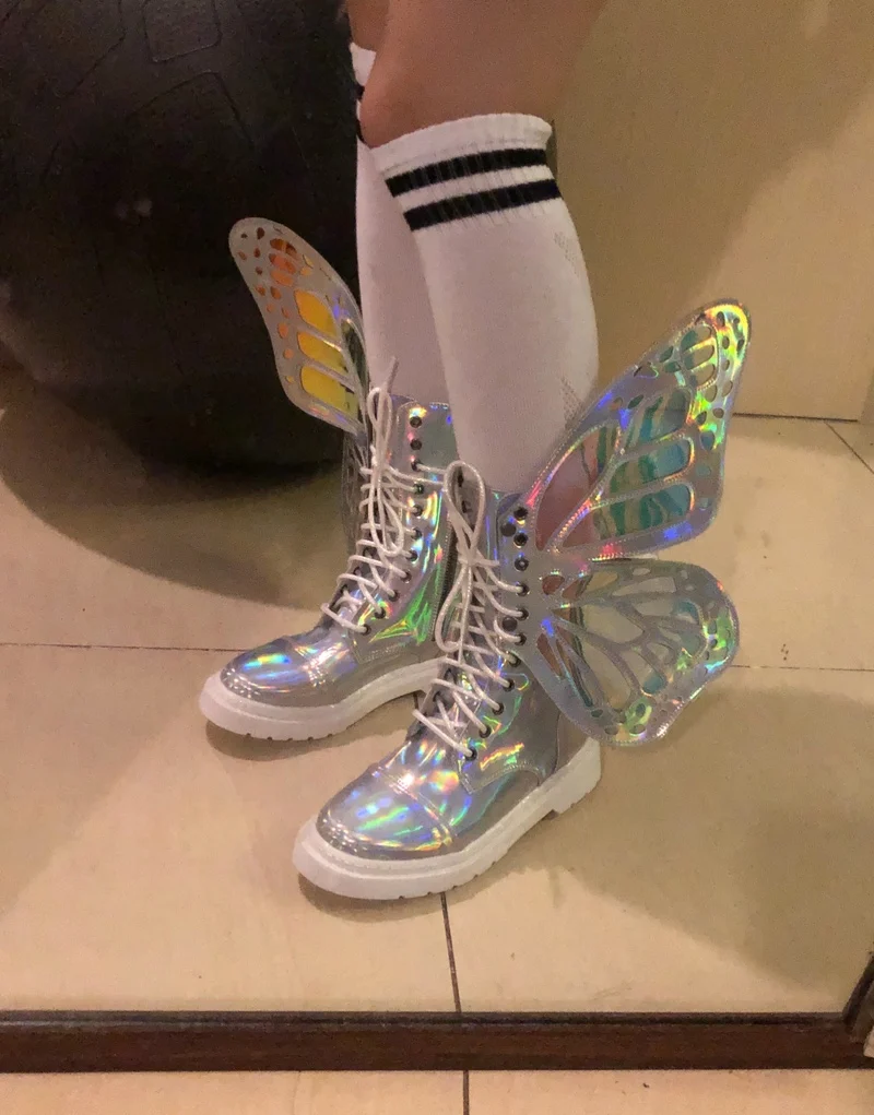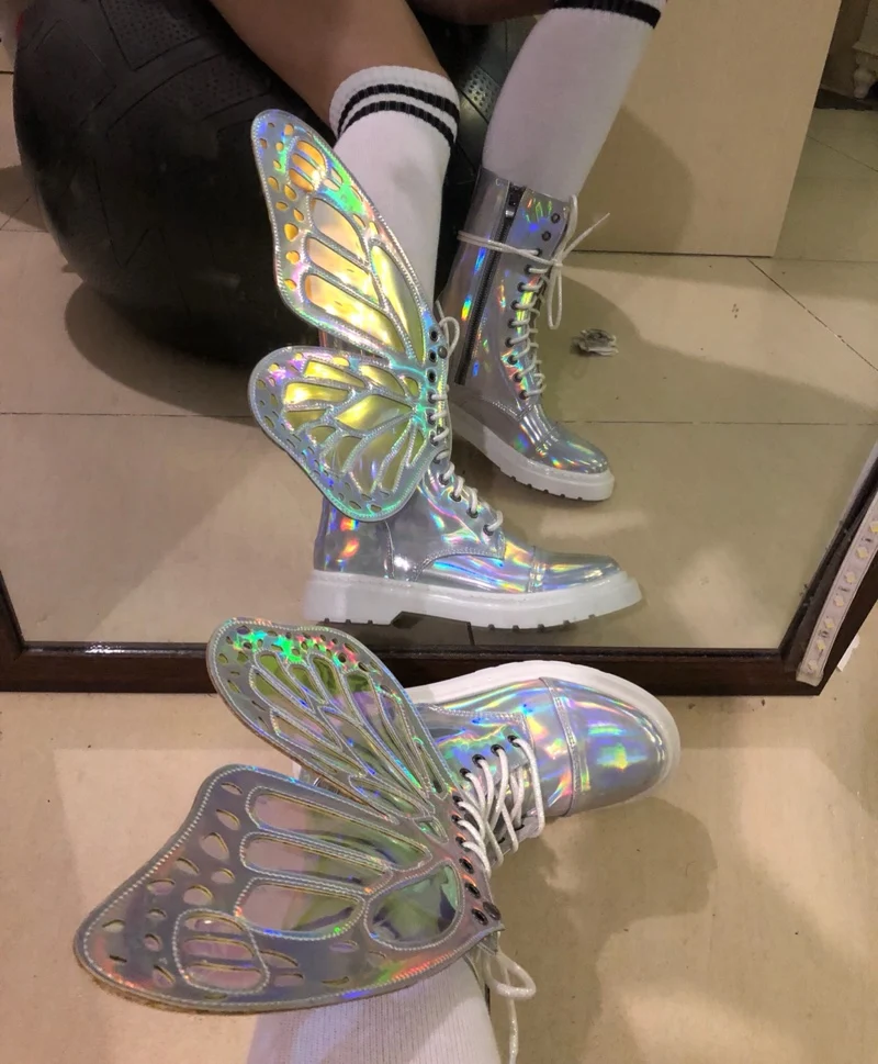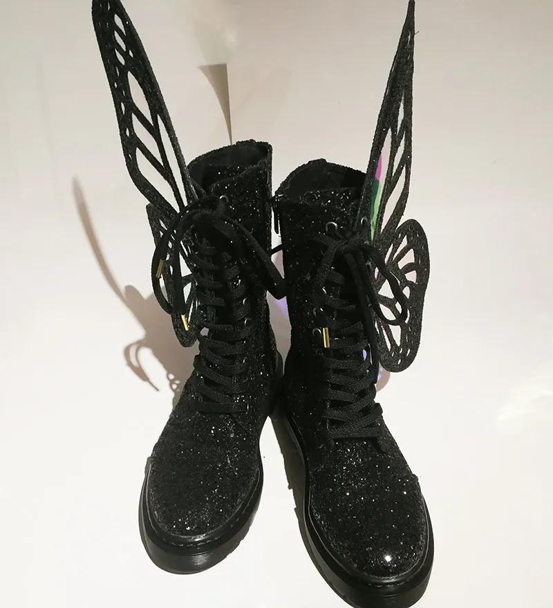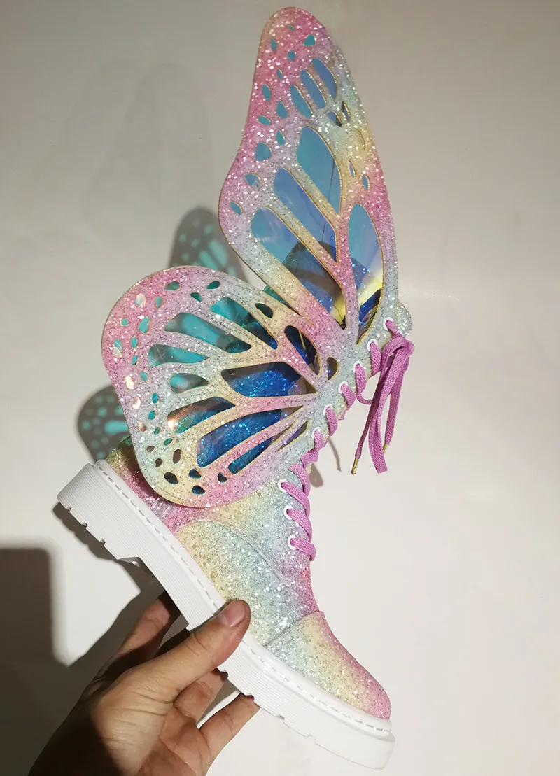 Kylethomasw Shine Silver Real Leather Flat Sneakers Butterfly Wings Women Shoes Lace Up Women's Ankle Boots High-top Leisure Platform Shoes