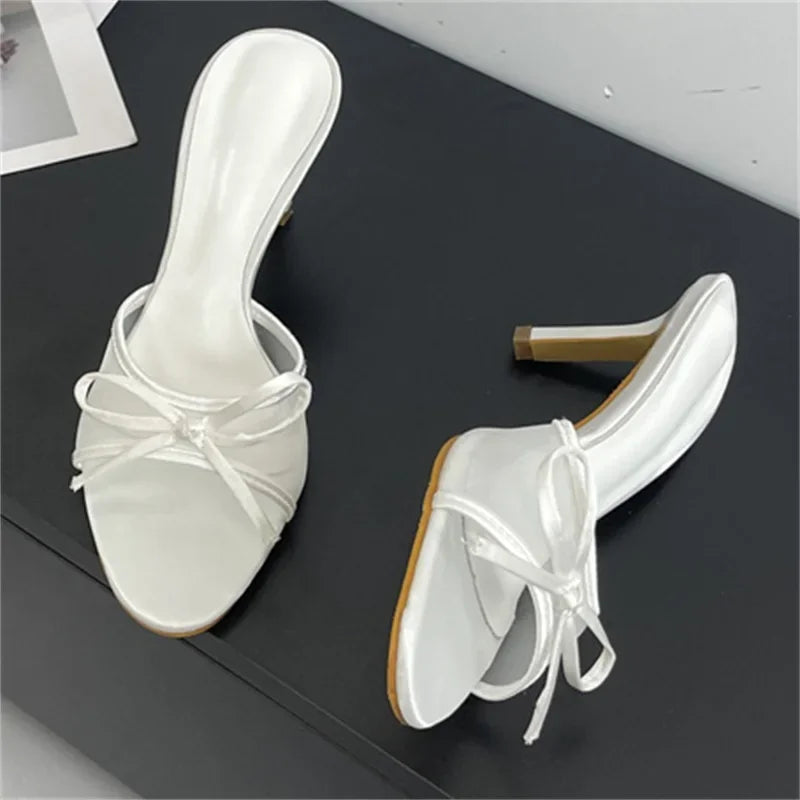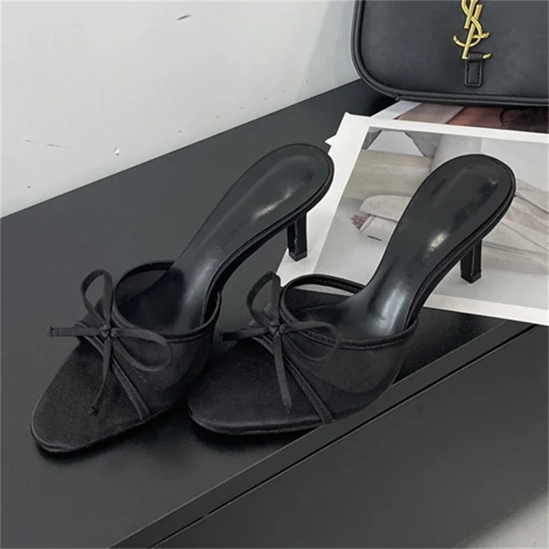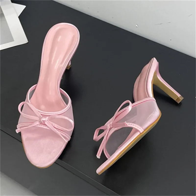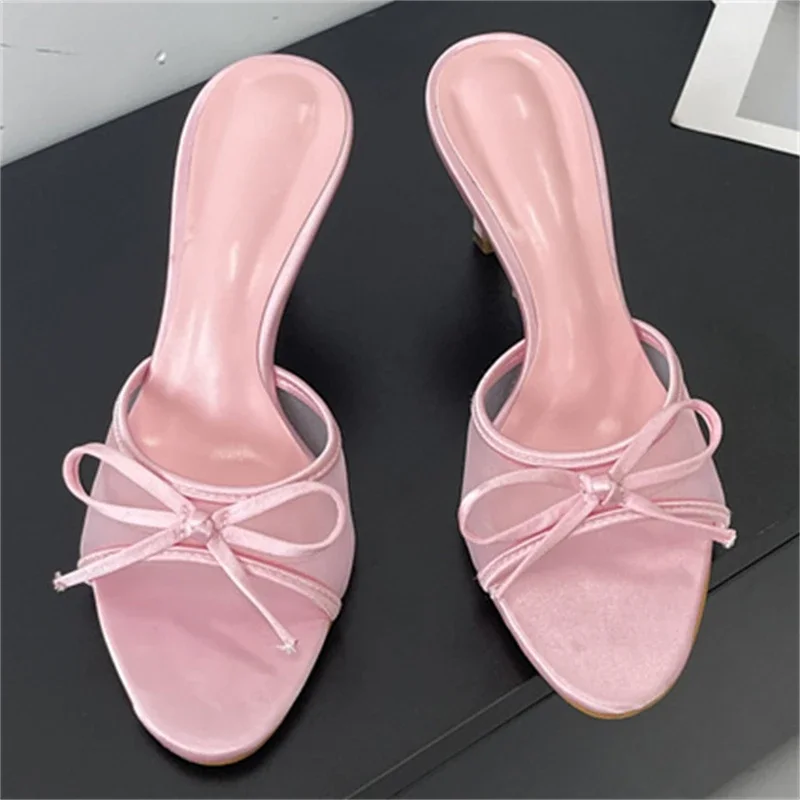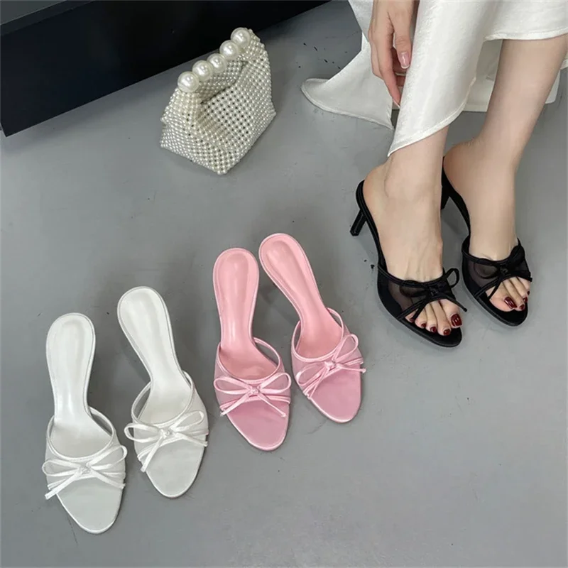 KYLETHOMASW - Summer Fashion Butterfly-knot Breathable Holes Mesh Open Toe Woman Slippers Thin High Heels Party Dress Shoes