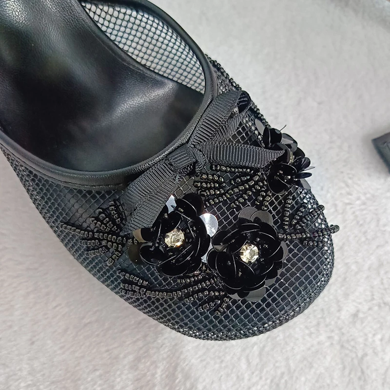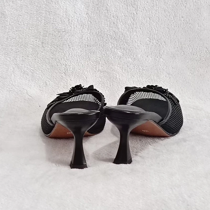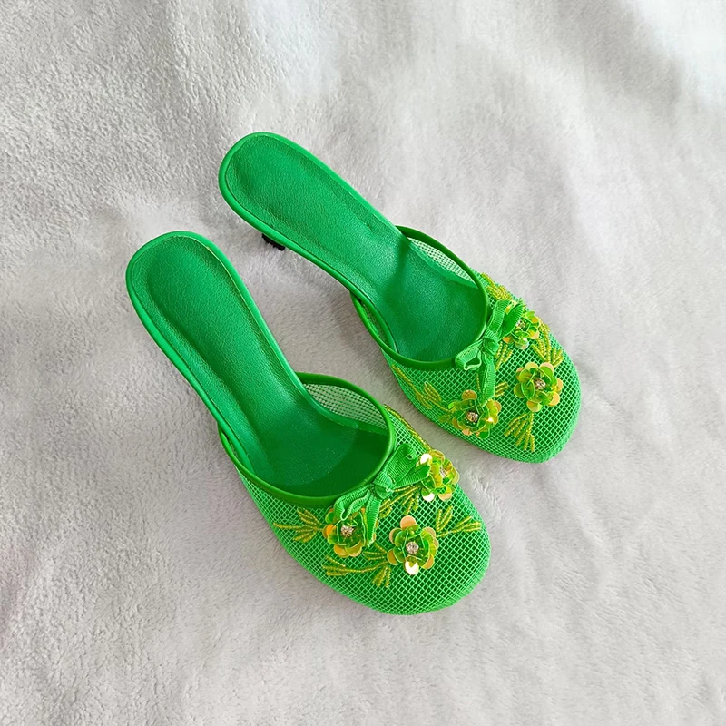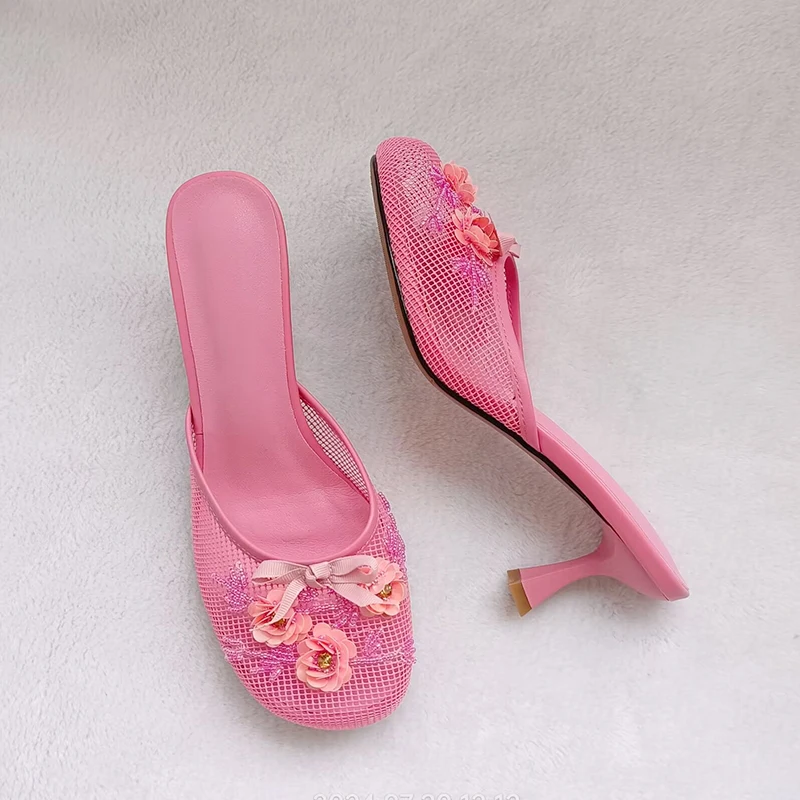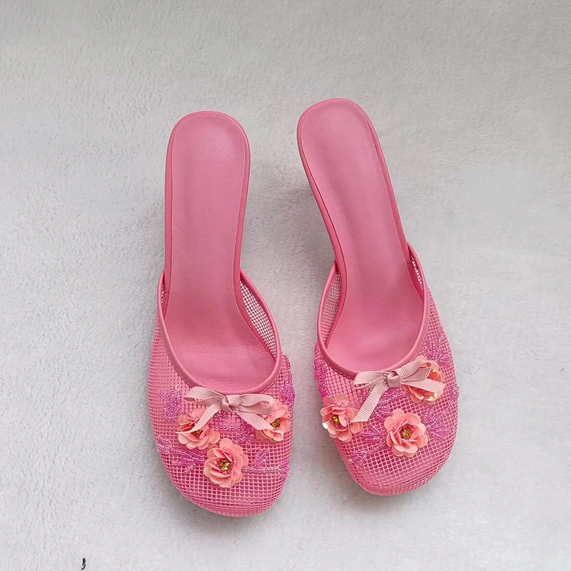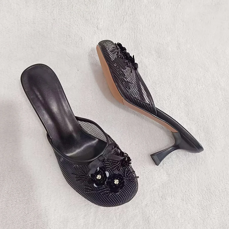 KYLETHOMASW - Summer mesh flower beads women slides sexy thin heel sandals