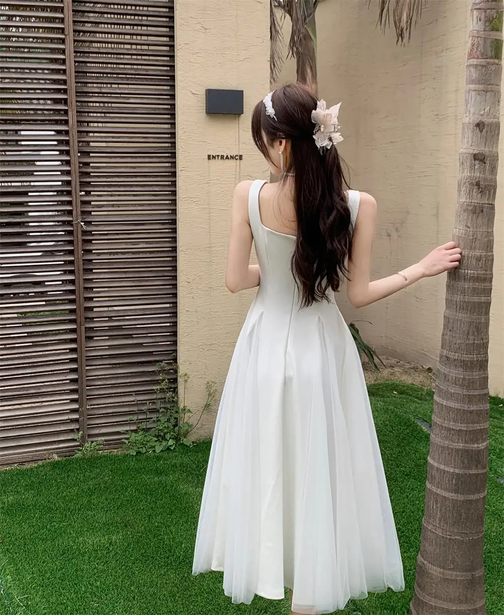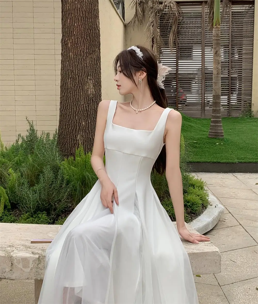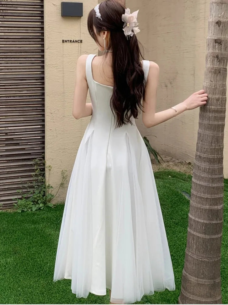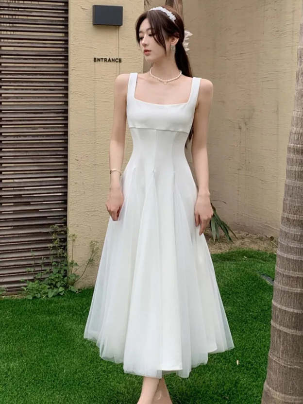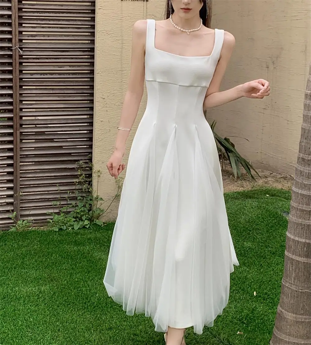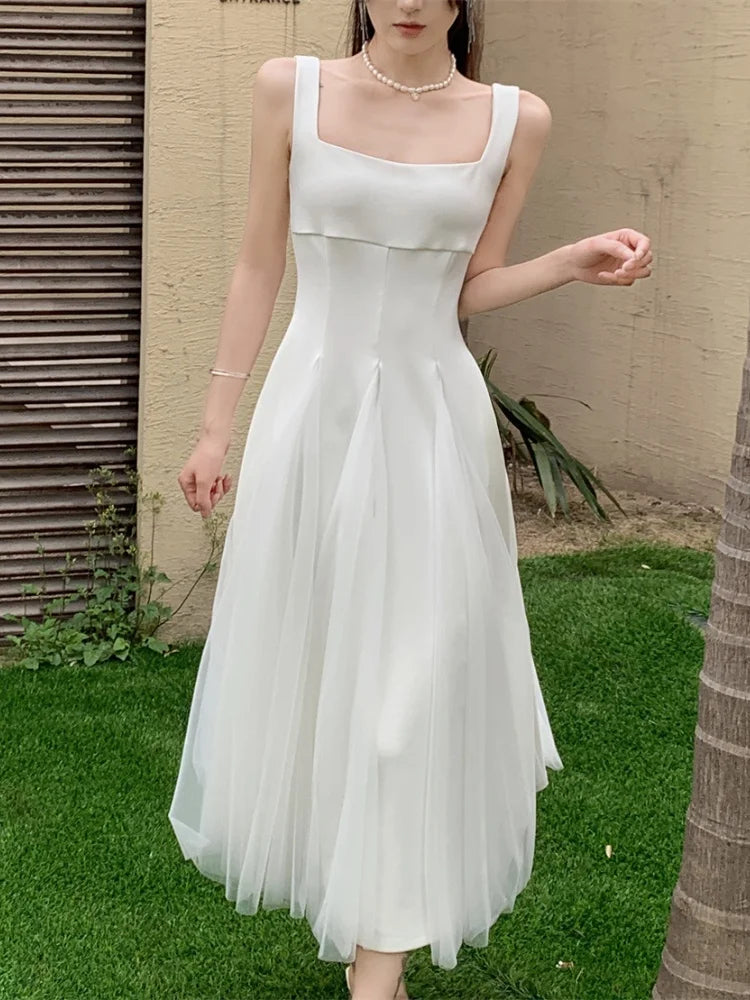 KYLETHOMASW - Summer Spring Fairy Womens Dresses Elegant Mesh Patchwork Square Collar Sleeveless Evening Party Midi Dress Female Vestidos Robe
