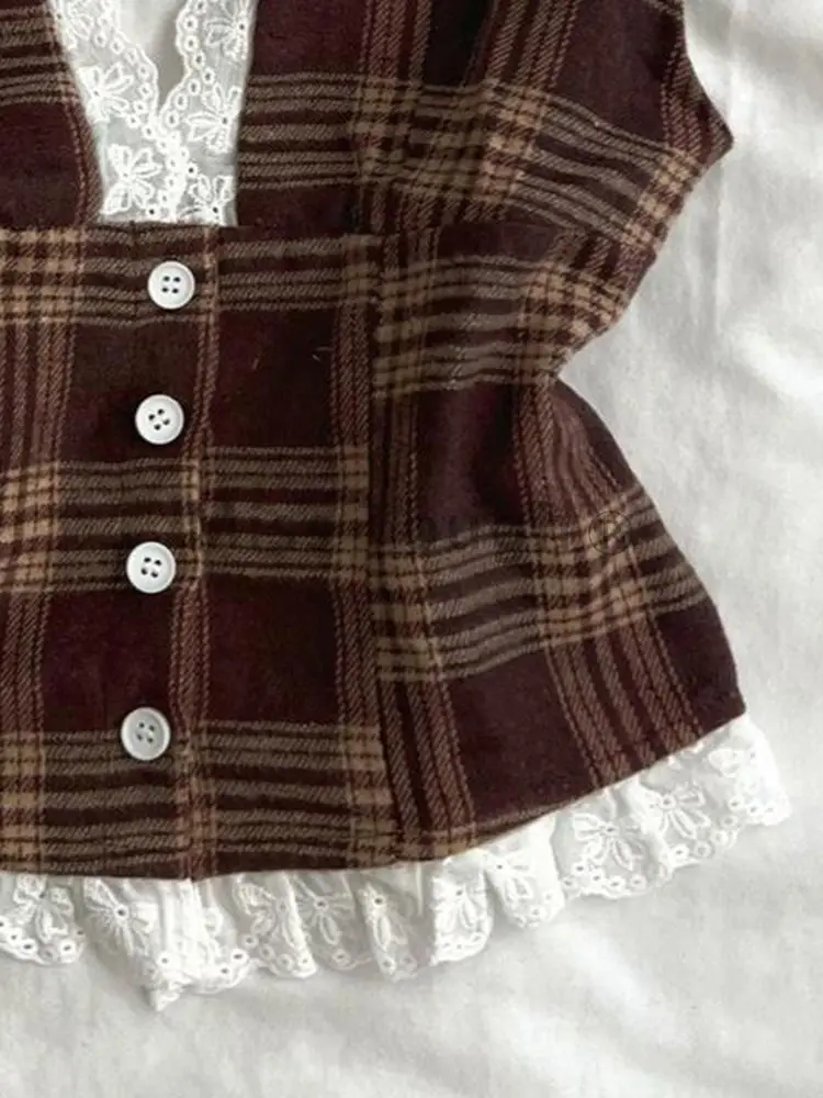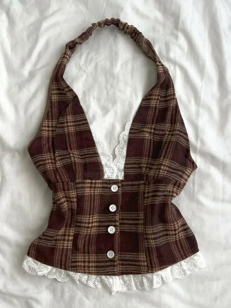 KYLETHOMASW - Summer Vintage Design Plaid Slash Neck Sling Women Hepburn Chic Lace Sleeveless Short Vest Hot Girl Y2k Sexy Patchwork Clothing