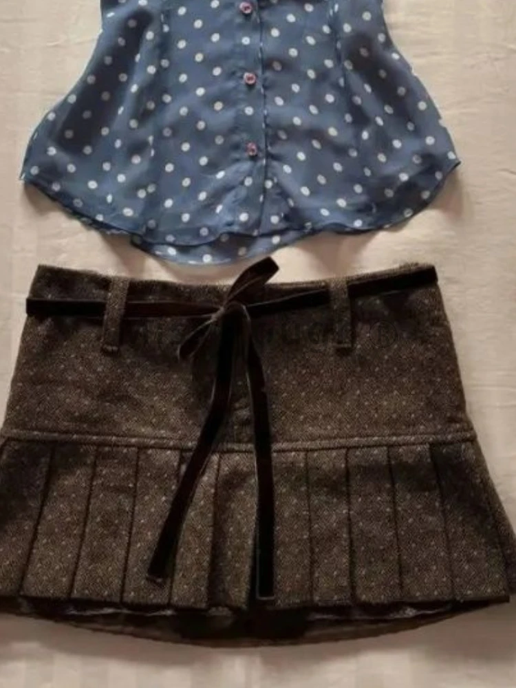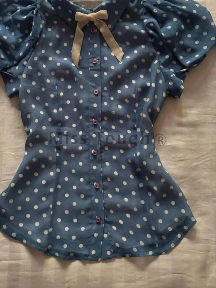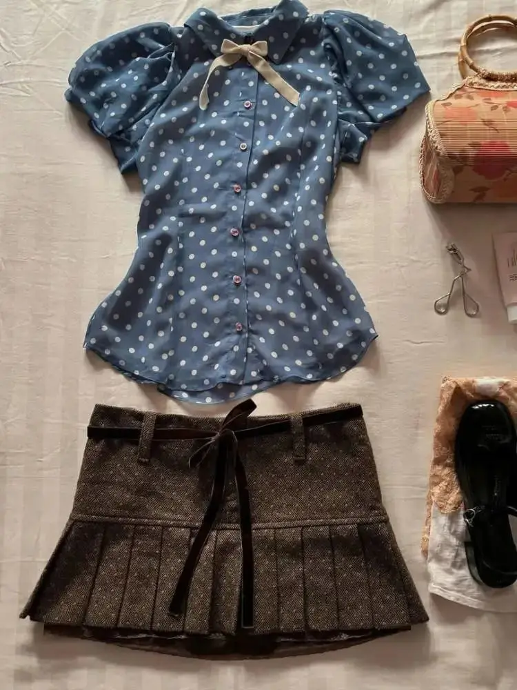 KYLETHOMASW - Summer Vintage Slim Thin 2-piece Set Women Design Retro Polka Dot Short Sleeve Lapel T-shirts + Low-waisted Bow Short Skirt New