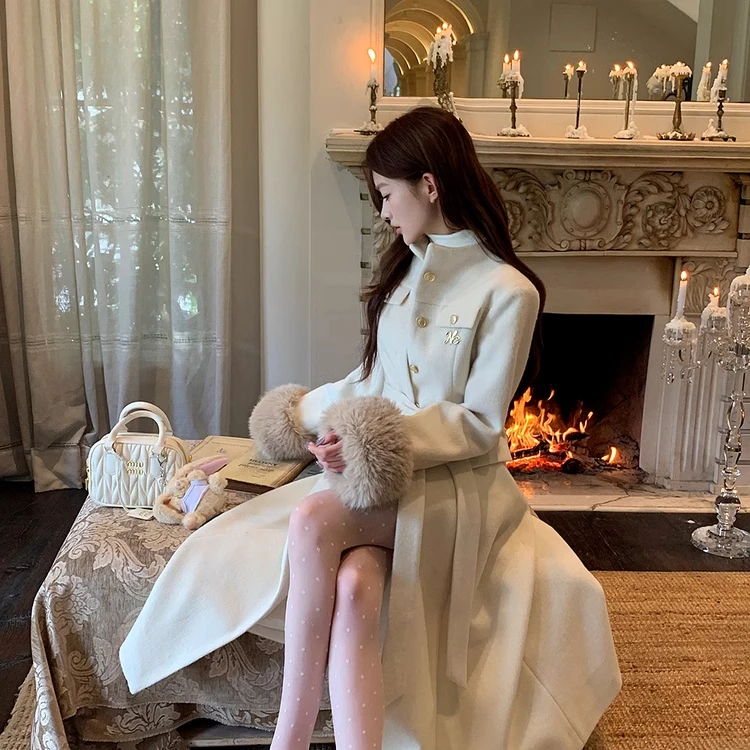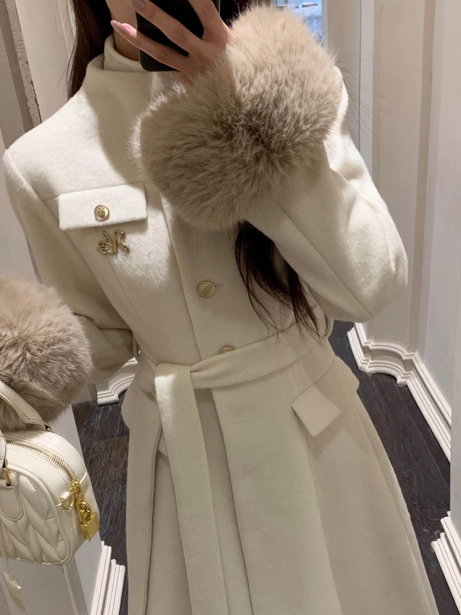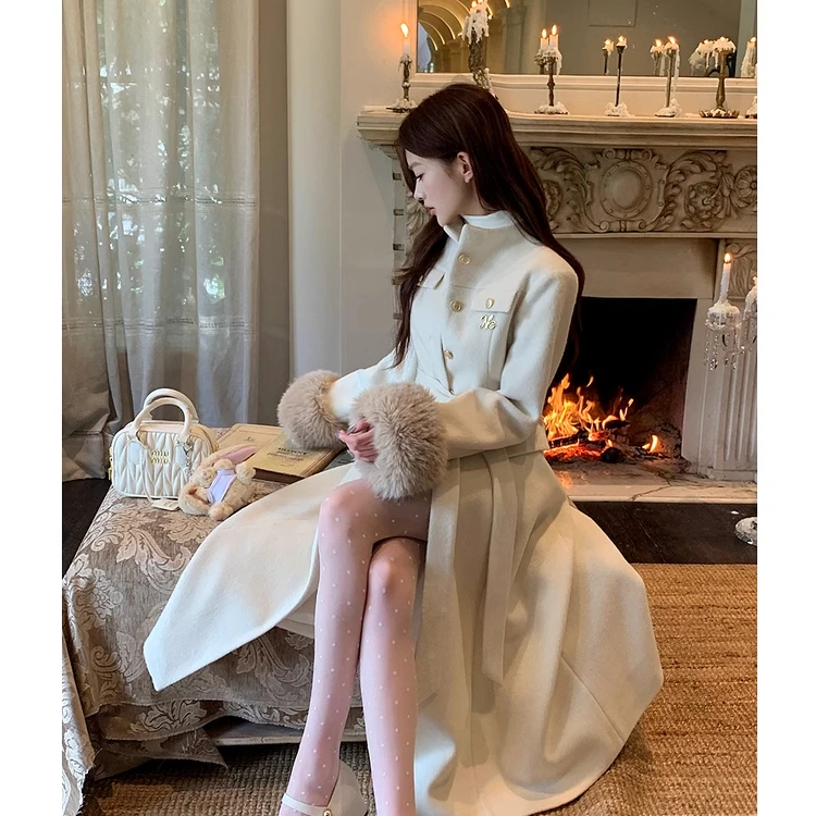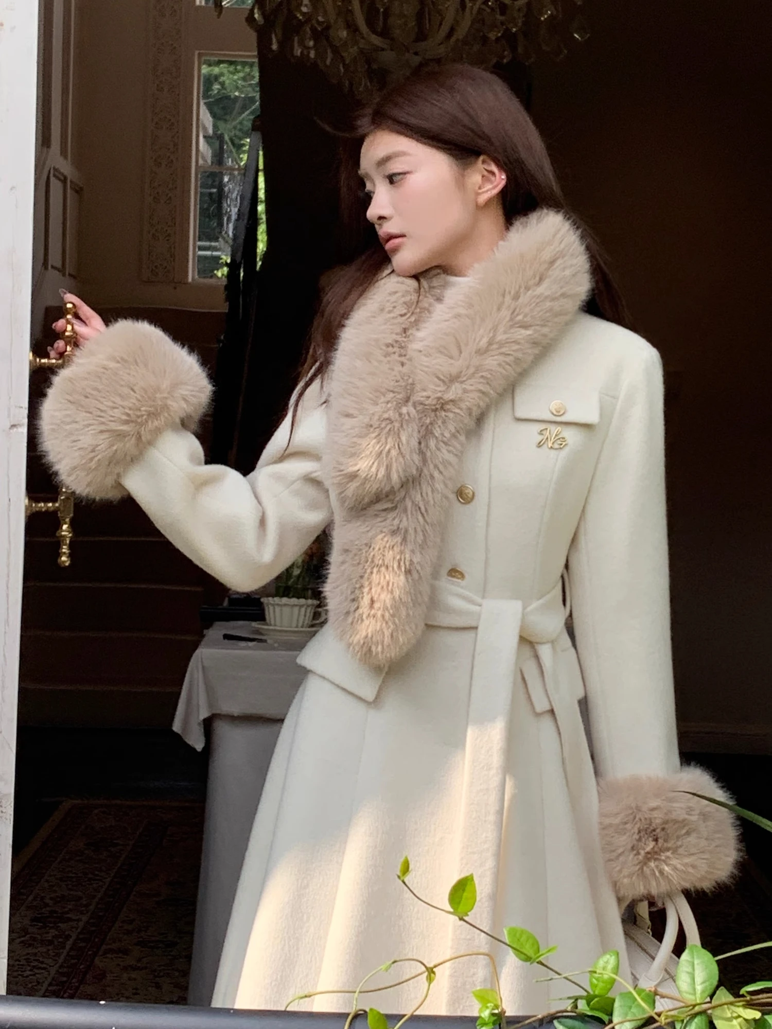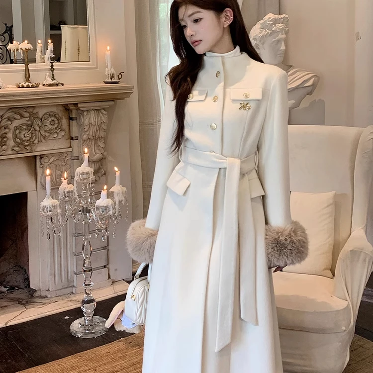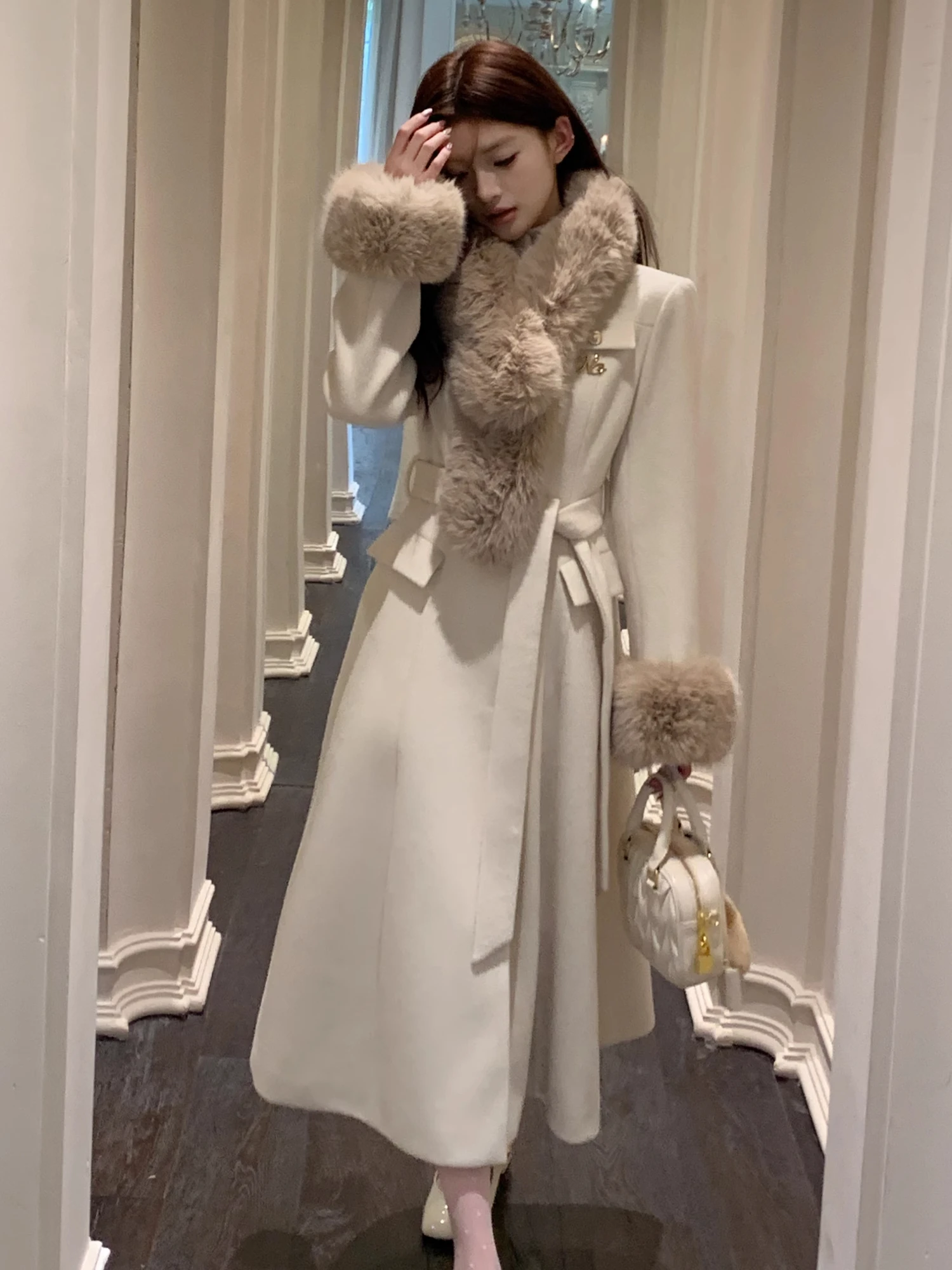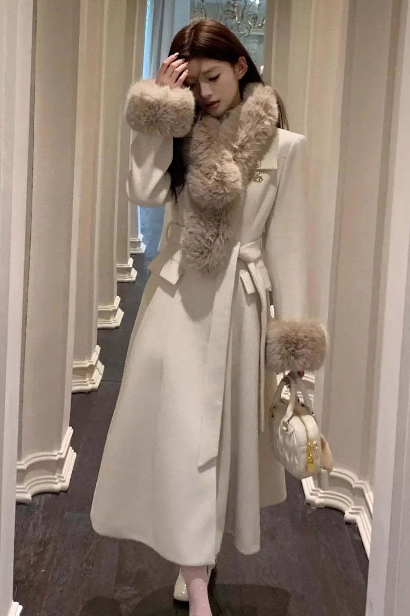 KYLETHOMASW - Sweet Hot Girl Large Fur Collar Woolen Coat Women's Winter Slim Single Breasted Belt Long-sleeved Coat Fashion Female Clothes