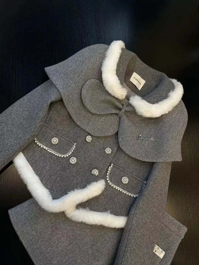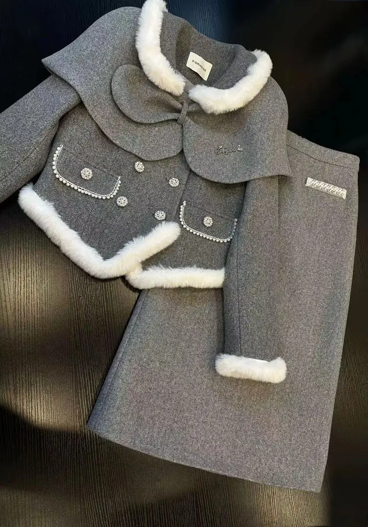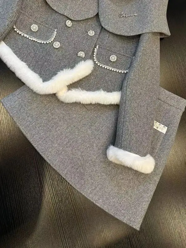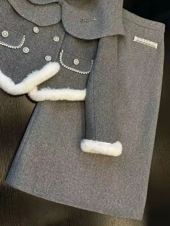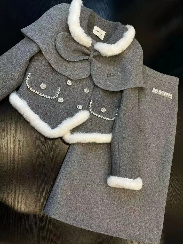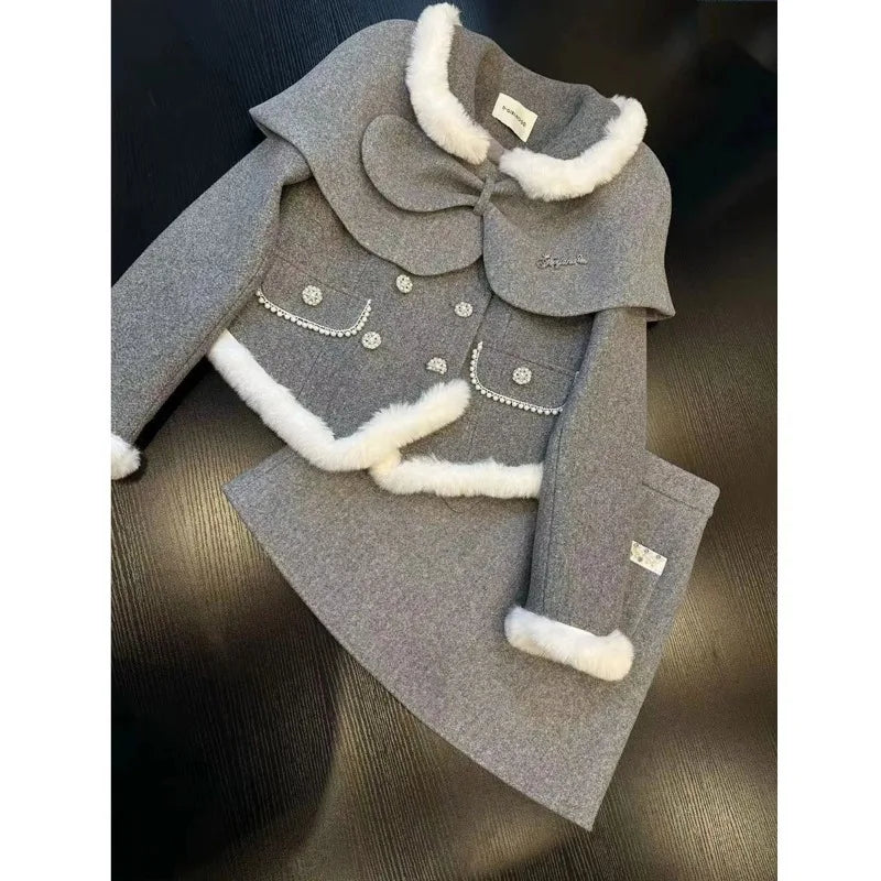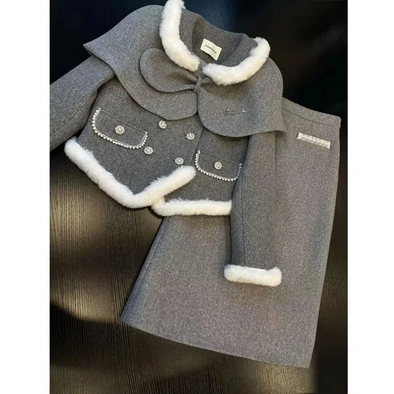 KYLETHOMASW - Sweet Hot Girl Suit Women's Autumn/Winter Fur Collar Padded Coat High-waisted A-line Skirt Two-piece Set Fashion Female Clothes