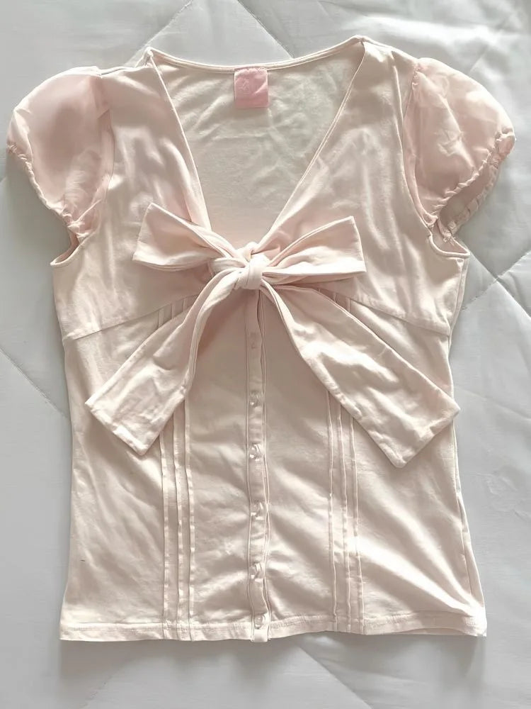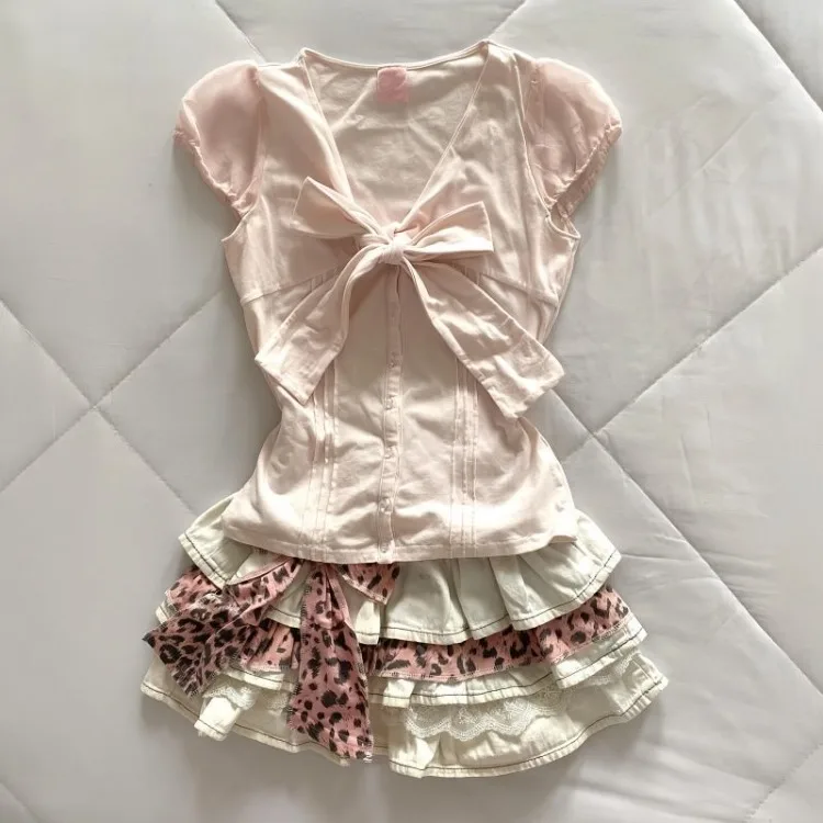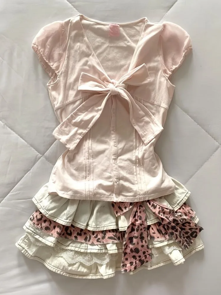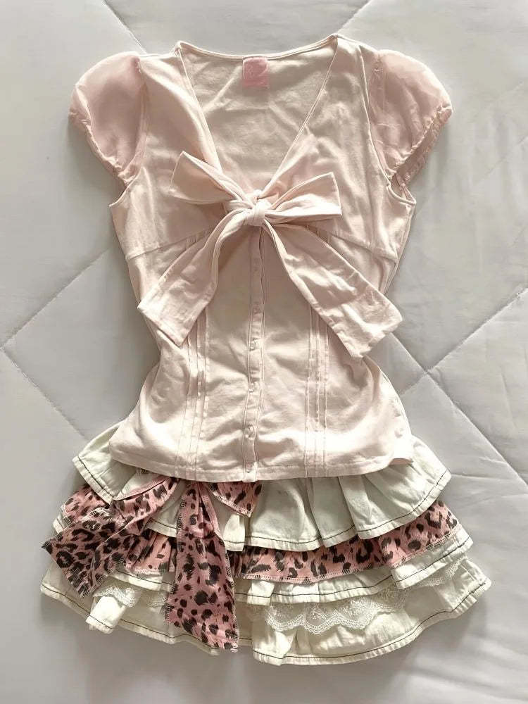KYLETHOMASW - Sweet Pink V-neck Bow Short Sleeve T-short for Women+ Y2k High Waist Ruched Cake Skirts 2025 Summer New Two Piece Sets
