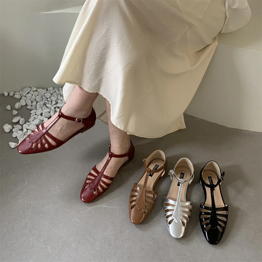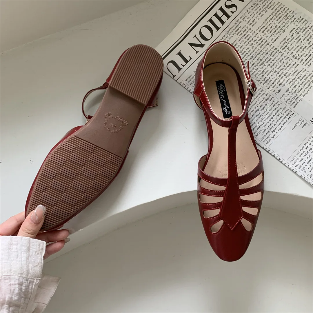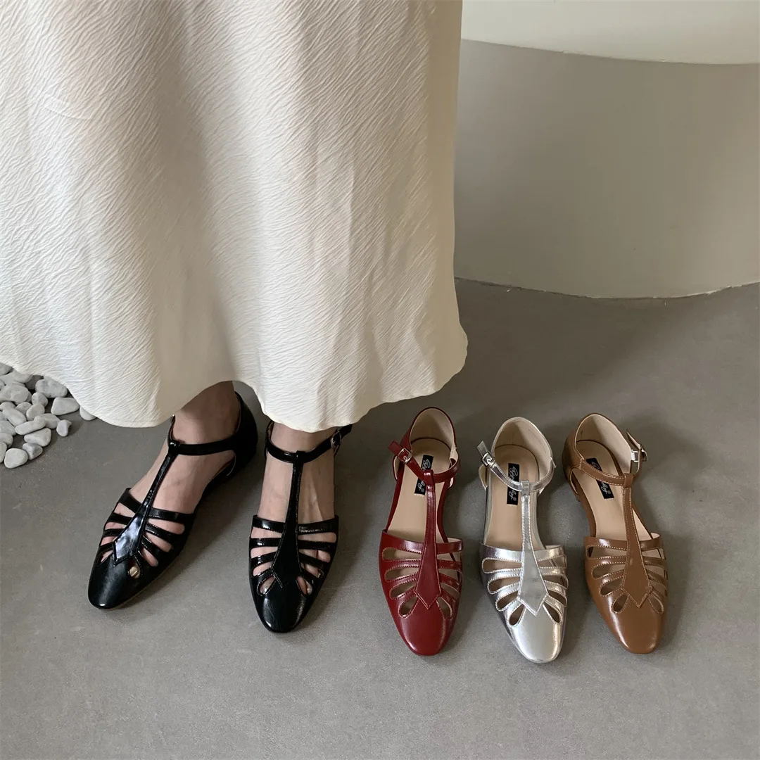 KYLETHOMASW - T-strap Rome Flat Sandals Women Hollow Out Vintage Summer Mary Janes Shoes Ladies Pu Leather Holiday Elegant Gladiator Sandals
