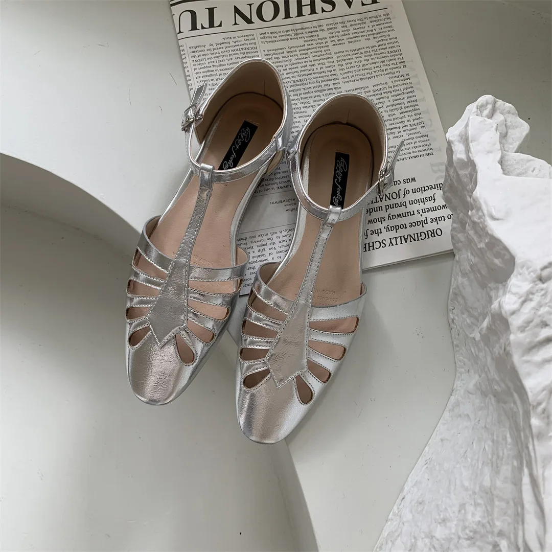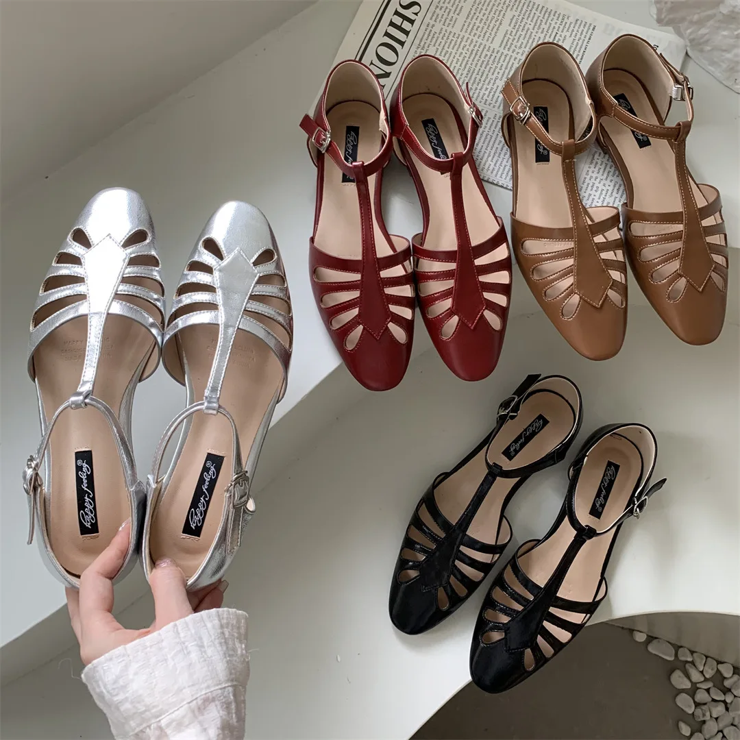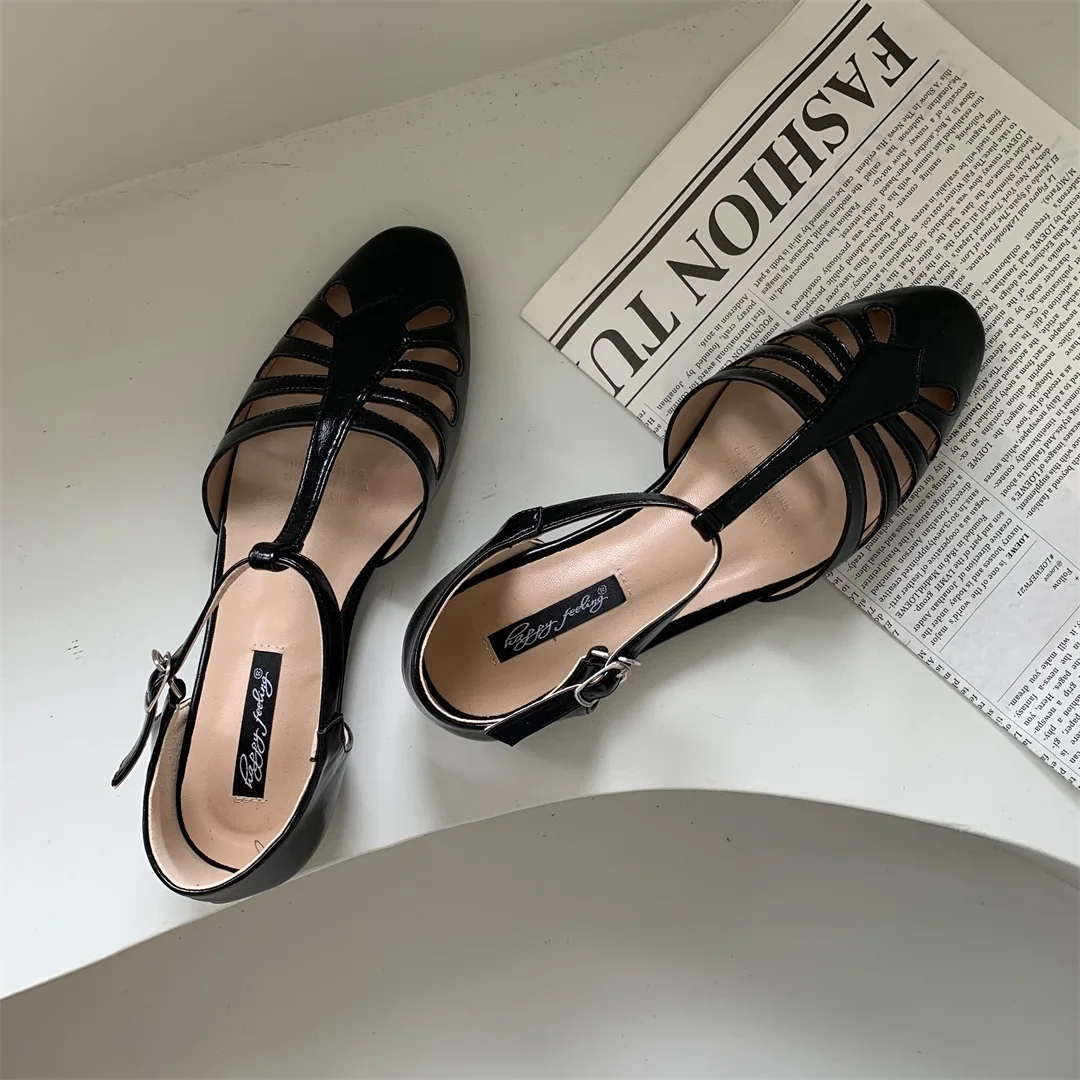 KYLETHOMASW - T-strap Rome Flat Sandals Women Hollow Out Vintage Summer Mary Janes Shoes Ladies Pu Leather Holiday Elegant Gladiator Sandals