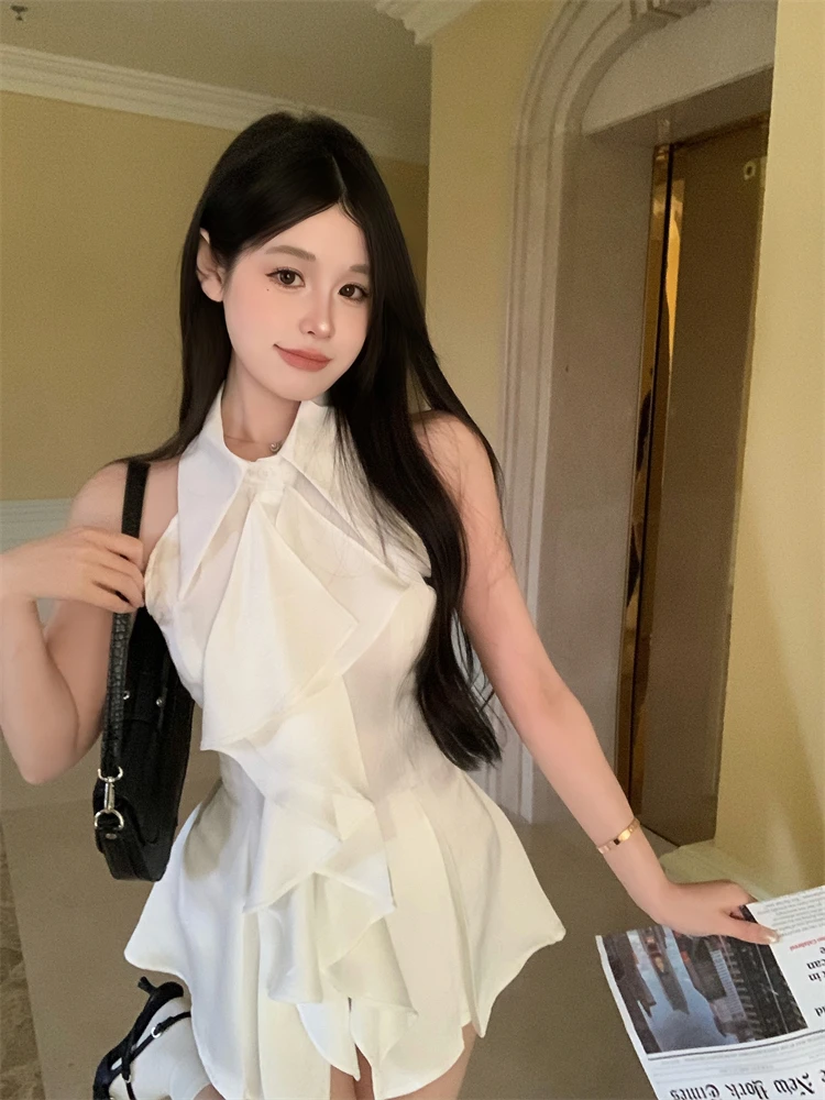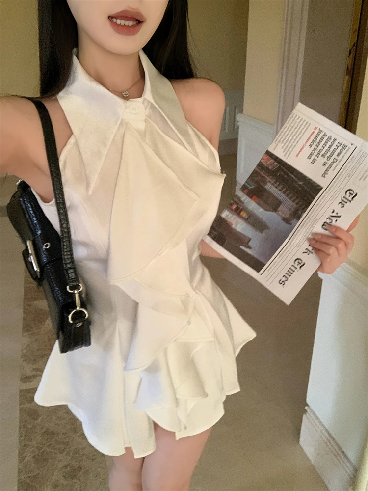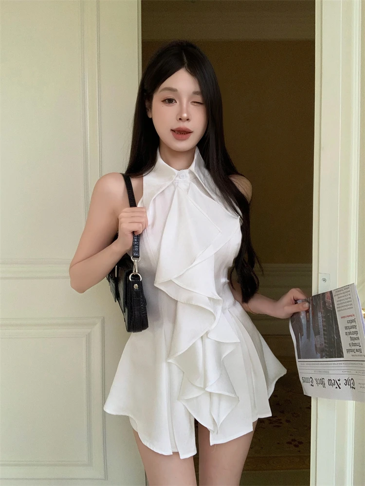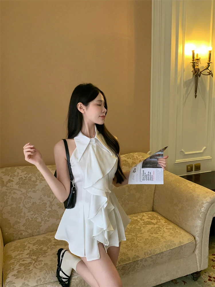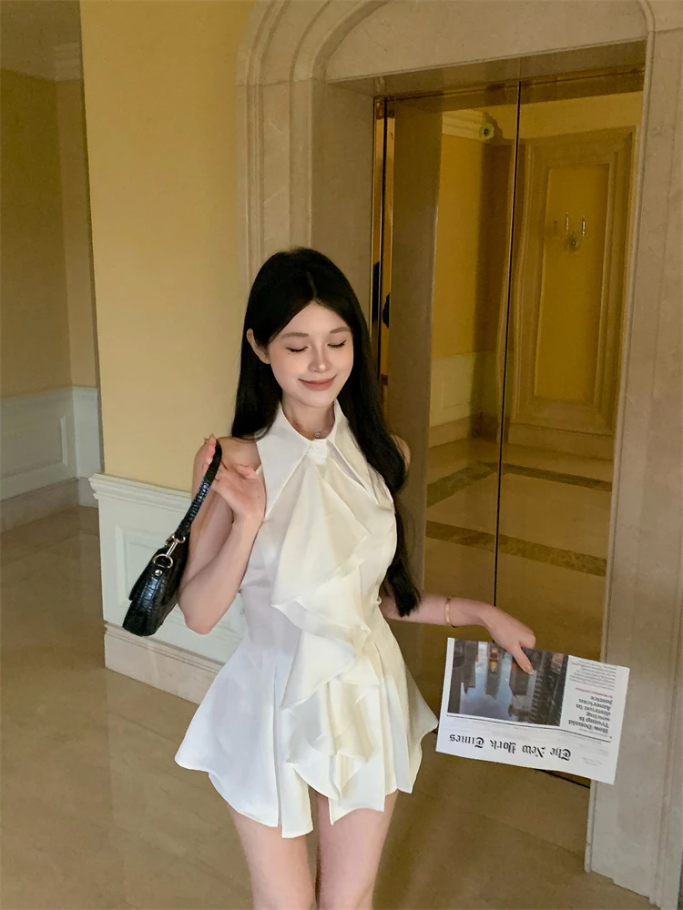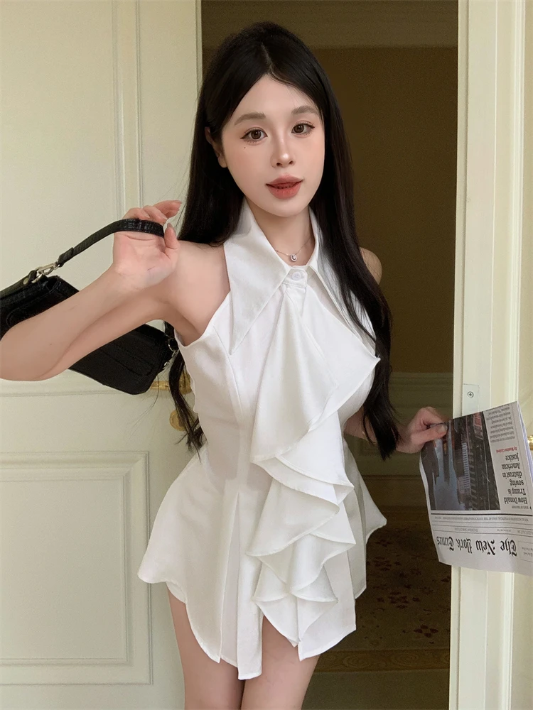 KYLETHOMASW - White Ruffle Edge Polo Neck Sleeveless Shirt Women's Top Summer French Style Mid length Waist Slim Sexy Blouses Women Clothing