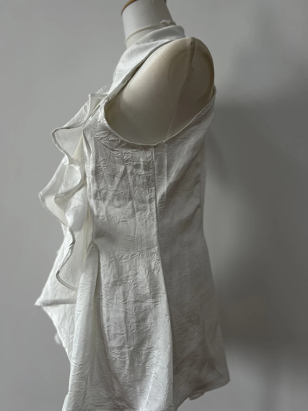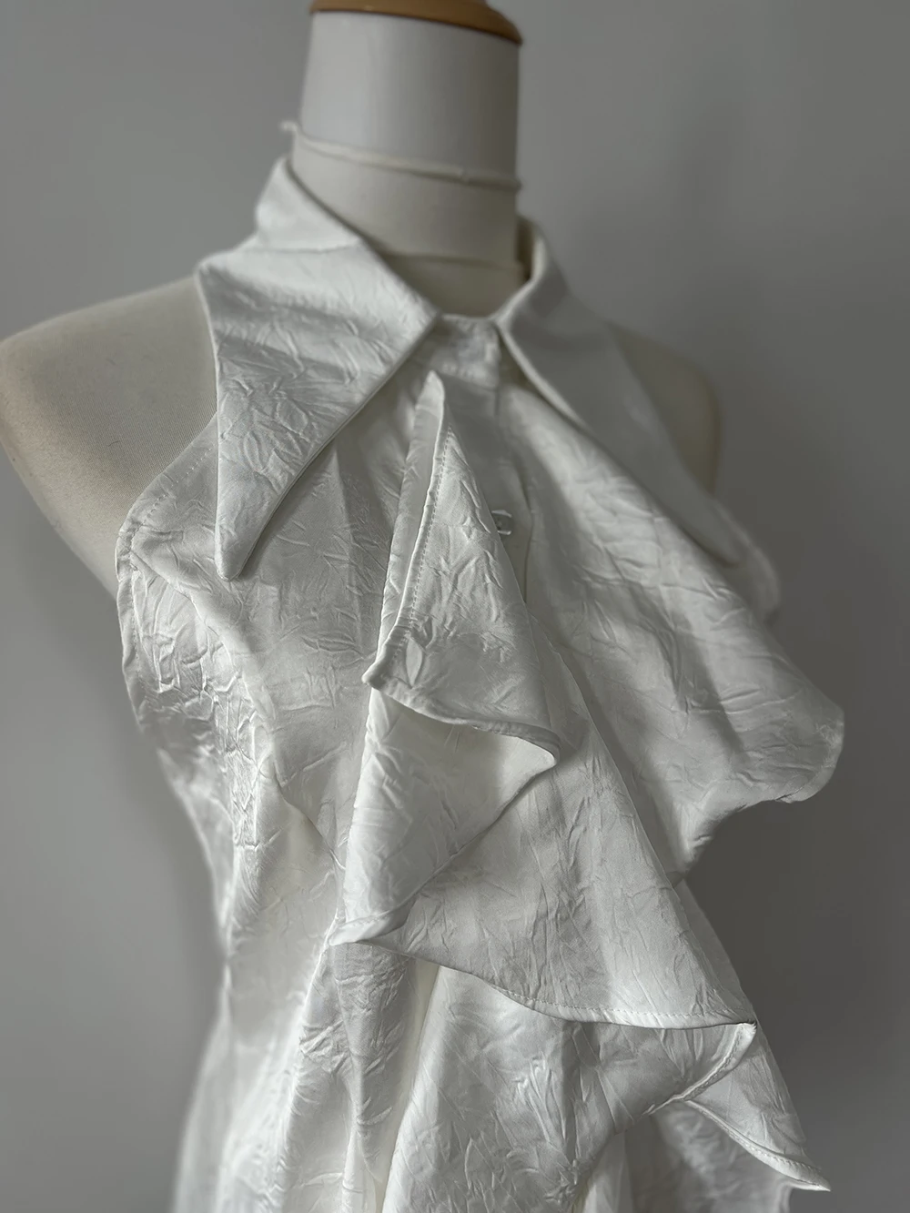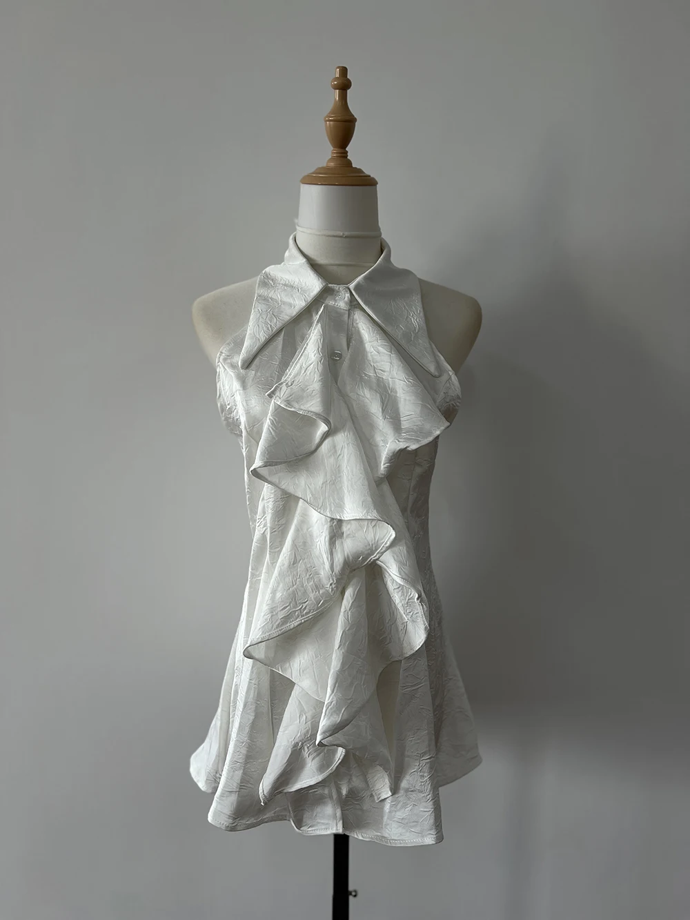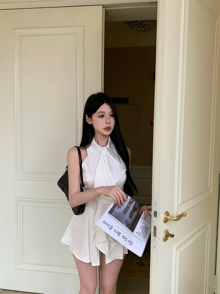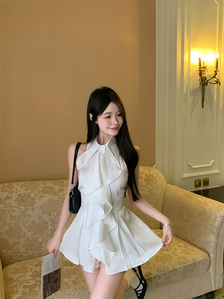 KYLETHOMASW - White Ruffle Edge Polo Neck Sleeveless Shirt Women's Top Summer French Style Mid length Waist Slim Sexy Blouses Women Clothing
