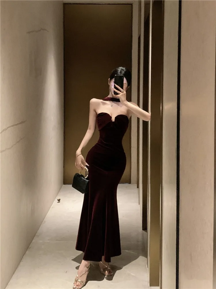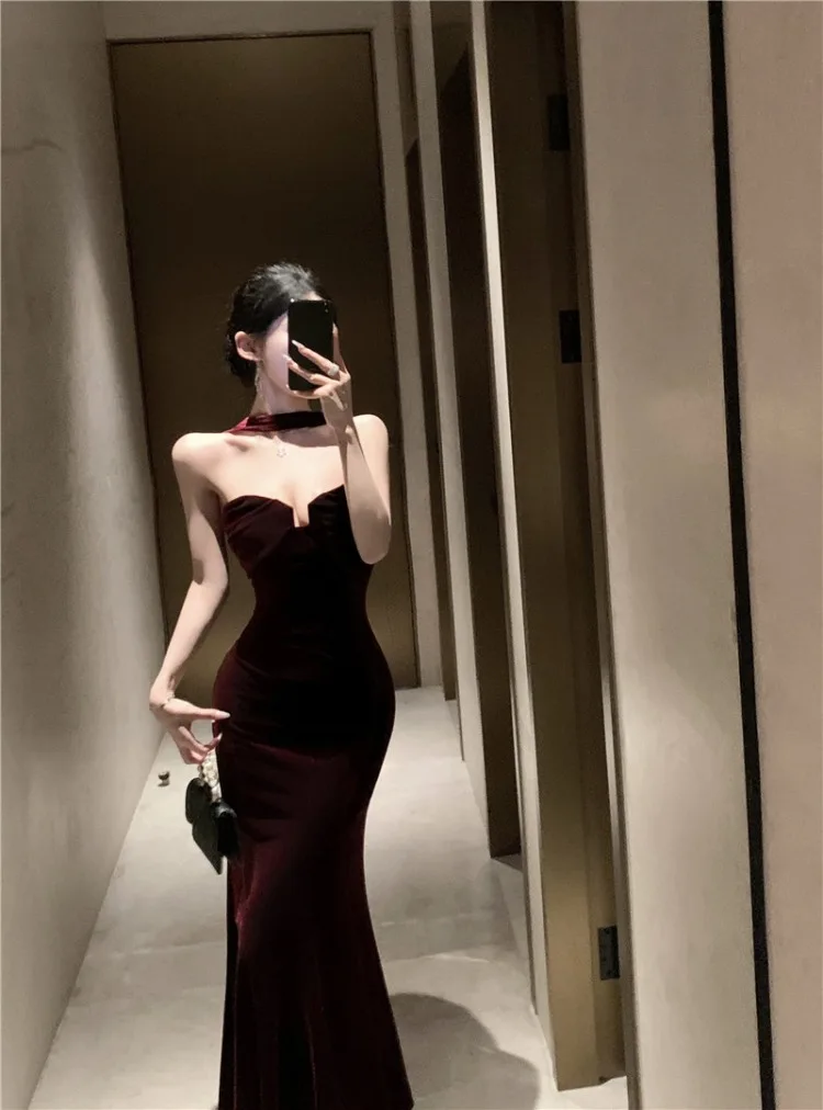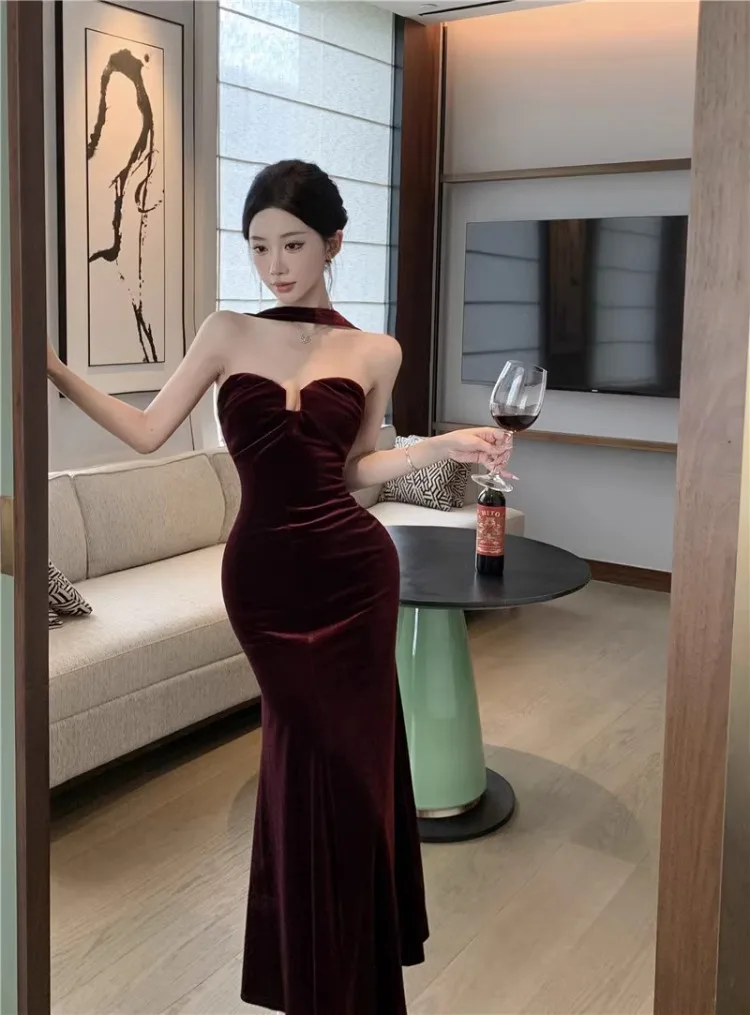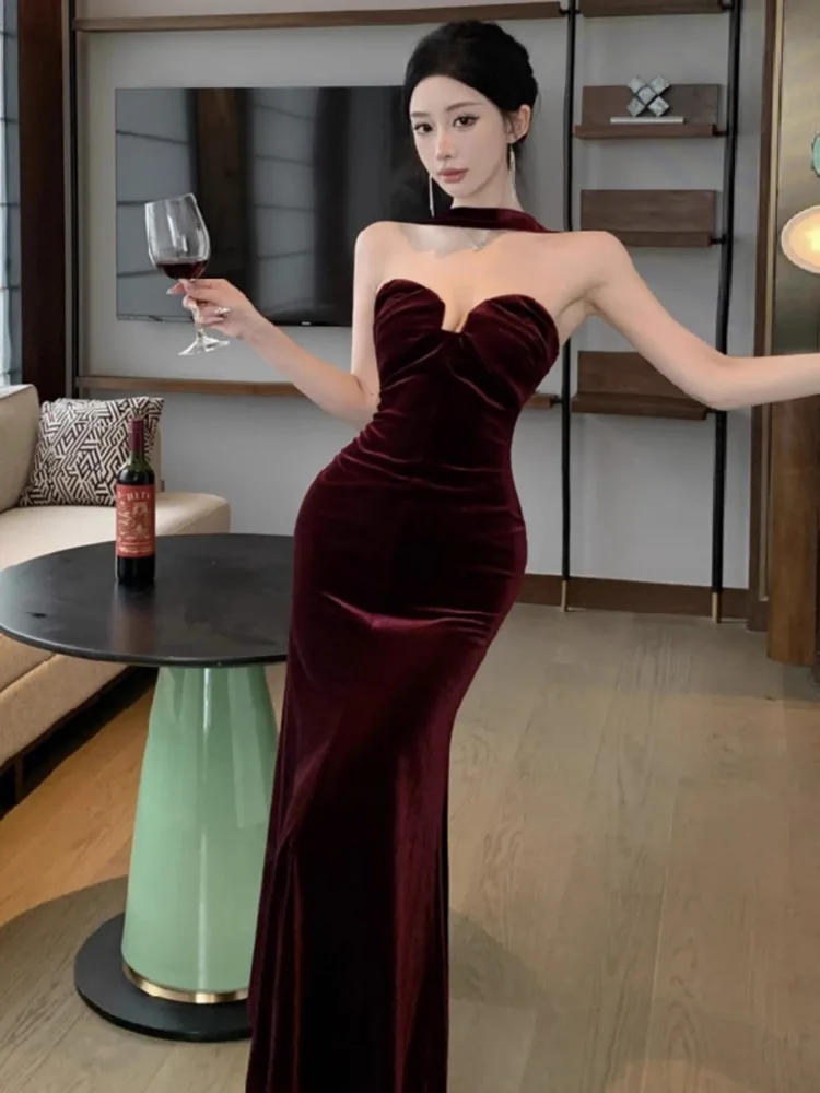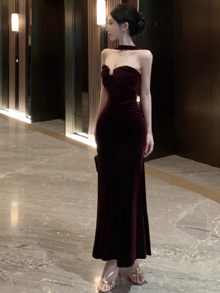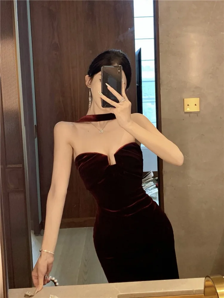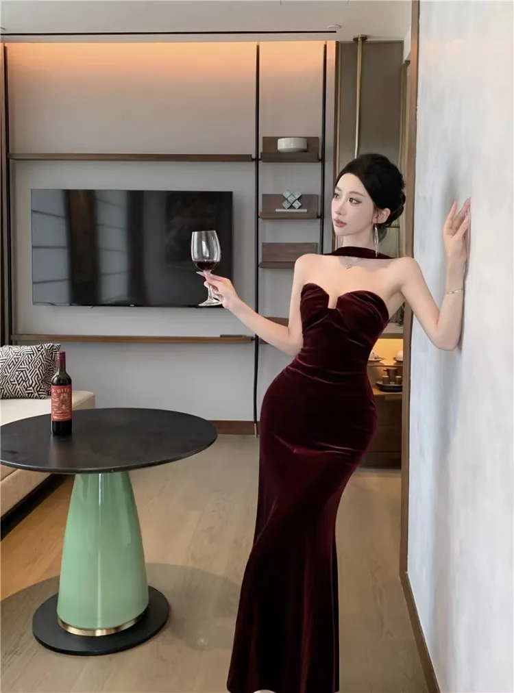 women evening dresses strapless velvet vintage backless banquet wedding party slim temperament cocktail dress toast