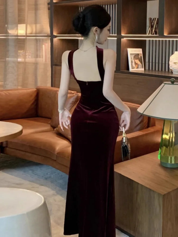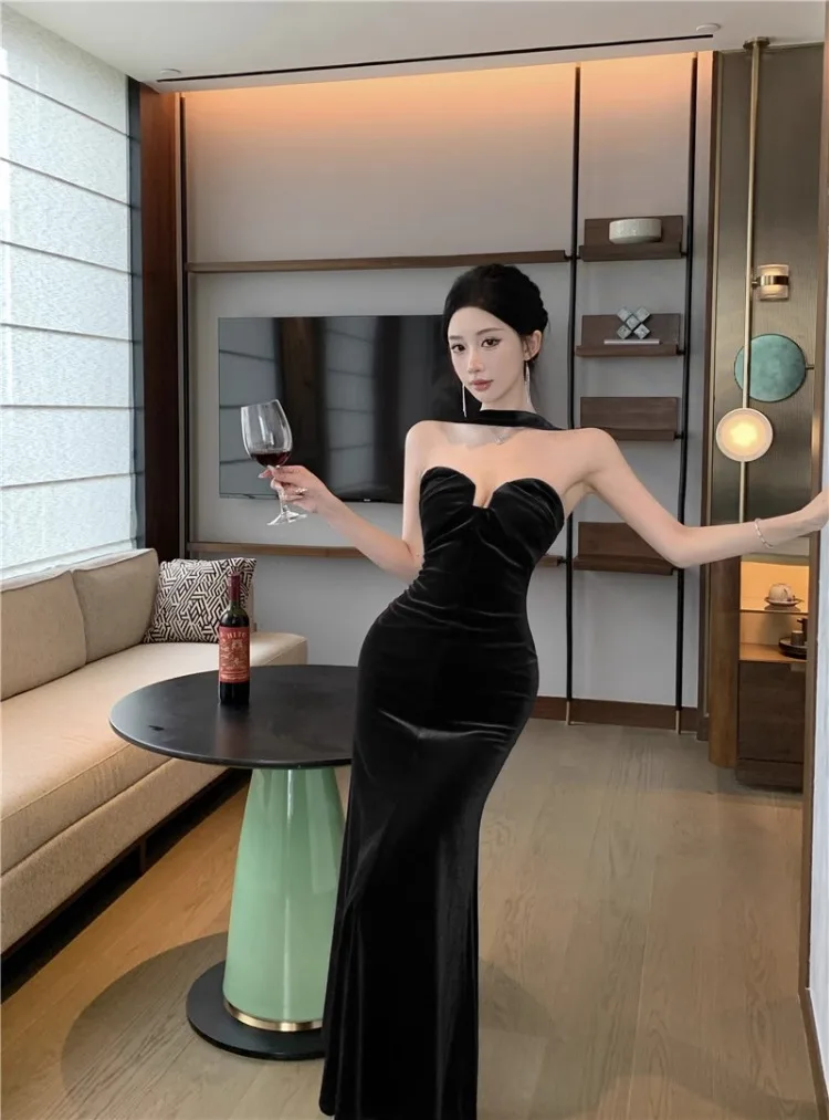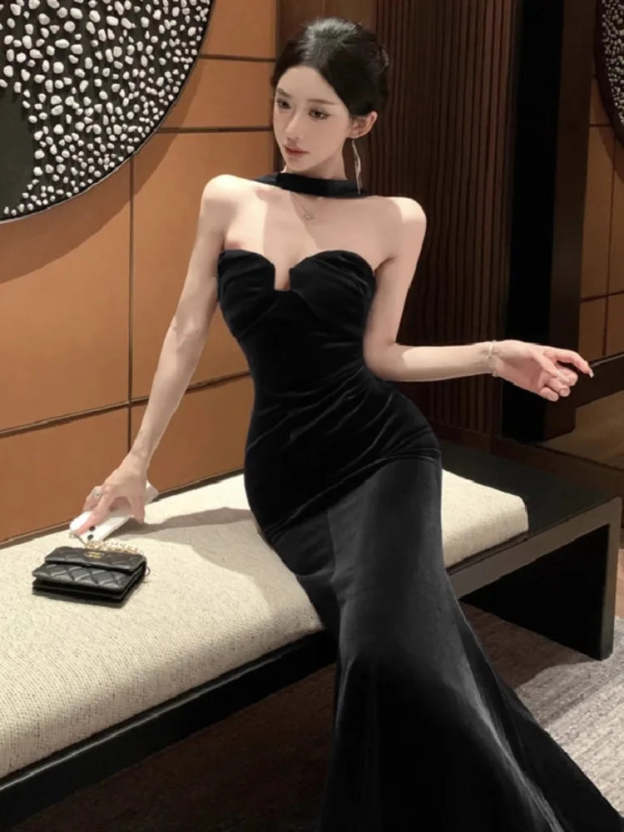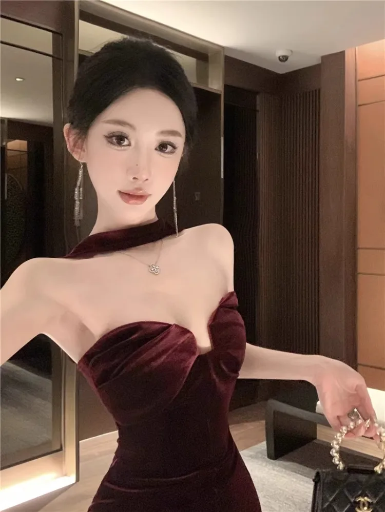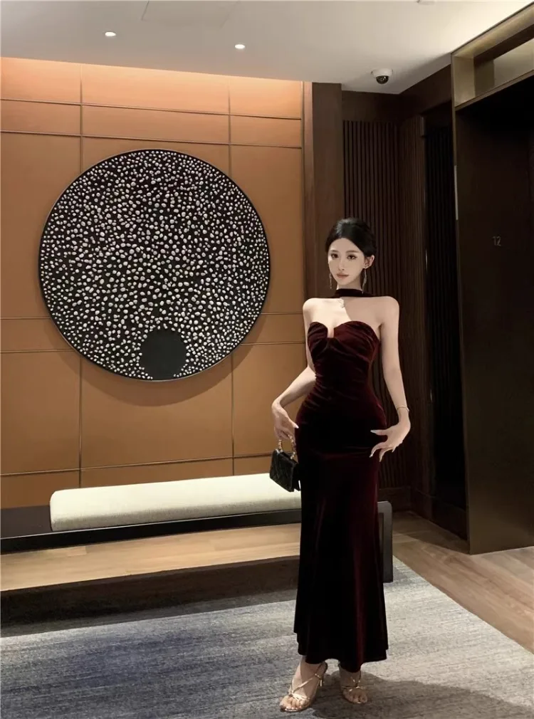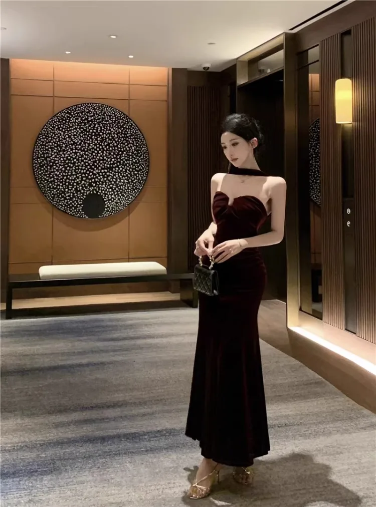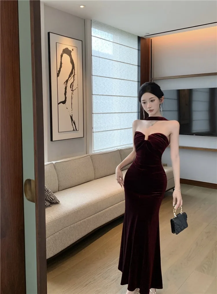 women evening dresses strapless velvet vintage backless banquet wedding party slim temperament cocktail dress toast