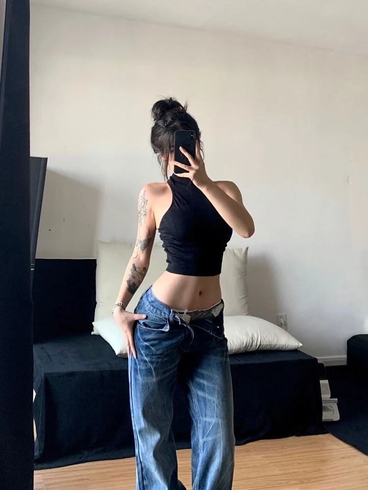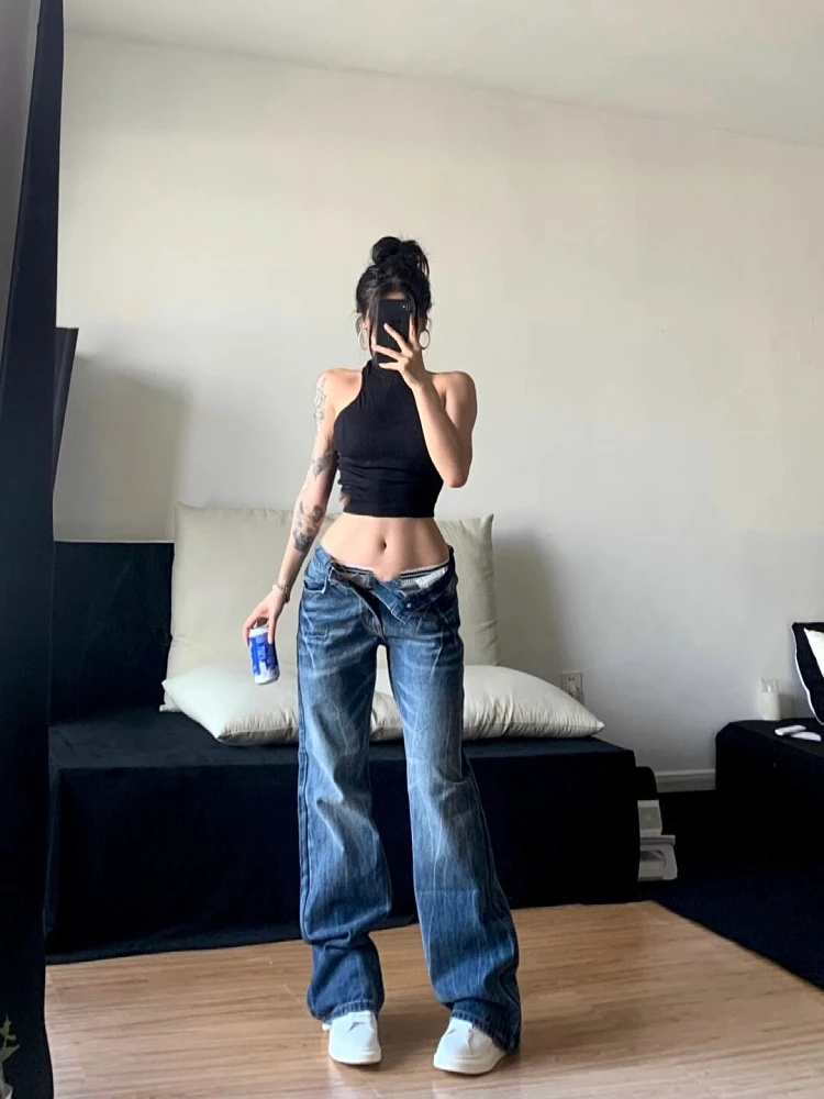 Kylethomasw - Women Korean Fashion Vintage Classical Chic Jeans Straight Leg Simple Jeans Grunge Harajuku Blue Denim Pants Y2k Tide Aesthetic