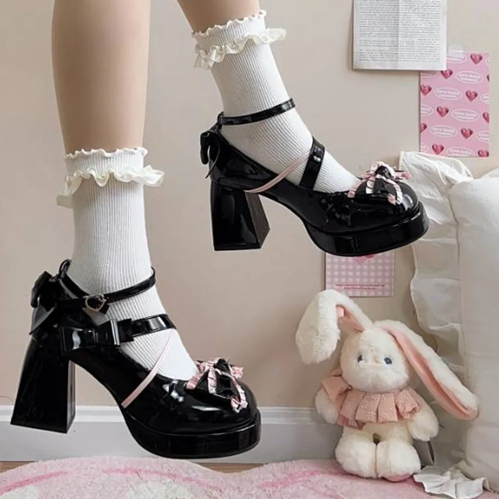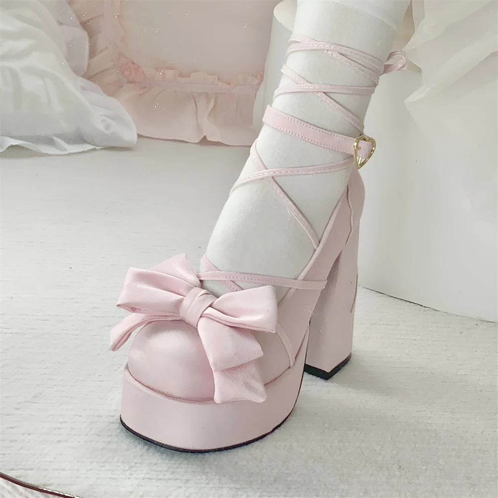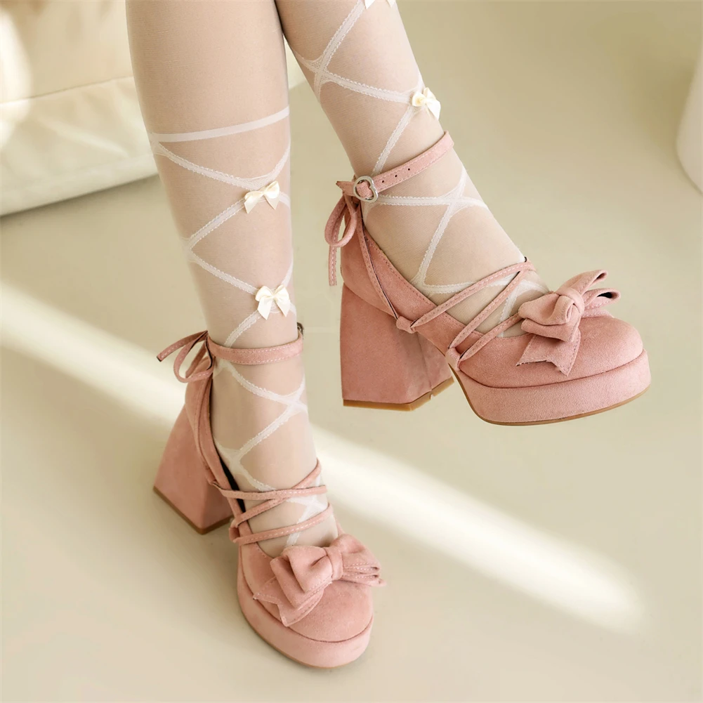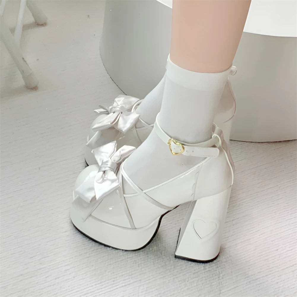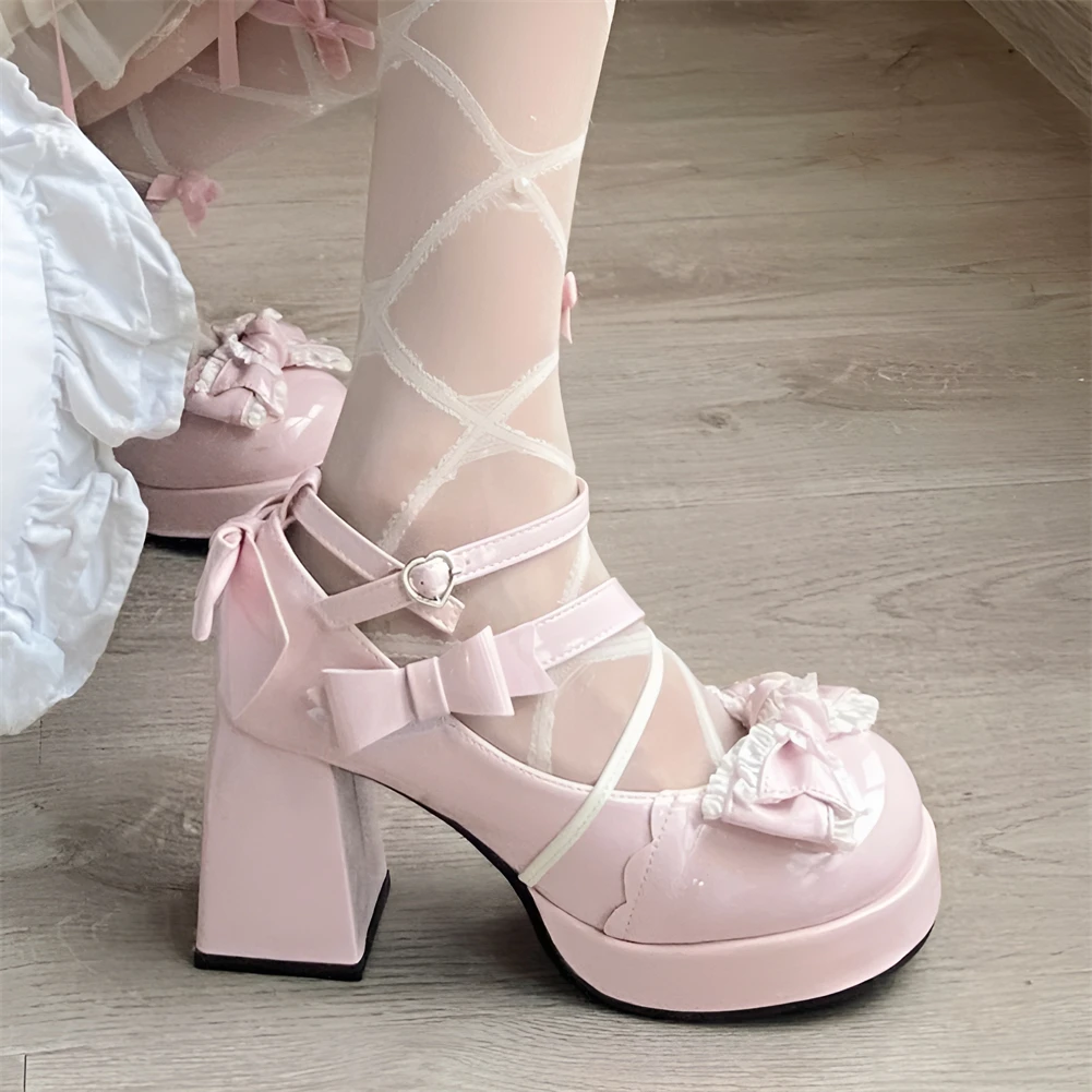 KYLETHOMASW - Women Lolita Bow Bow Decor Pumps Platform Chunky High Heels Ankle Strap Sweet Cute Elegant Pumps For Girl Elegant Shoes
