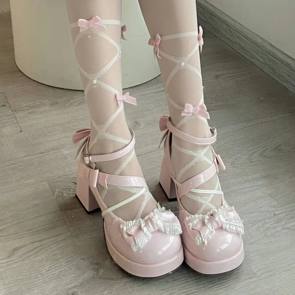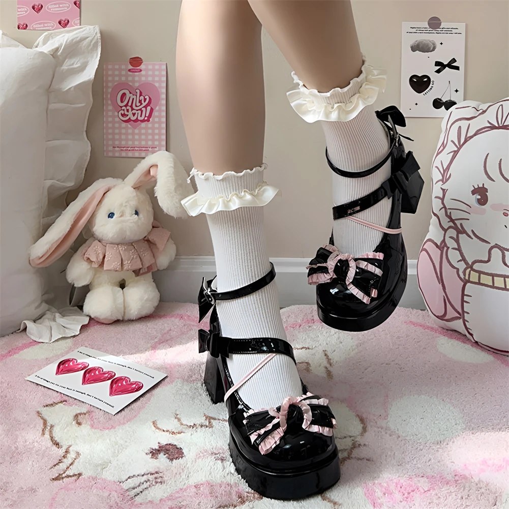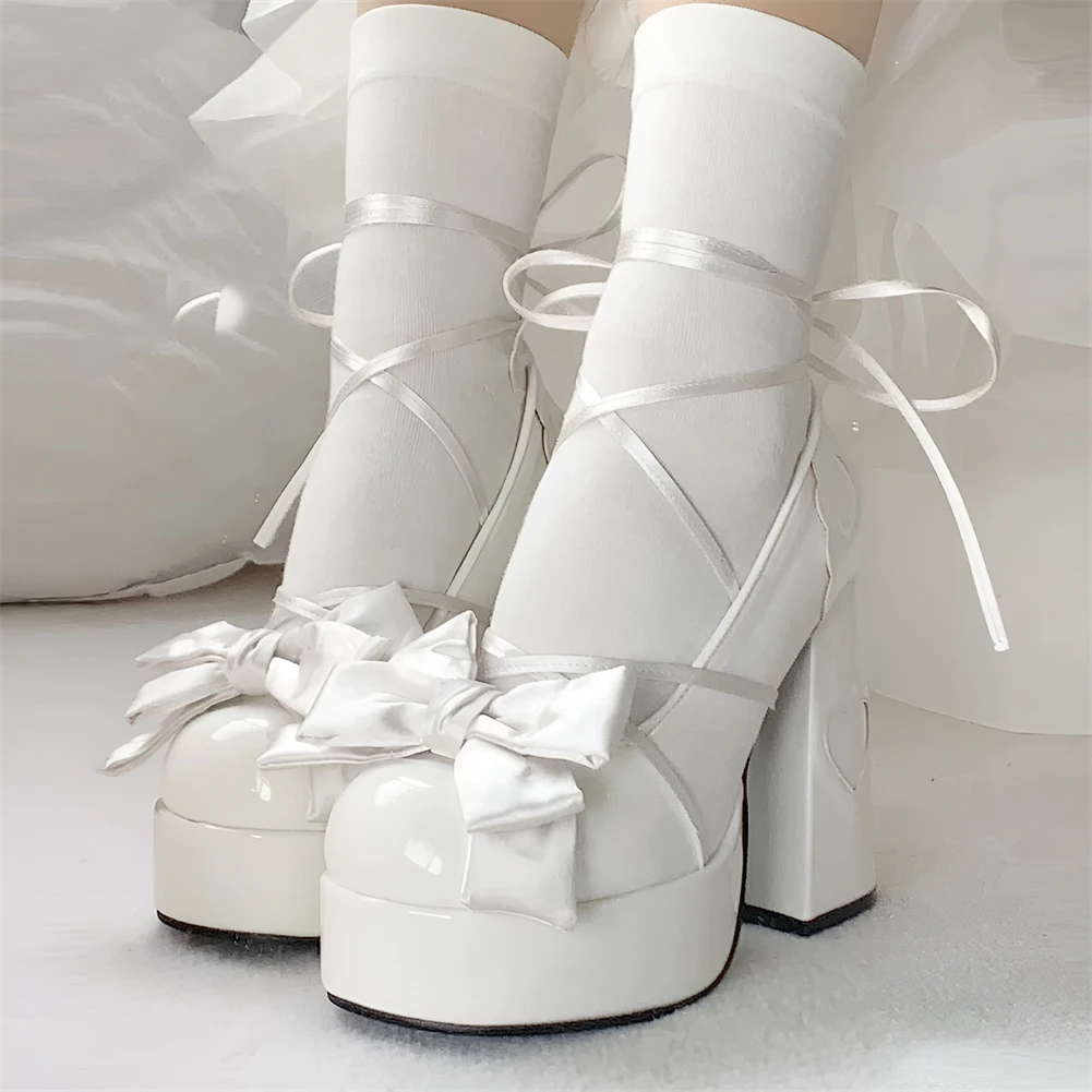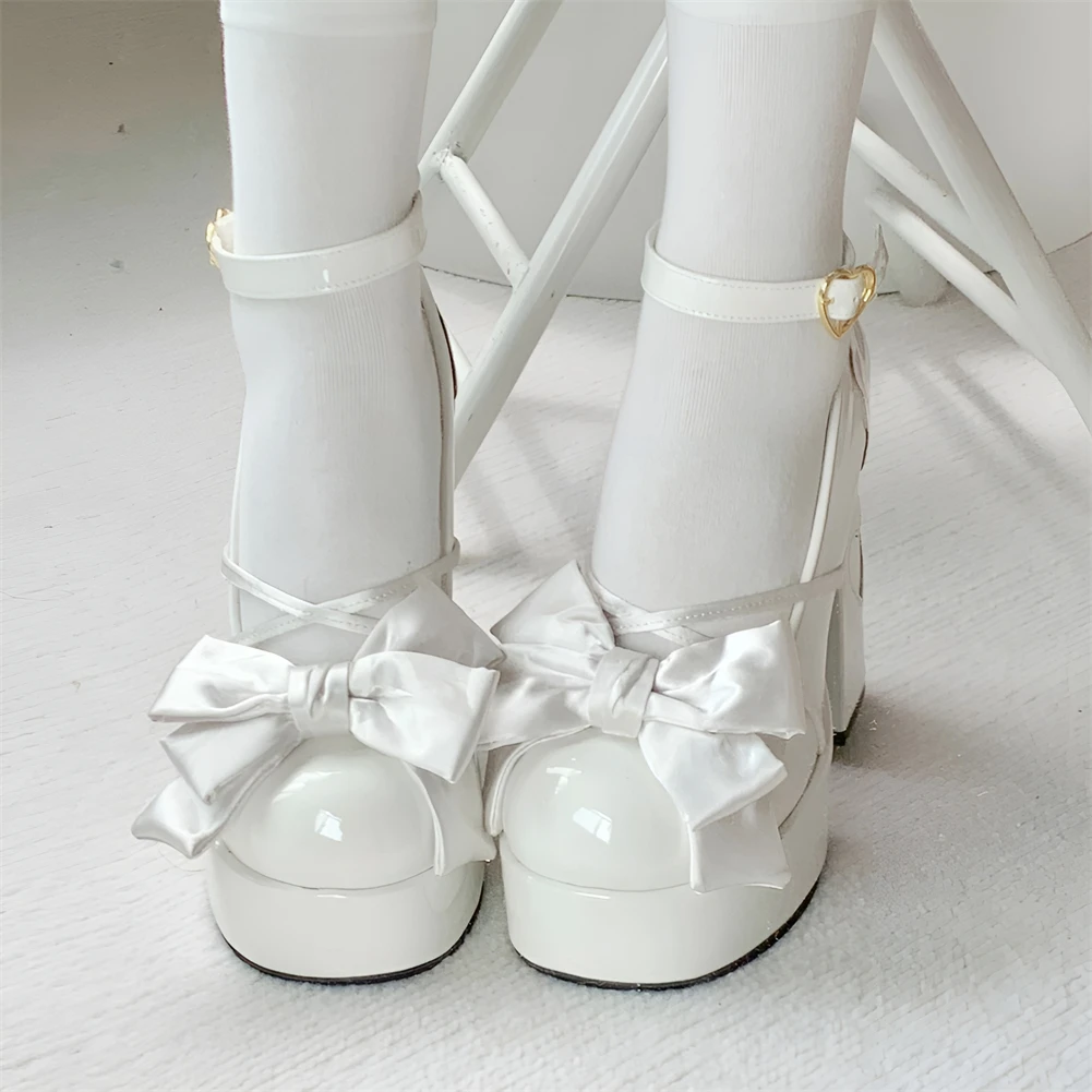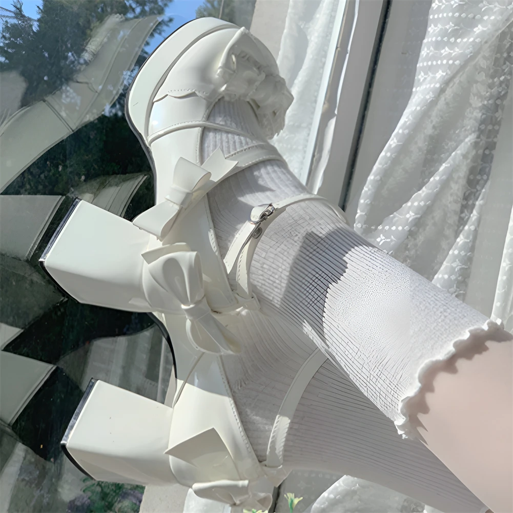 KYLETHOMASW - Women Lolita Bow Bow Decor Pumps Platform Chunky High Heels Ankle Strap Sweet Cute Elegant Pumps For Girl Elegant Shoes