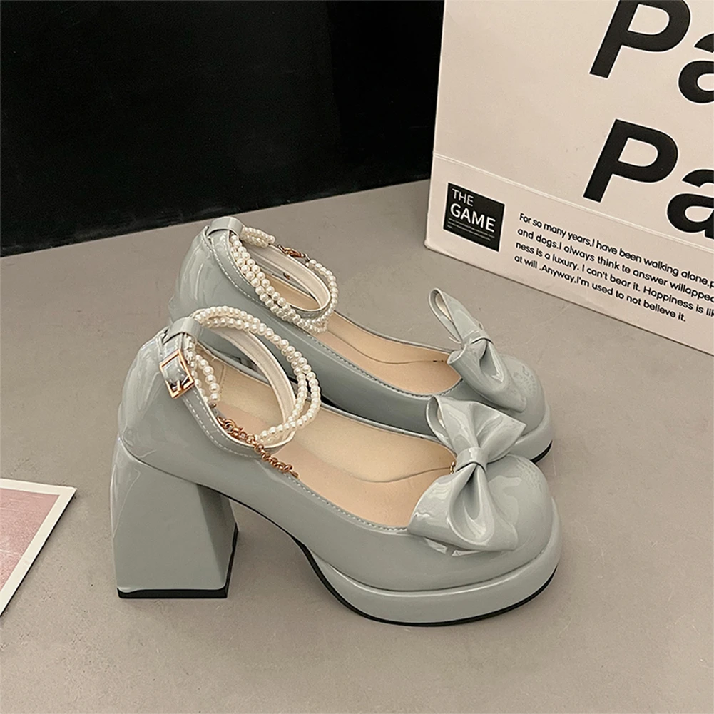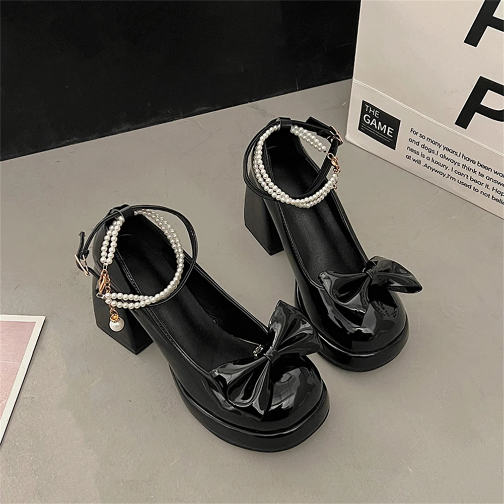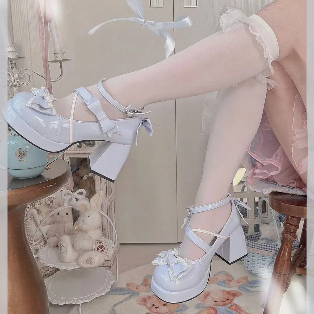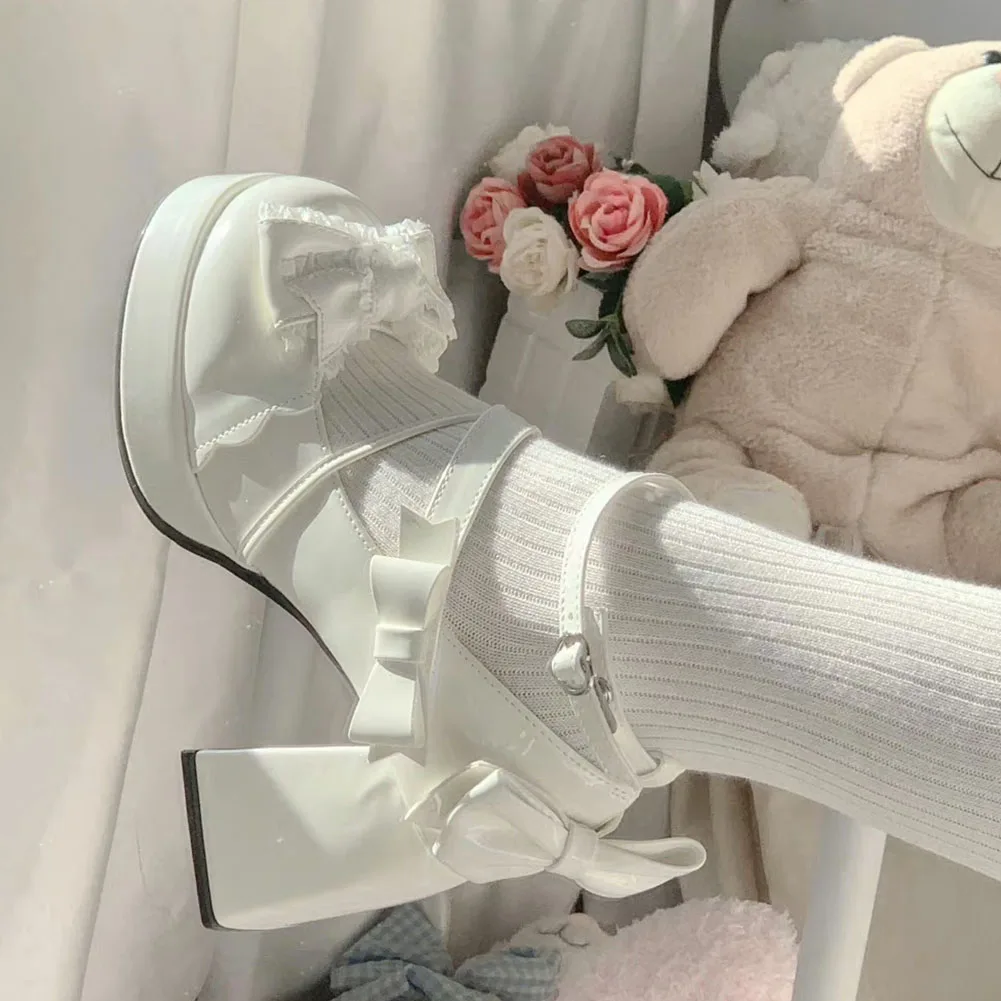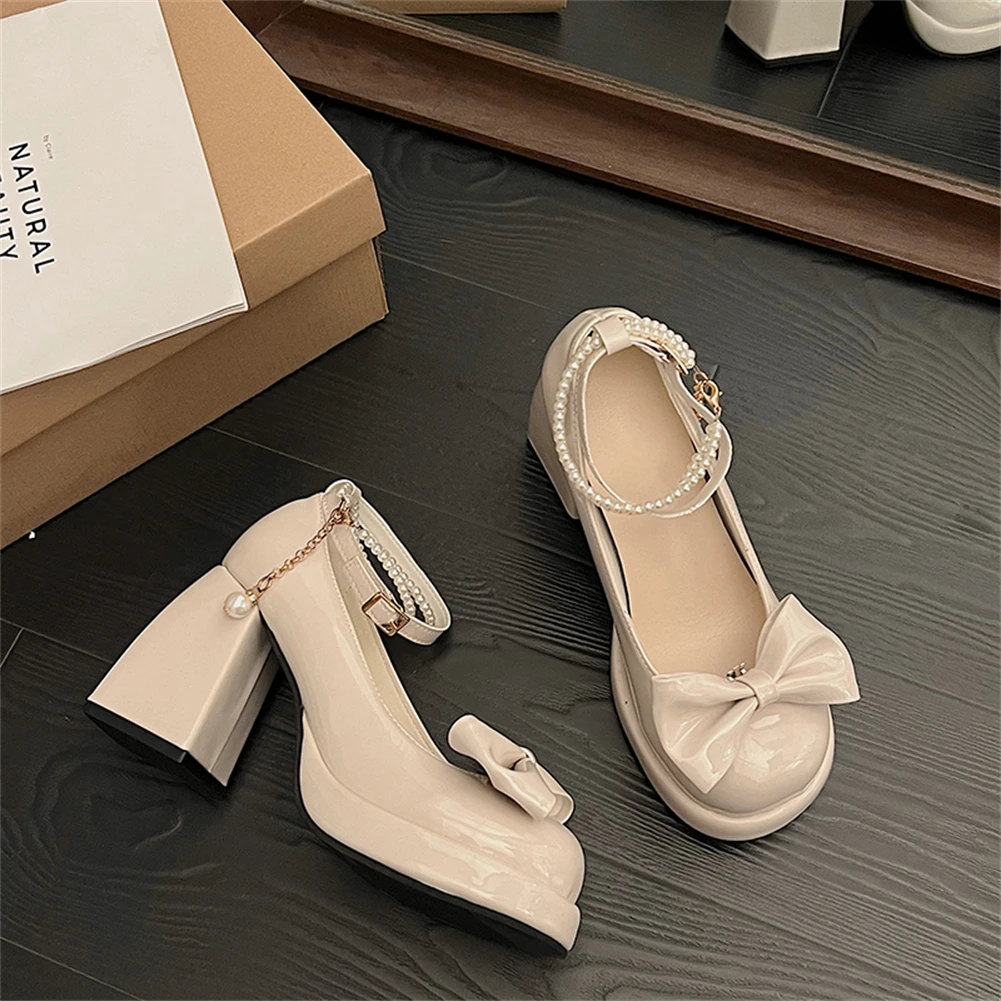 KYLETHOMASW - Women Lolita Bow Bow Decor Pumps Platform Chunky High Heels Ankle Strap Sweet Cute Elegant Pumps For Girl Elegant Shoes