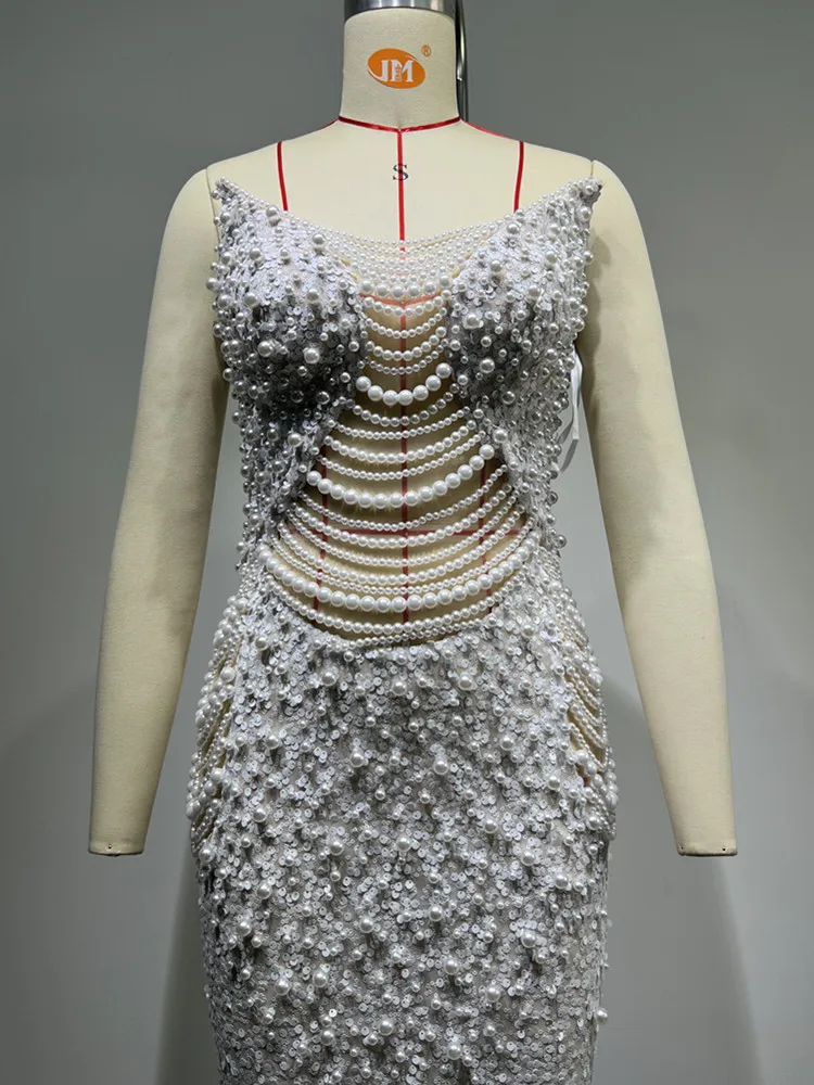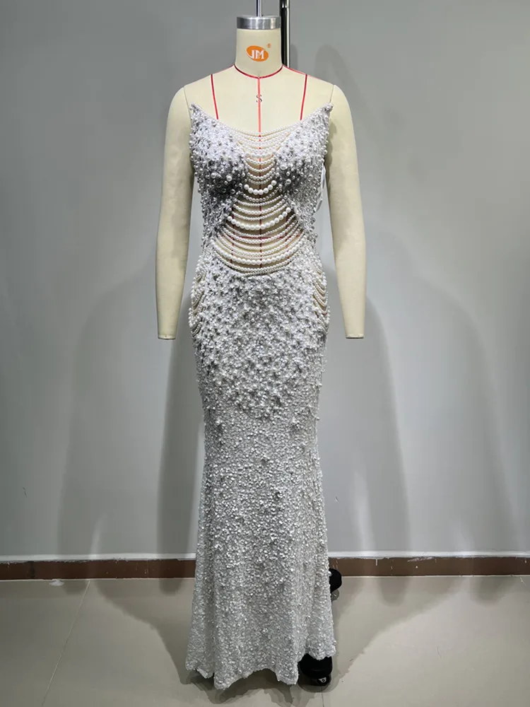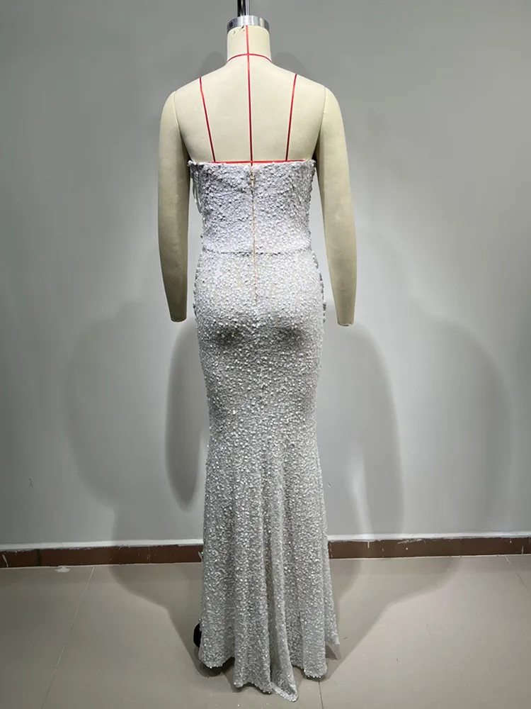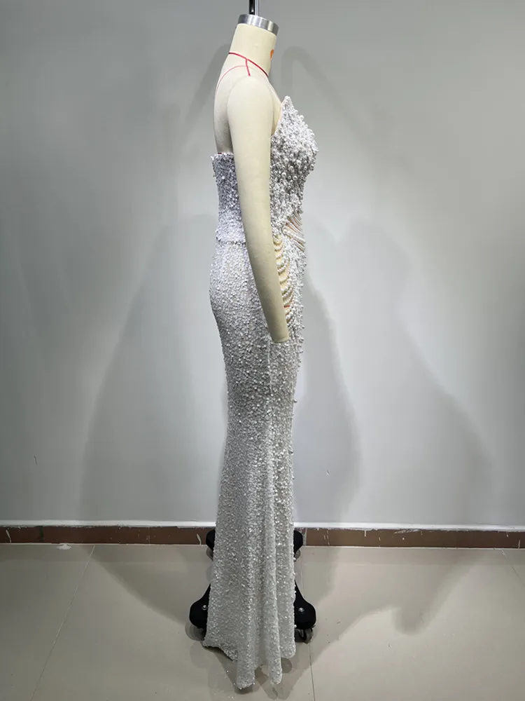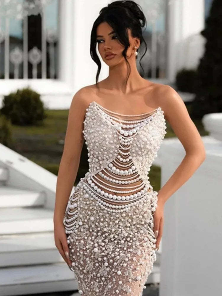 Kylethomasw Women Luxury Sexy Strapless Backless Pearl Sequins Maxi Long Beige Gowns Dress 2024 Elegant Evening Party Club Dress Vestido