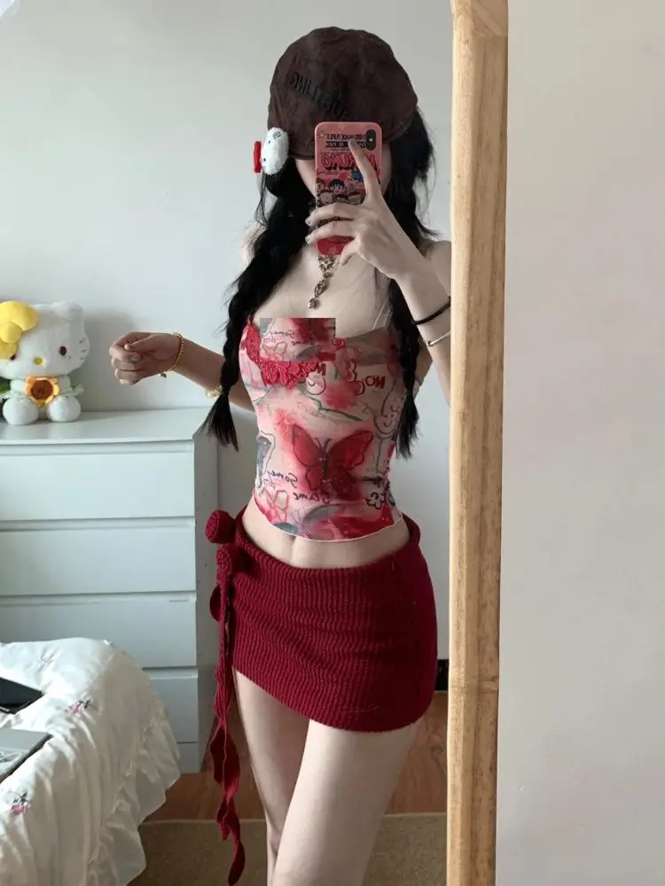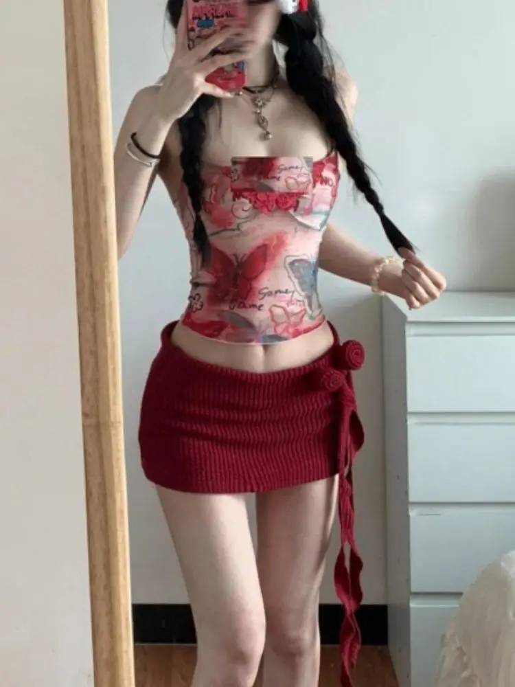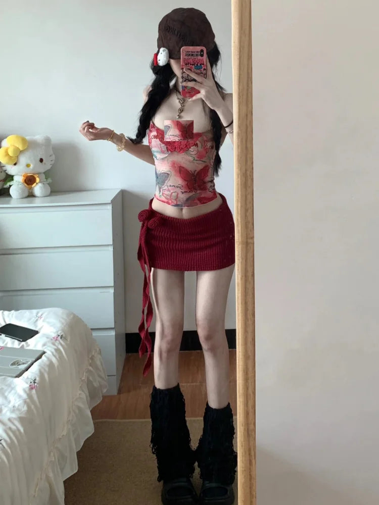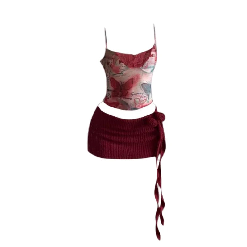 KYLETHOMASW - Women Y2K Two Piece Set Butterfly Print Tube Top and Knitted Side Tie Mini Skirt Slim Fit Suit Sexy Club Summer Street Outfit