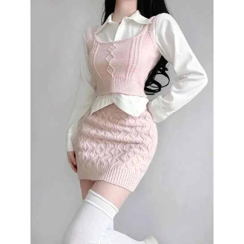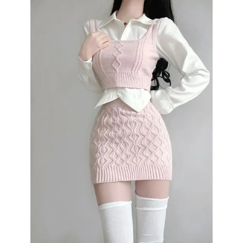 KYLTHOMASW - Sweet Hot Girl Sexy Suit Women's Autumn Knitted Vest White Shirt Wrap Hip Mini Skirt Three-piece Set Fashion Female Clothes