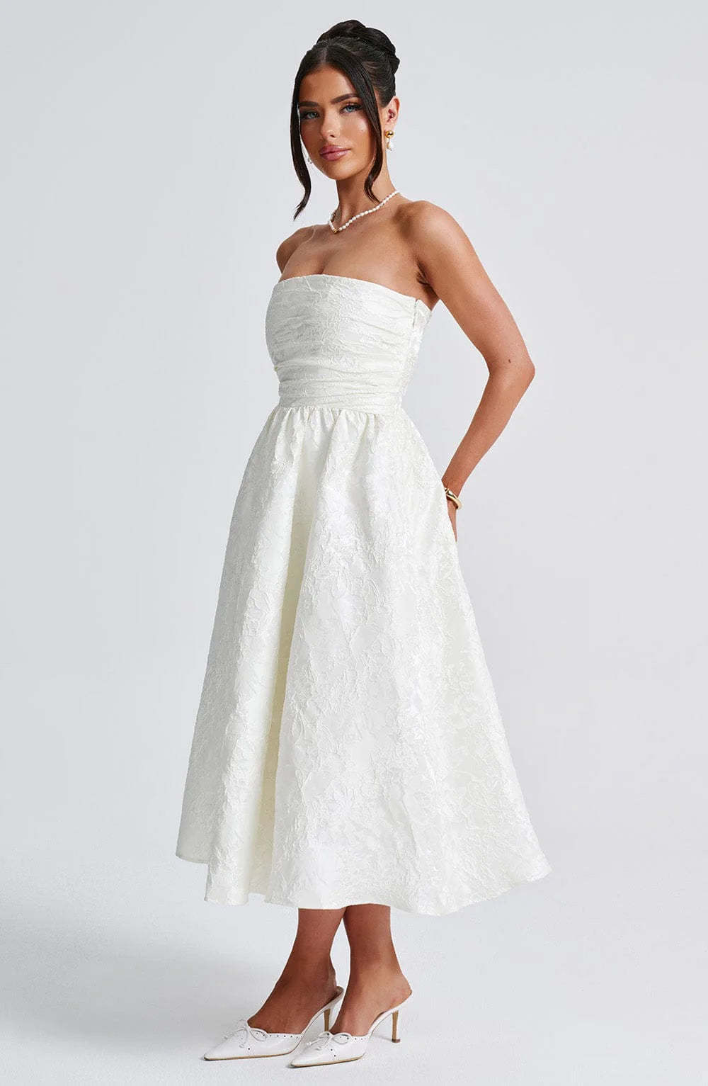 Evoke effortless elegance year-round in this strapless midi, tailored from a delicate floral jacquard that shimmers with every turn. The boned bodice and pleated detailing cinch the waist, while a full tulle-lined skirt floats with graceful volume. A lace-up back adds a hint of vintage charm, perfectly paired with a sleek updo and pointed heels.