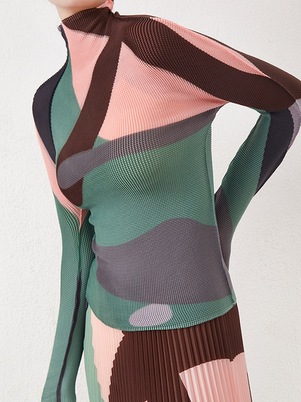 Long Sleeves Contrast Color Pleated Mock Neck T-Shirts Tops