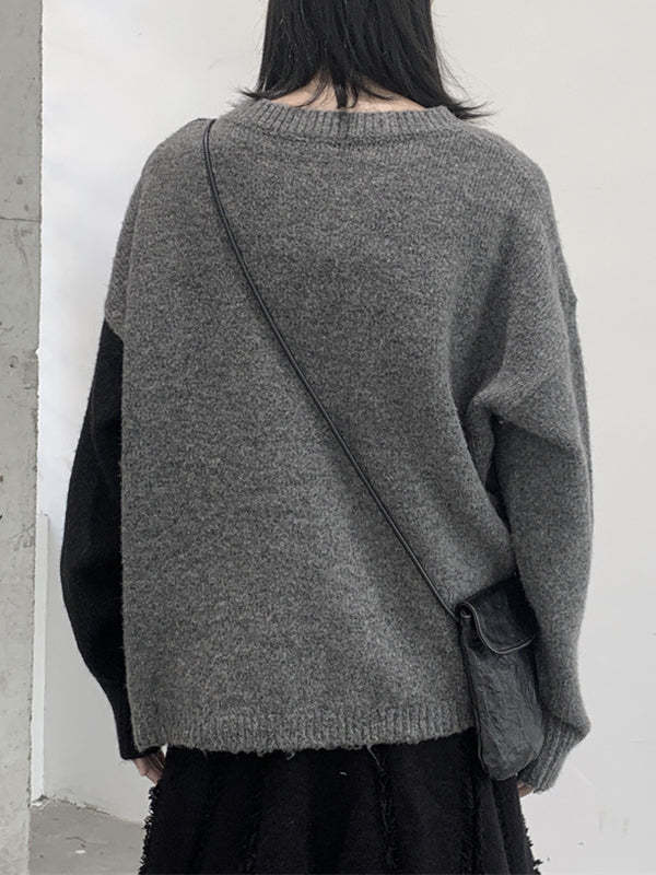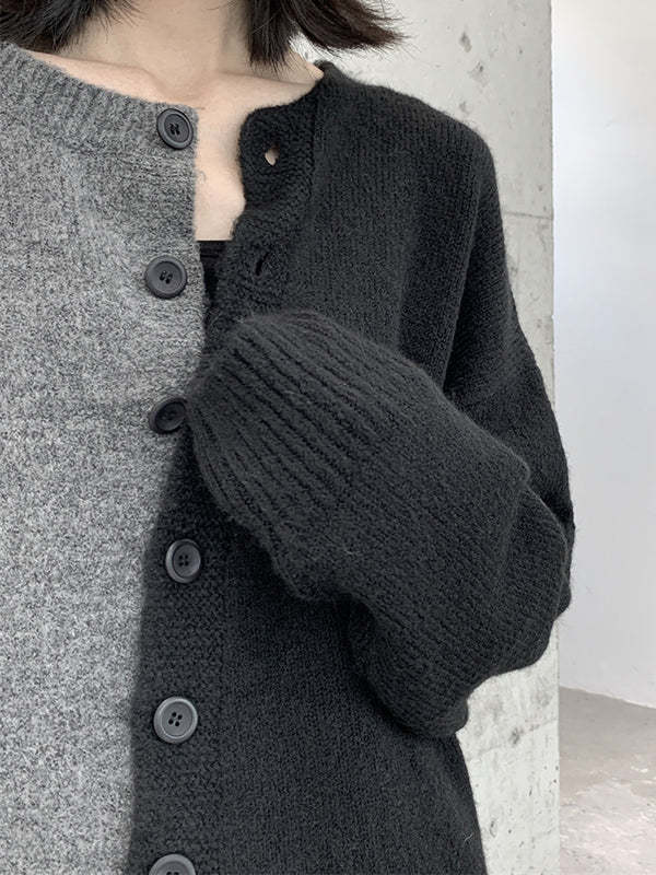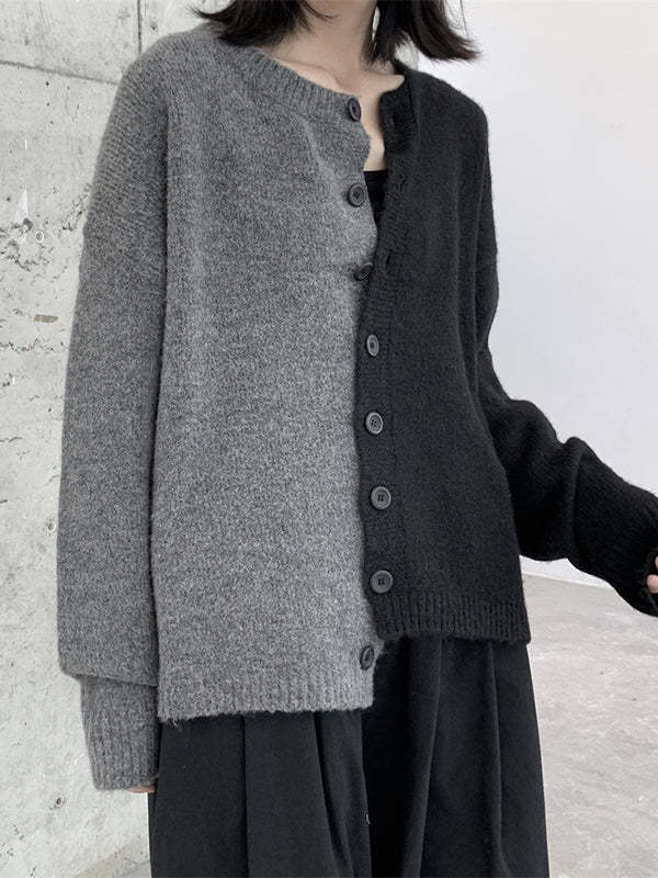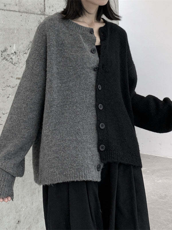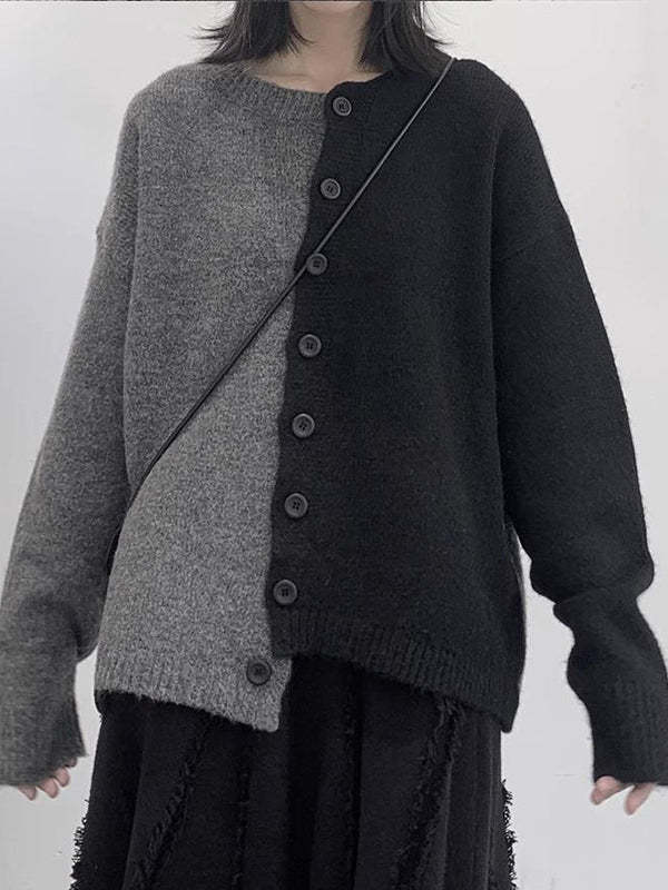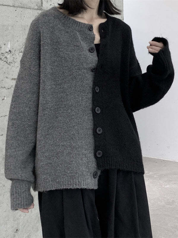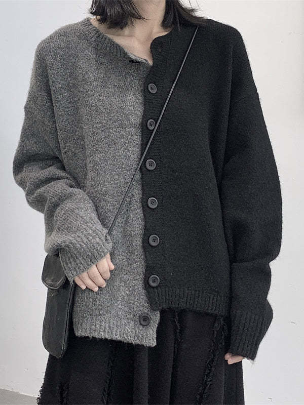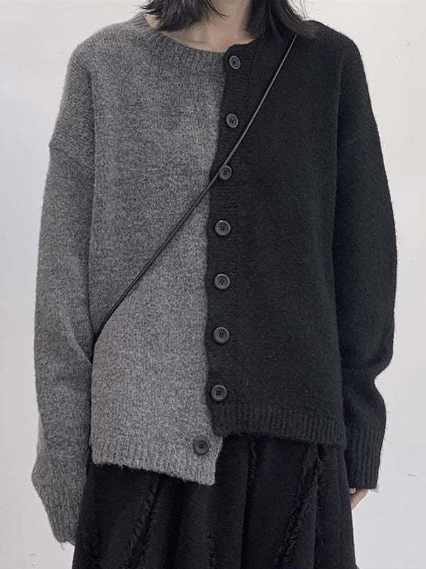 Long Sleeves Loose Asymmetric Buttoned Contrast Color Split-Joint Round-Neck Cardigan Tops
