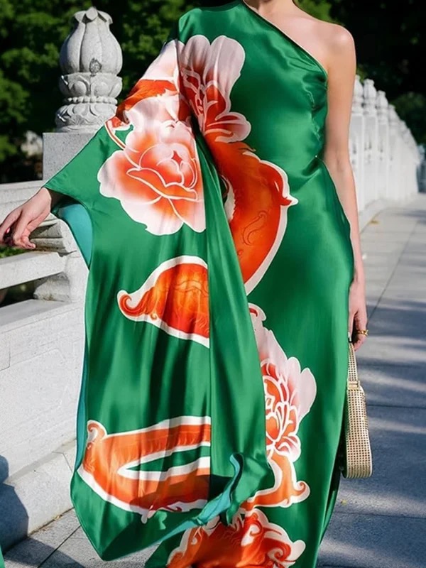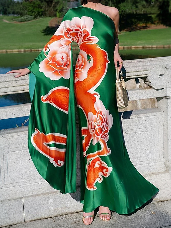 Long Sleeves Loose Asymmetric Flower Print One-Shoulder Maxi Dresses
