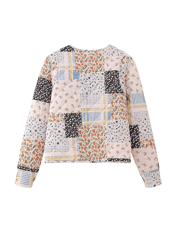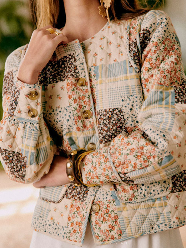 Long Sleeves Loose Buttoned Flower Print Pleated Pockets Quilted Split-Joint Round-Neck Padded Coat