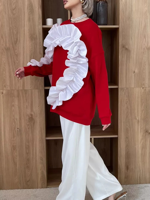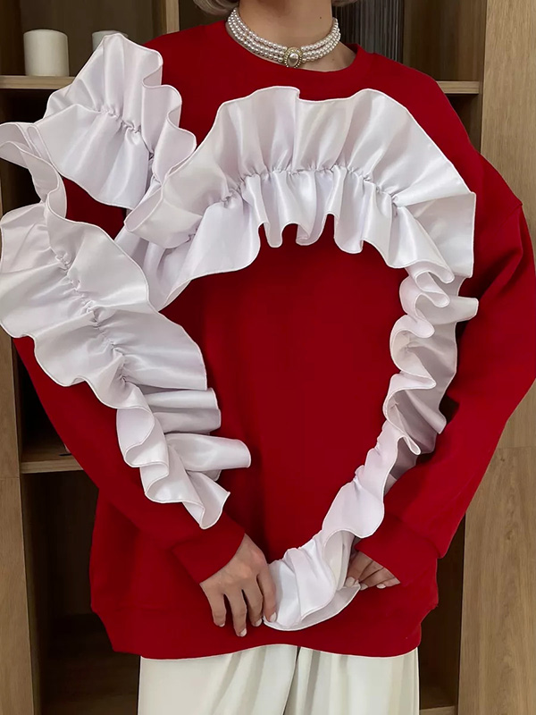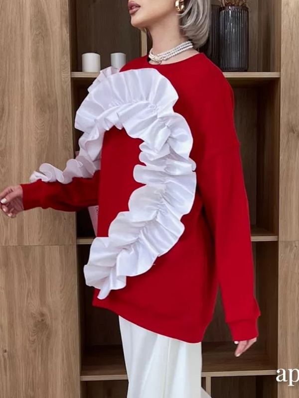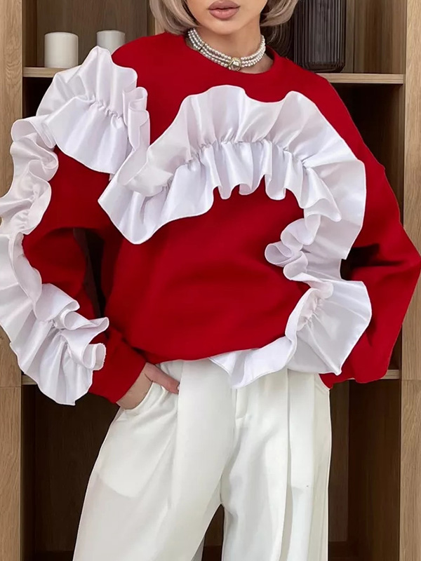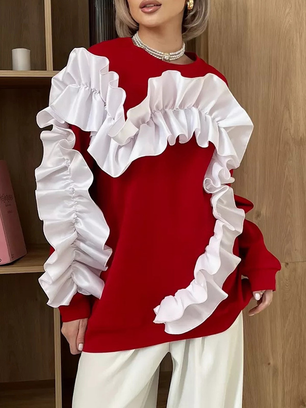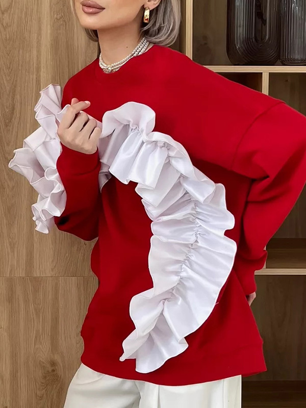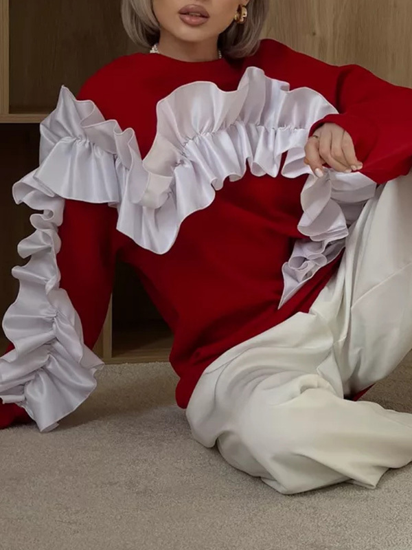 Long Sleeves Loose Contrast Color Ruffle Trim Split-Joint Velvet Round-Neck Sweatshirt Tops