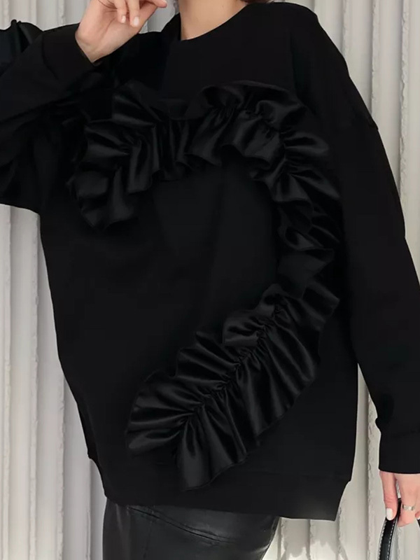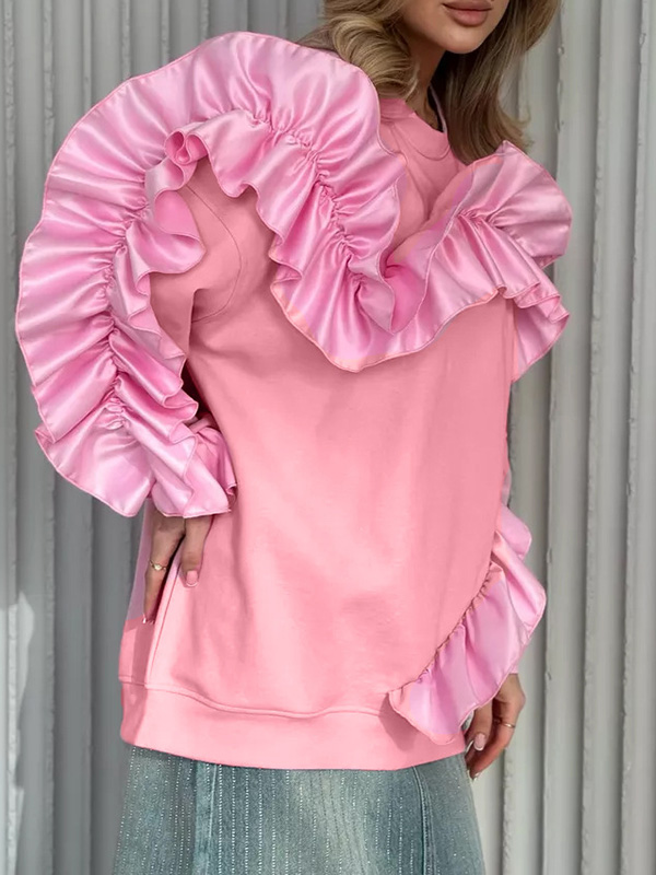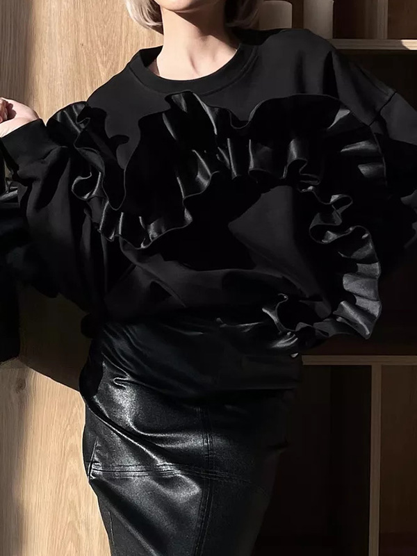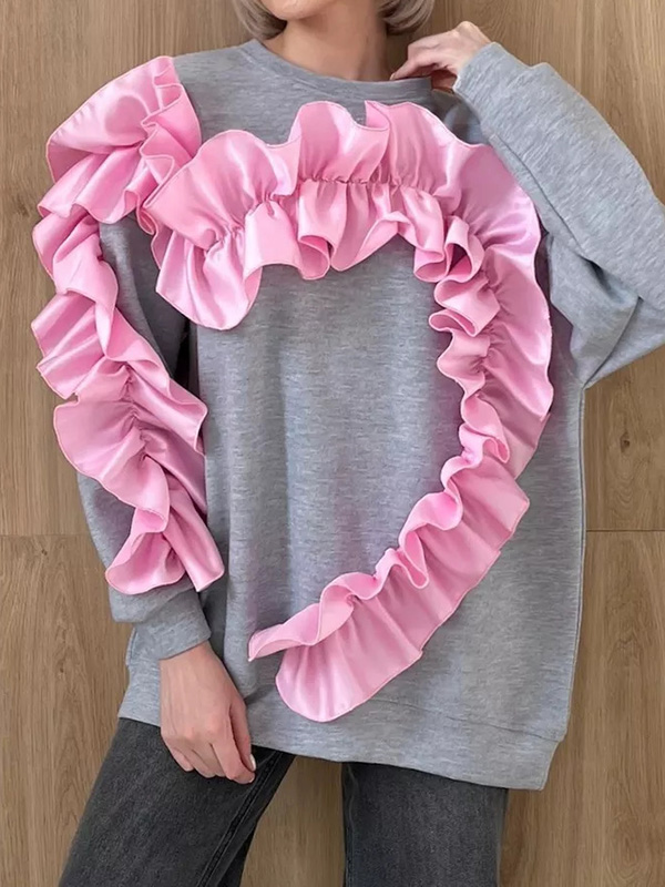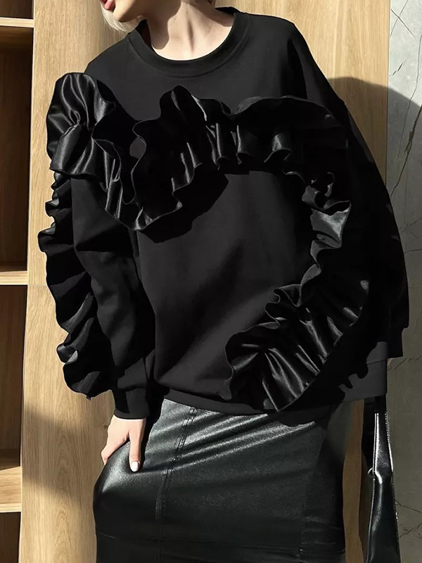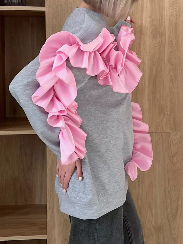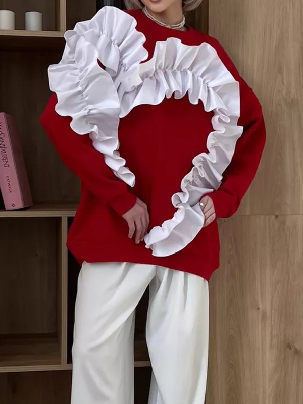 Long Sleeves Loose Contrast Color Ruffle Trim Split-Joint Velvet Round-Neck Sweatshirt Tops