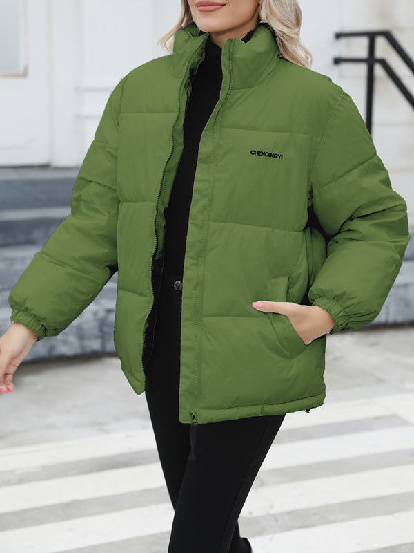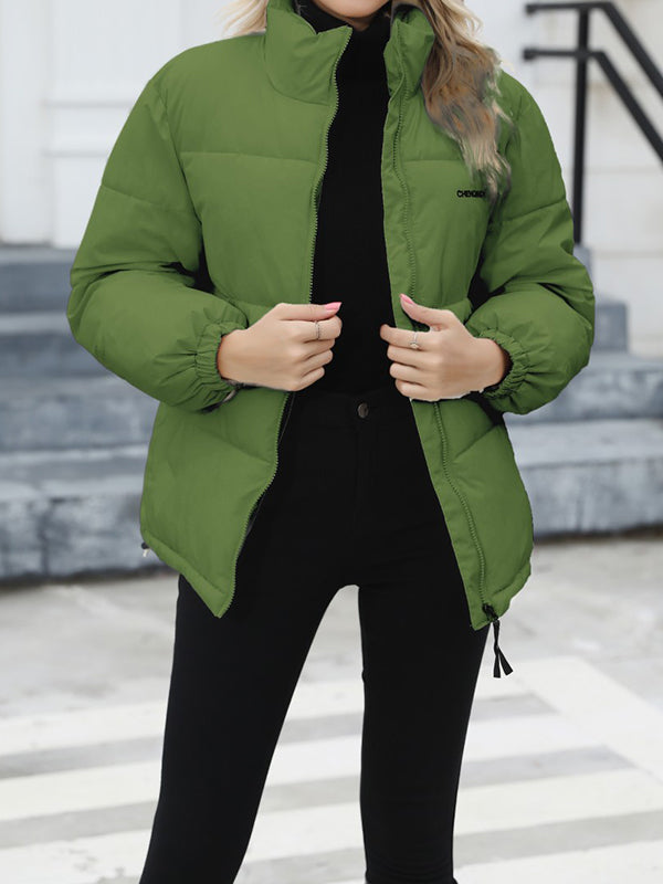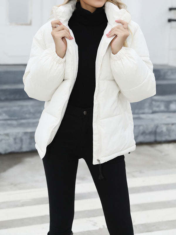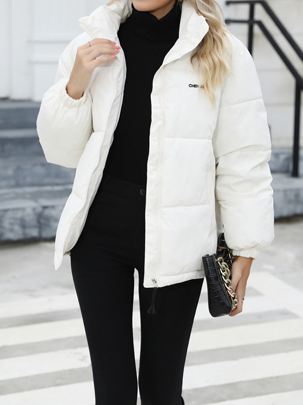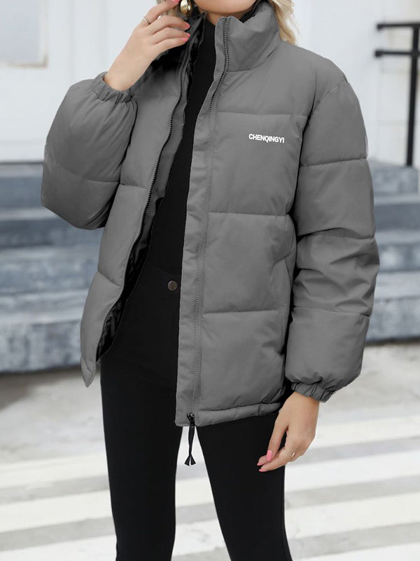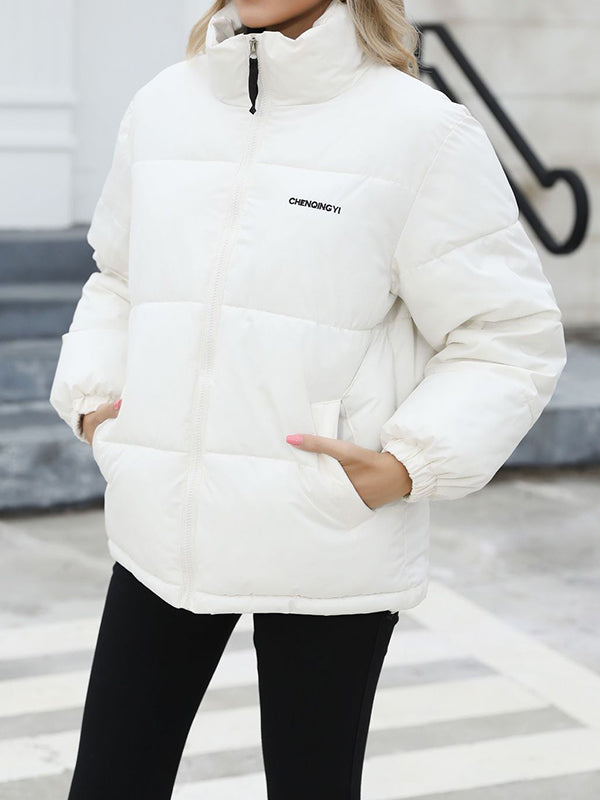 Long Sleeves Loose Keep Warm Quilted Solid Color Zipper High Neck Padded Coat