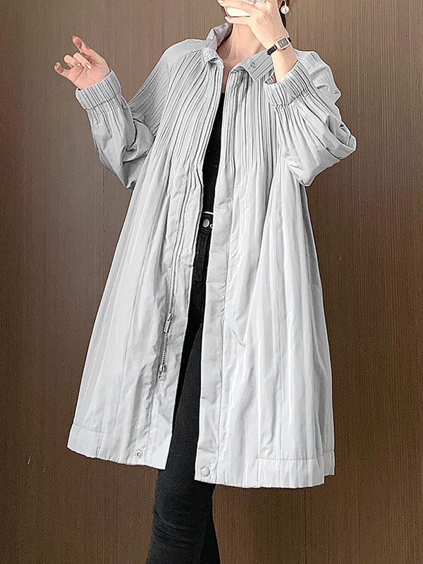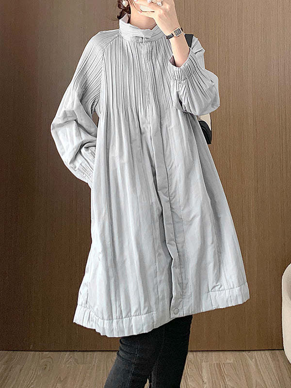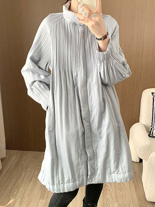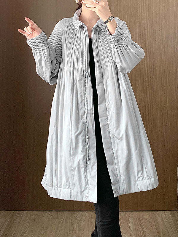 Long Sleeves Loose Pleated Quilted Solid Color Zipper Asymmetric Collar Padded Coat