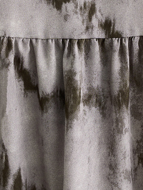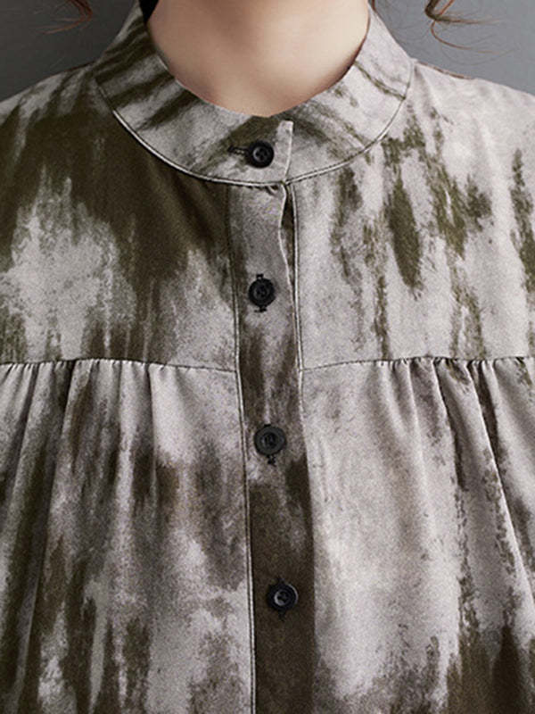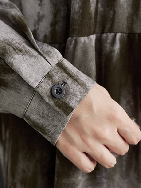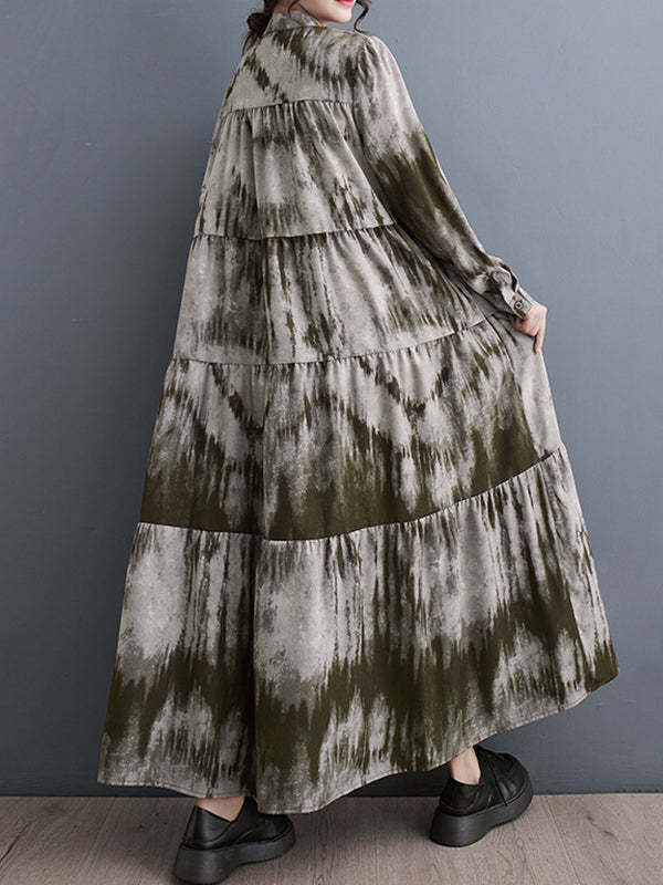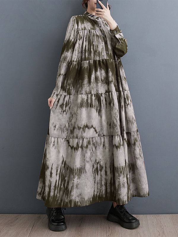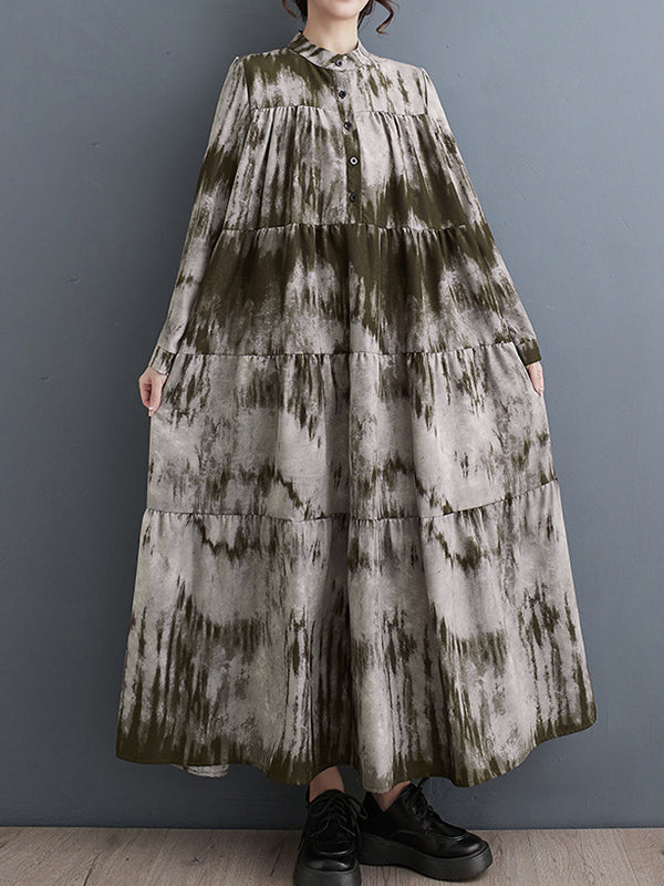 Long Sleeves Loose Pleated Split-Joint Tie-Dyed Stand Collar Midi Dresses