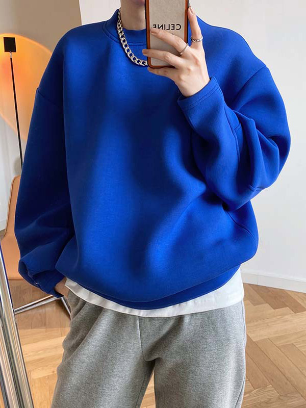 Long Sleeves Loose Solid Color Round-Neck Sweatshirt Tops