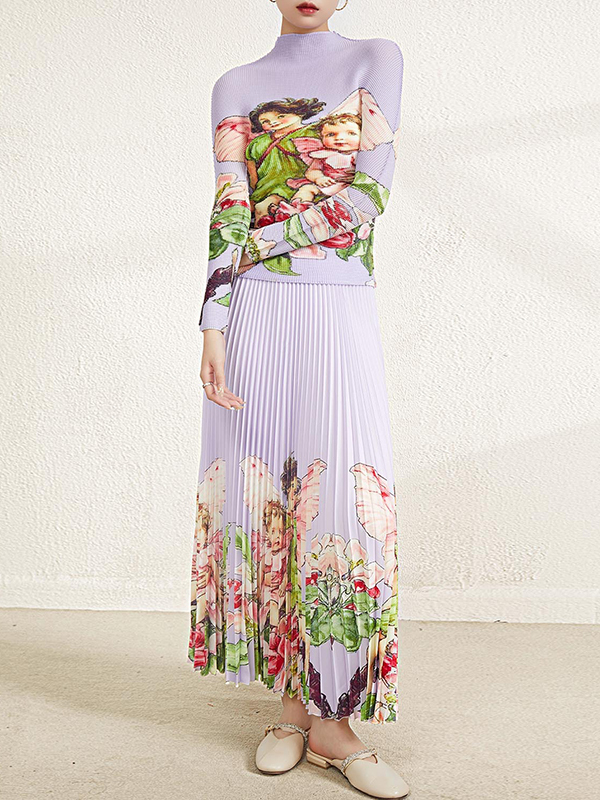 Long Sleeves Printed Mock Neck T-Shirt Top + Pleated A-Line Skirts Bottom Two Pieces Set