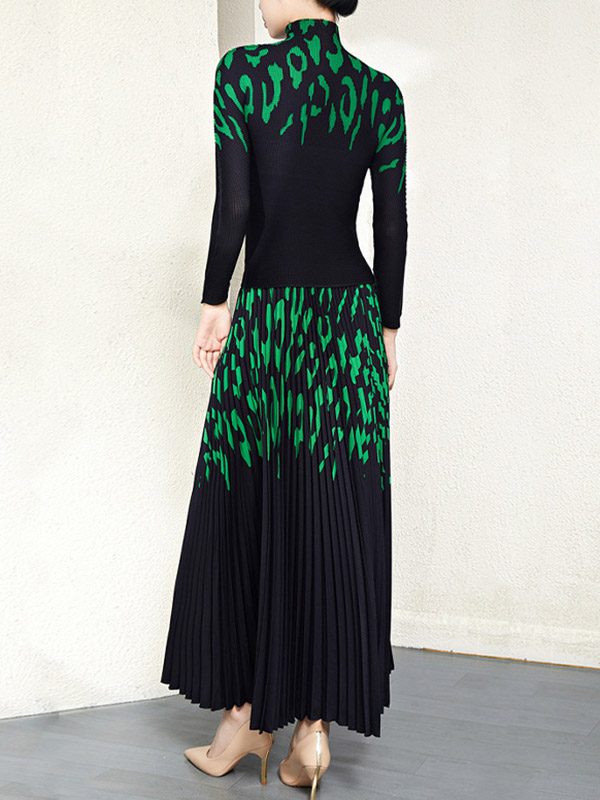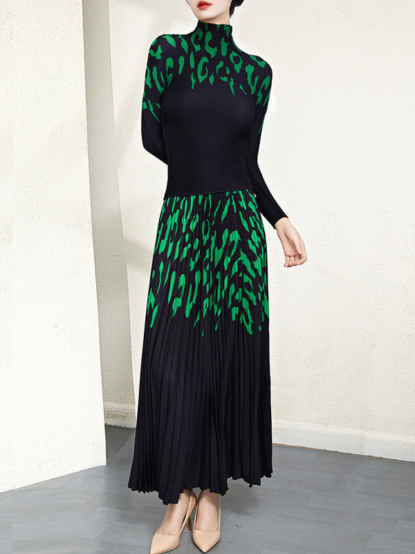 Long Sleeves Printed Mock Neck T-Shirt Top + Pleated A-Line Skirts Bottom Two Pieces Set