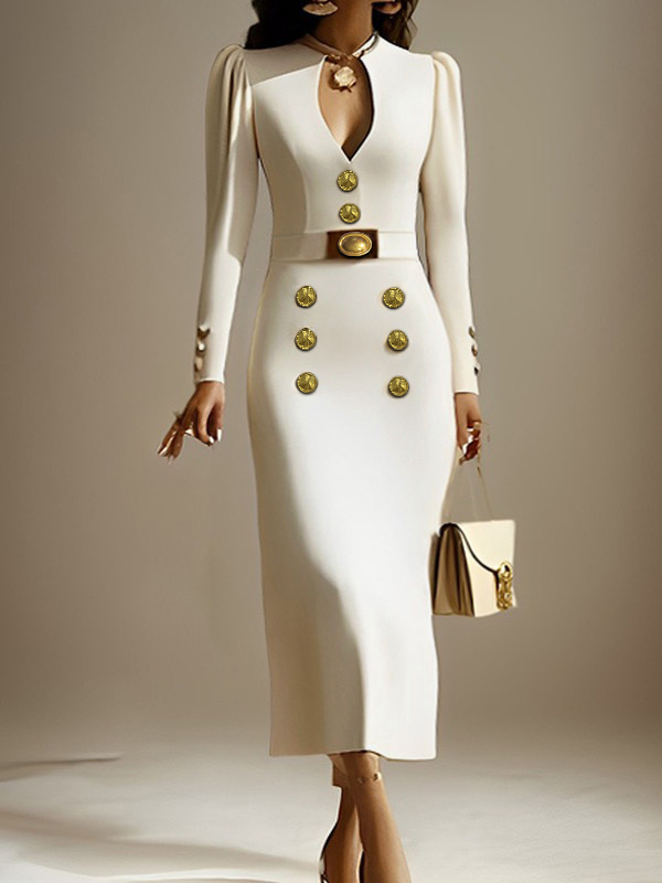 Long Sleeves Puff Sleeves Buttoned Solid Color Deep V-Neck Midi Dresses