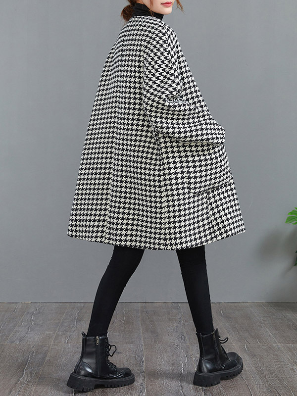 Loose Houndstooth Buttoned Round-Neck Long Sleeves Woolen Coat