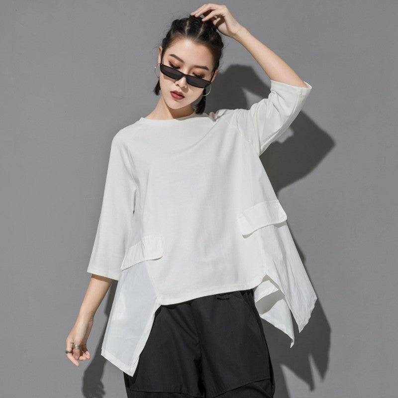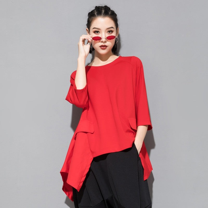 Stay comfortable and stylish with this Loose Irregular Batwing Short Sleeve T-Shirt. The unique design and relaxed fit make it a versatile piece for any casual wardrobe. Perfect for a laid-back and effortlessly chic look.