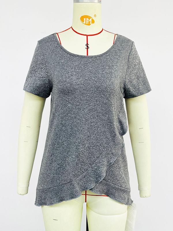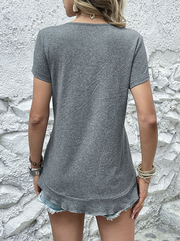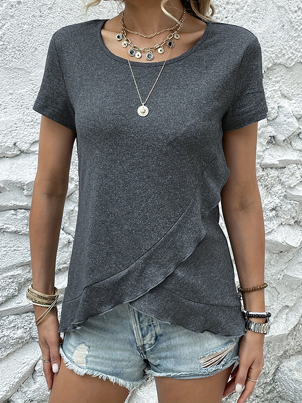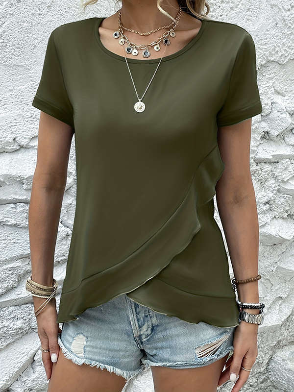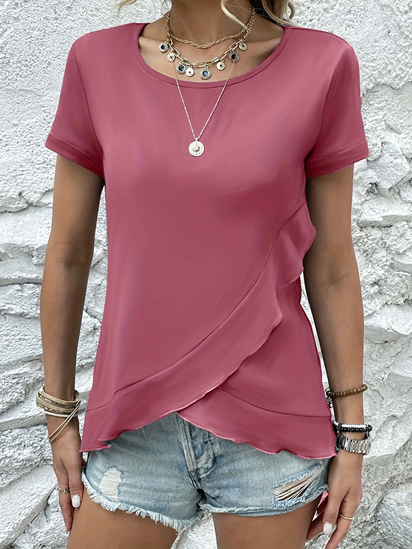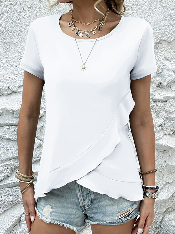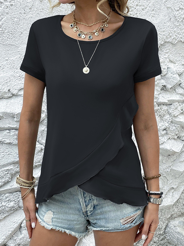 Loose Short Sleeves Asymmetric Ruffled Solid Color Split-Joint Round-Neck T-Shirts Tops