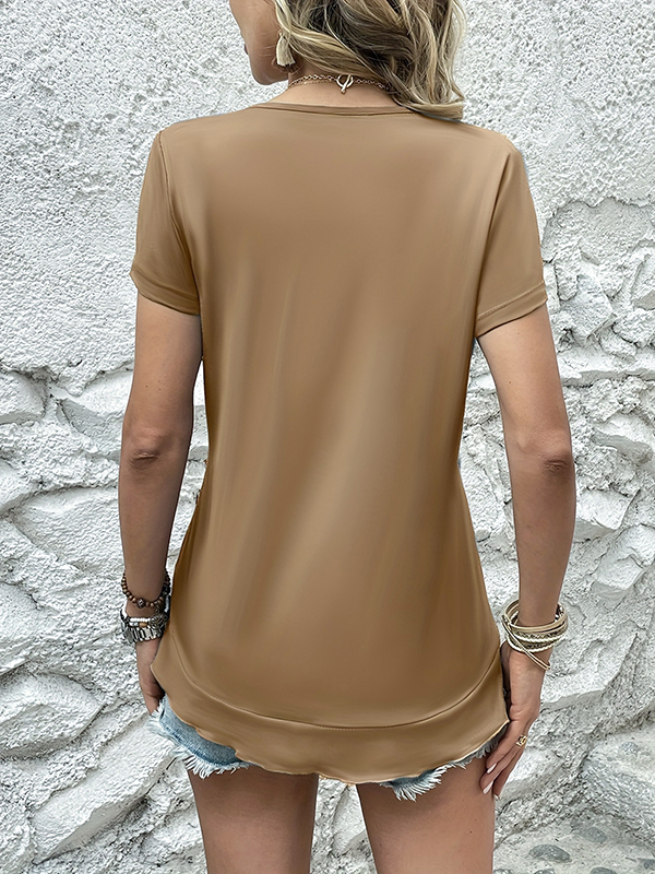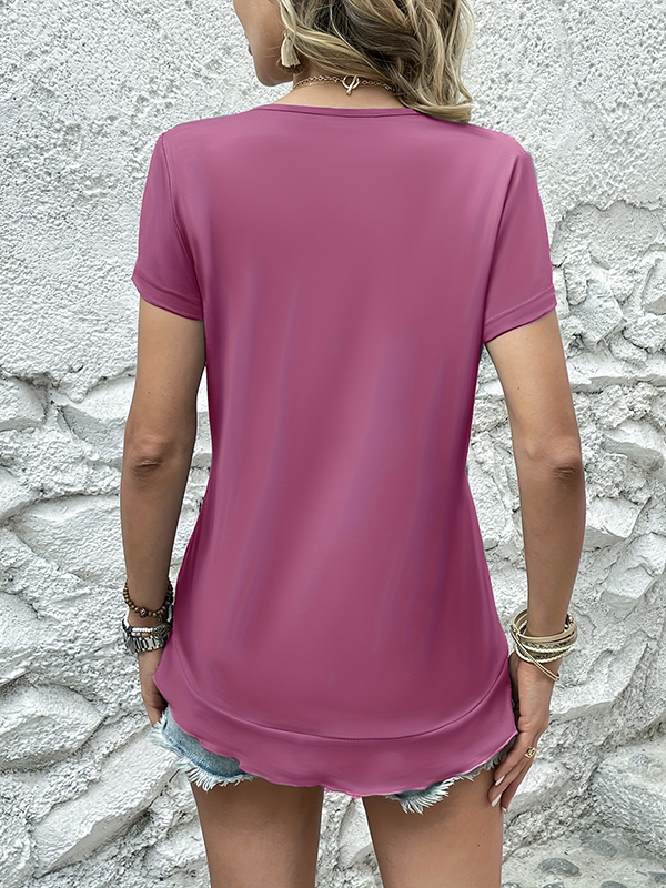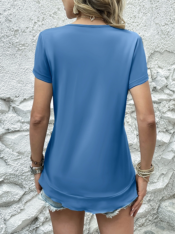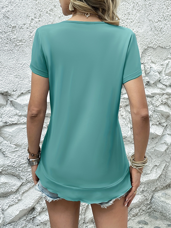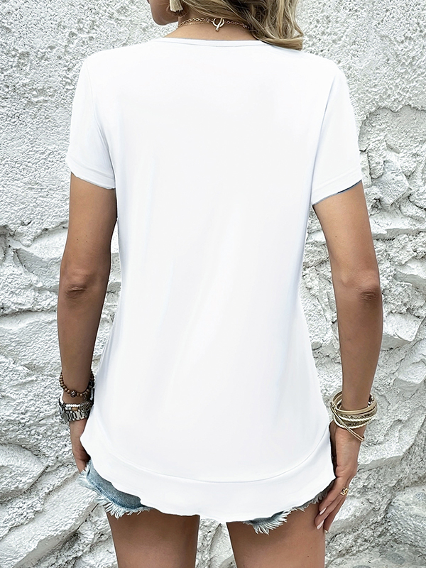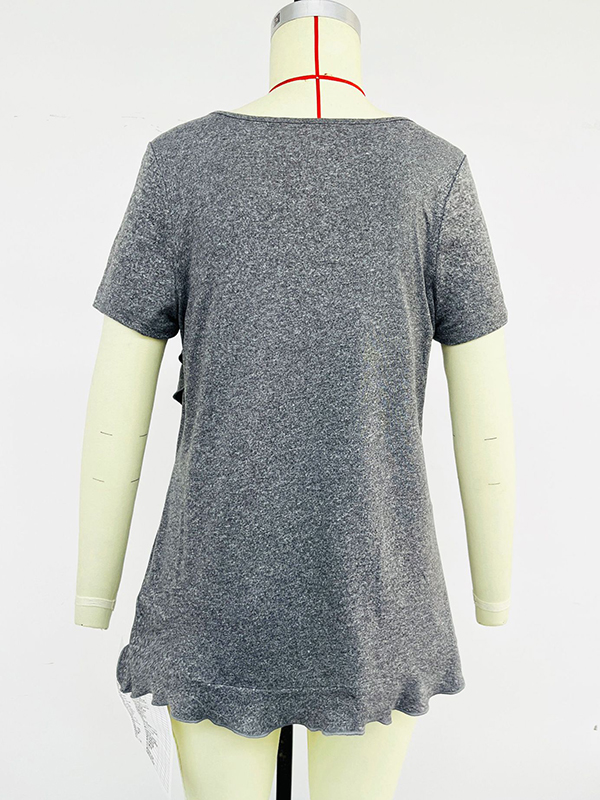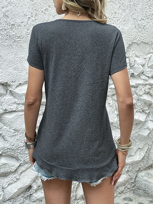 Loose Short Sleeves Asymmetric Ruffled Solid Color Split-Joint Round-Neck T-Shirts Tops