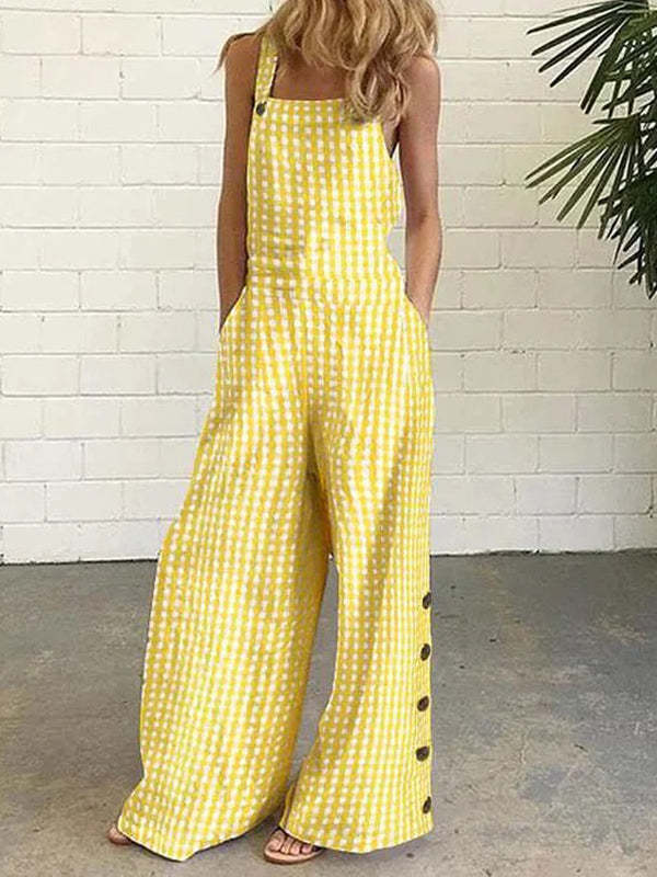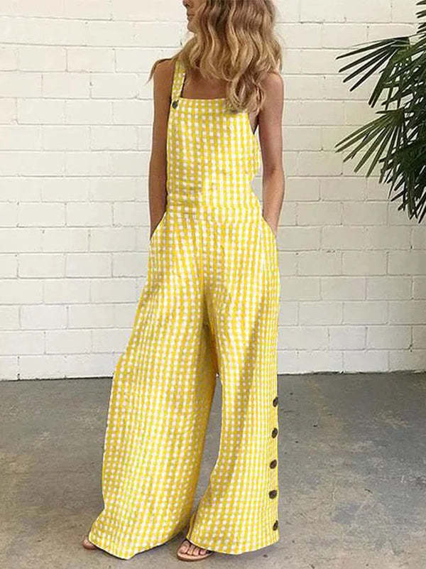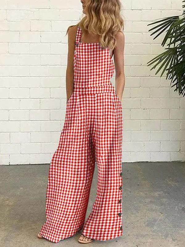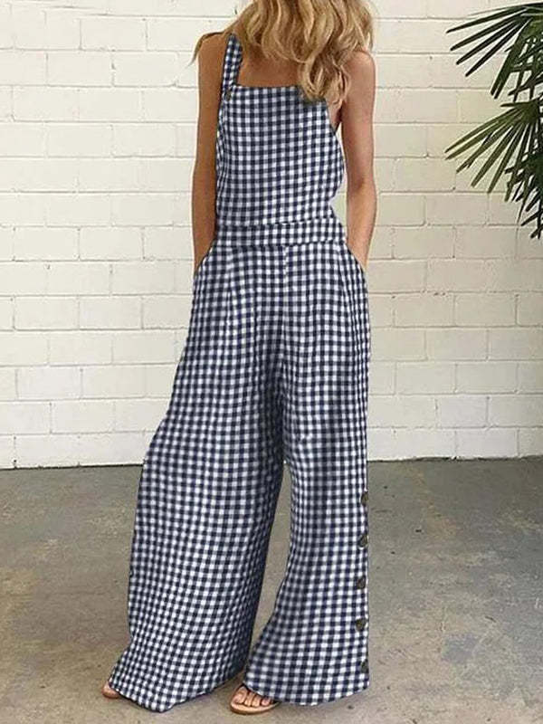 Loose Sleeveless Buttoned Plaid Pockets Collarless Overalls