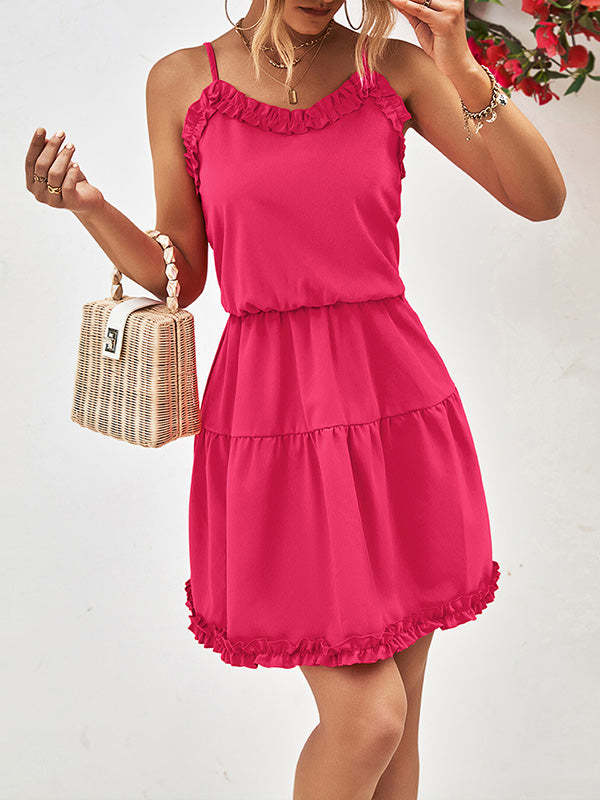Loose Sleeveless Falbala Solid Color Spaghetti-Neck Mini Dresses