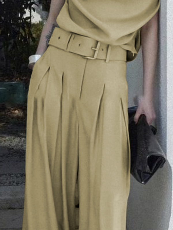 Loose Wide Leg Belted Pleated Solid Color Casual Pants Bottoms