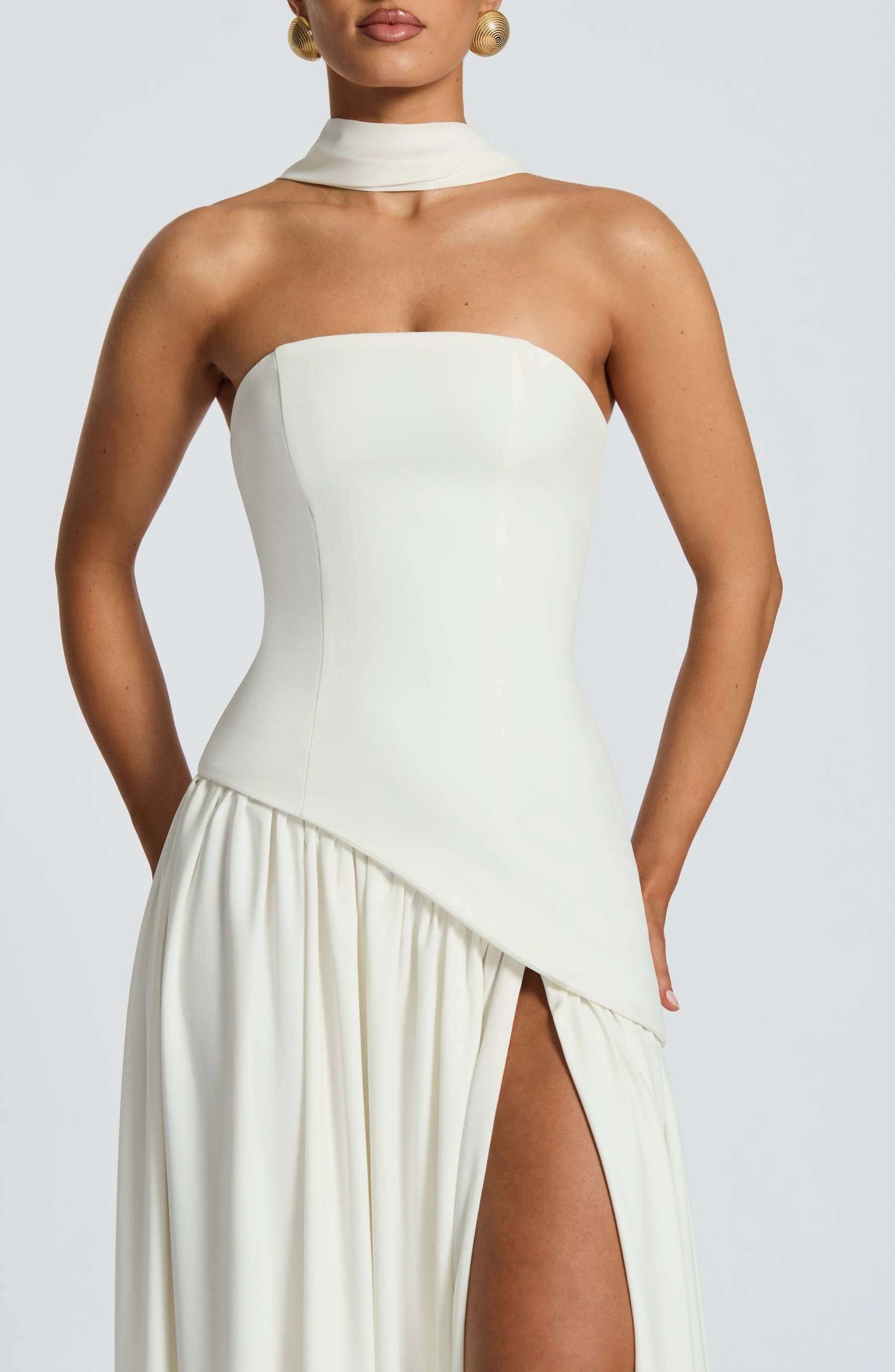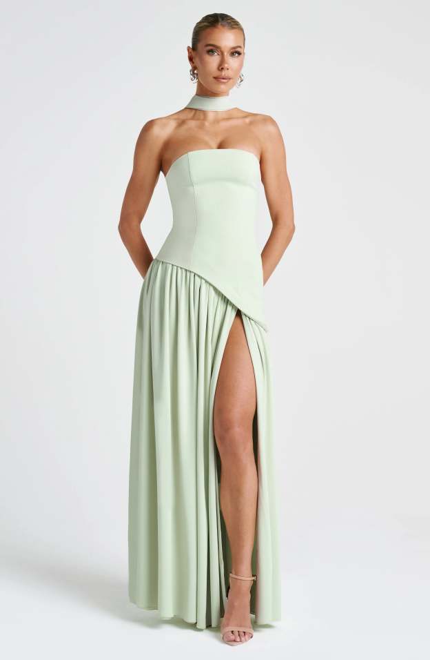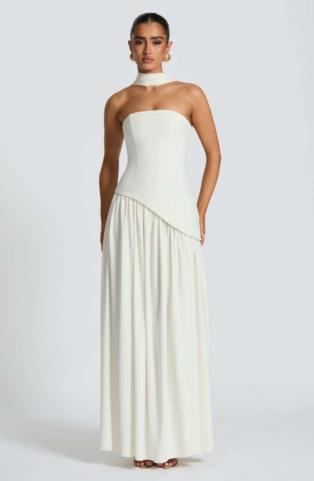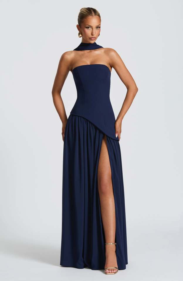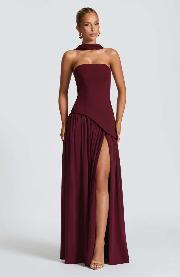 Step into sophistication with the Maia Strapless Maxi Dress, a striking blend of structure and fluidity. Designed with a sculpted strapless bodice featuring an asymmetrical hem, this dress balances bold tailoring with soft, flowing movement. The contrast chiffon skirt drapes effortlessly, creating a graceful silhouette, while a thigh-high split adds just the right touch of allure.